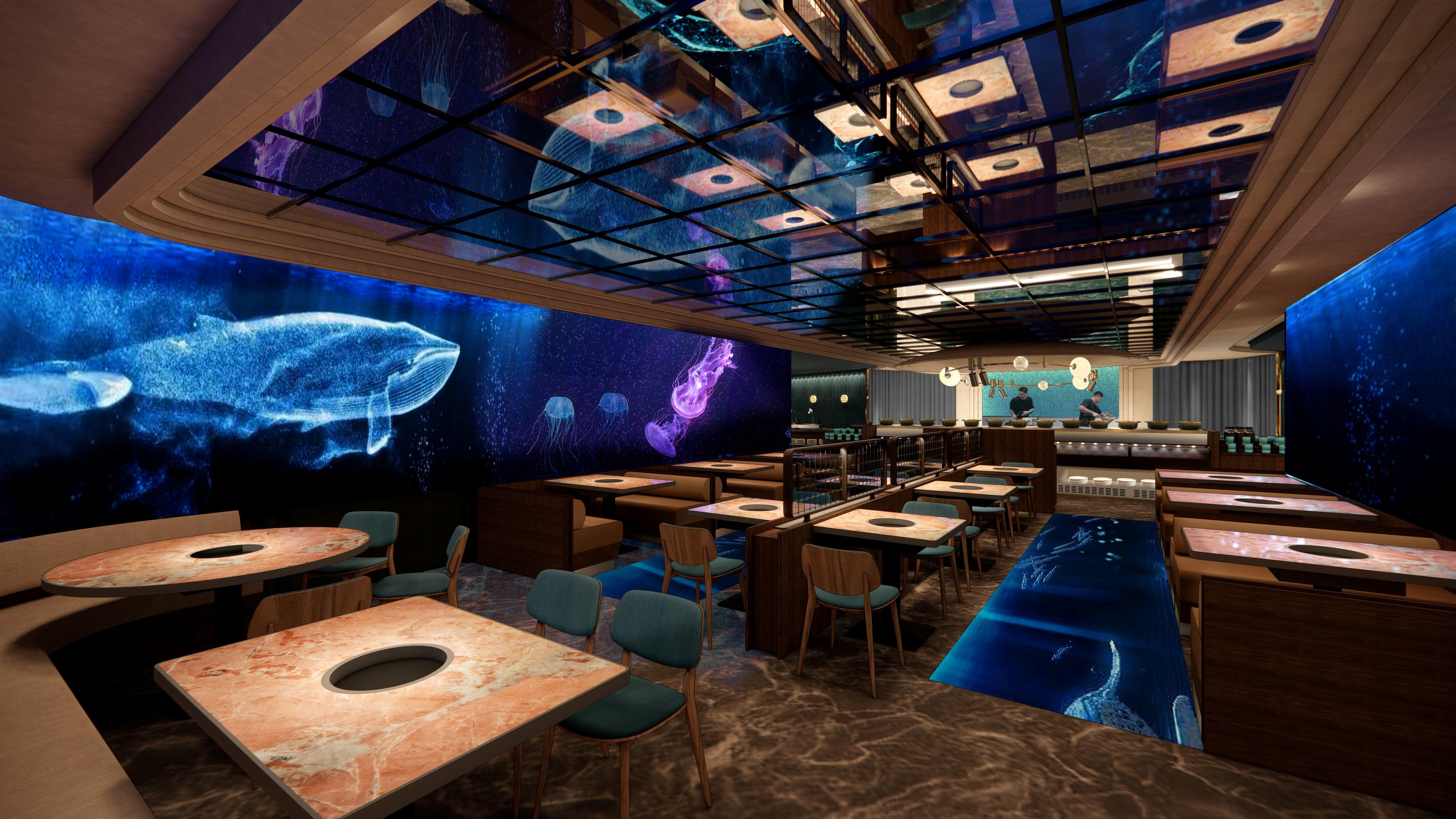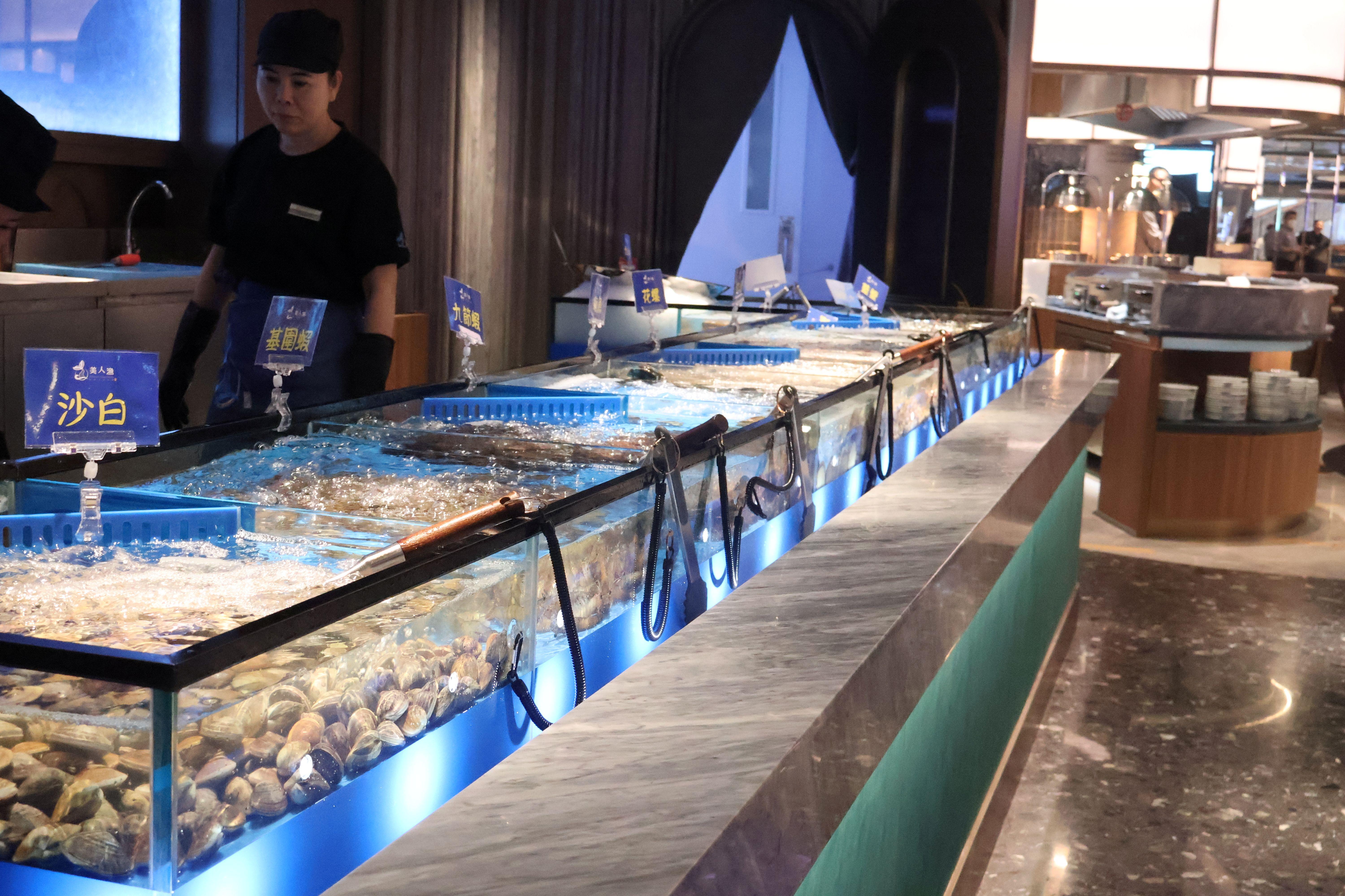 最新開業的即撈海鮮火鍋放題店「美人漁」佔地過萬呎,裝修以沉浸式投影與環迴聲效系統構築出動態的「海洋劇場」,可以邊食邊打卡!現場分別設有四個主題自助區,包括活海鮮區、燒烤熱葷區、自家製環球美食區及香港特色甜品區。來店重點一定是活海鮮區,每日搜羅超過10多款新鮮活海產供食客即撈即食,更有專人清洗及處理顧客所撈的海鮮,包括紅蟹、大頭蝦、九節蝦、小蟶子、鮑魚及紐西蘭活青口等,回本必食。