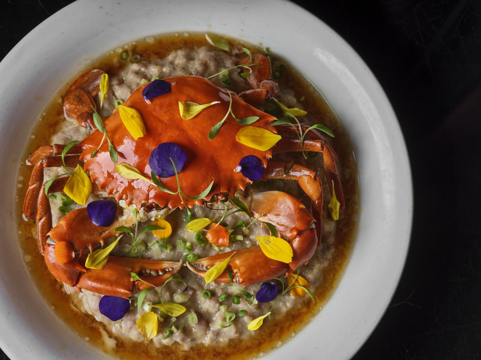 橫行抱玉,橫行意指螃蟹,蟹乃張師傅最愛的海鮮,而當蟹結合「名廚」的招牌菜蒸豬頸肉之時,某程度上有點像西餐「海陸套餐」的概念,但鮮美卻更猶勝一籌。將膏蟹與豬頸肉一同用紹興酒及醬油蒸煮,蒸煮過程帶出膏蟹的鮮味,亦將鮮美滋味融入柔軟爽彈的豬頸肉裡,表面灑上薑蔥粒,令橙紅色的鮮甜蟹膏份外誘人。