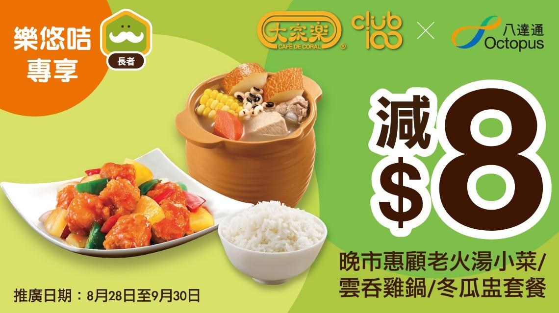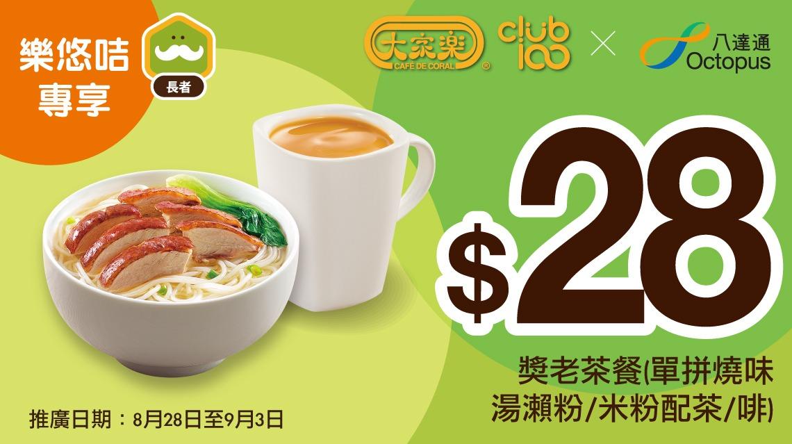 另外大家樂同步推出「樂悠咭專享」會員限定禮遇,由 8月28日至9月30日,長者會員只需要到大家樂以樂悠咭付款,即可享用至抵優惠,包括「$1 奶茶」、「$2.8 咖啡」、「減$2.8 優惠券」、「$28 樂悠茶餐」及「指定套餐減$8 優惠券」,長者會員記得唔好錯過!