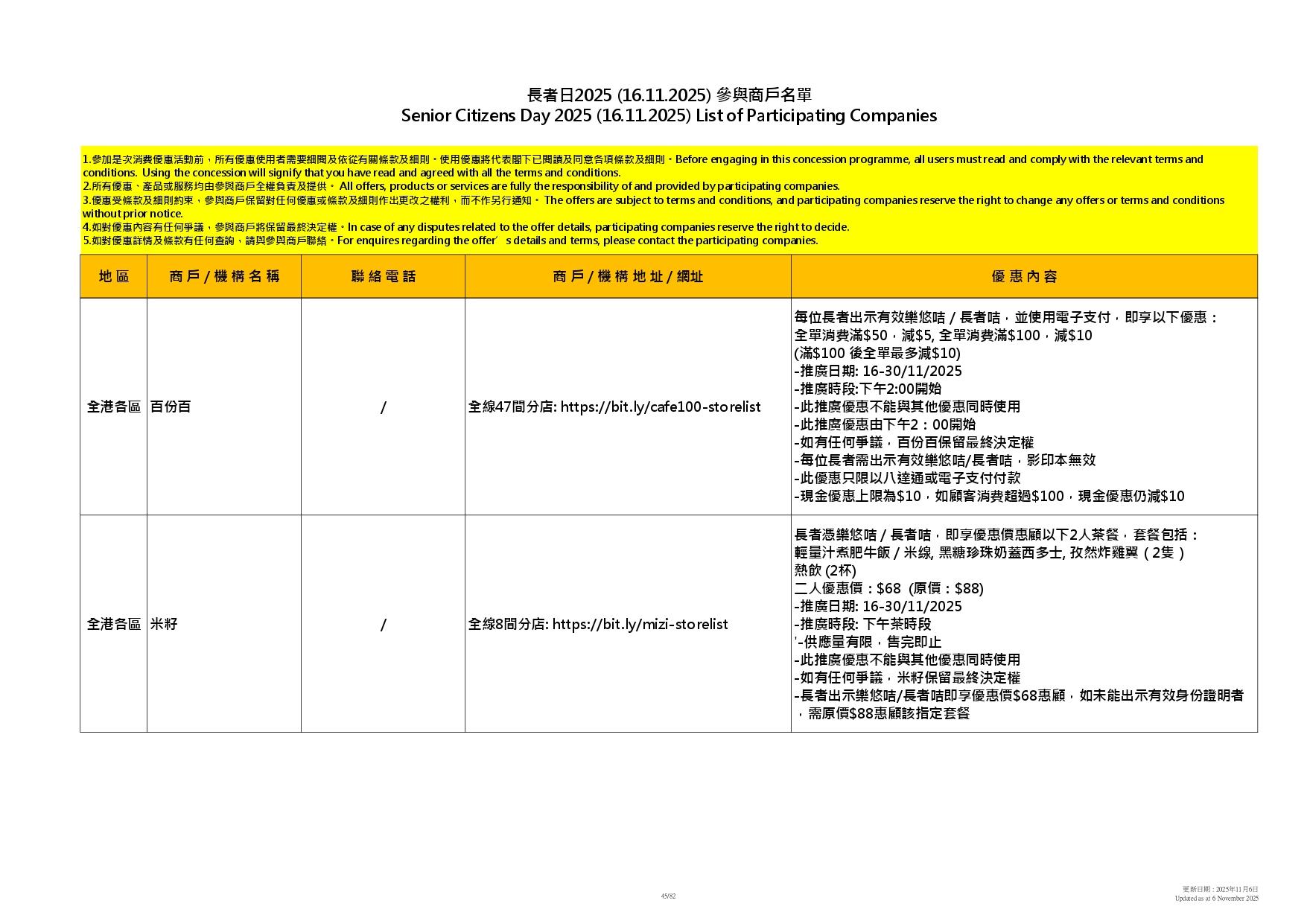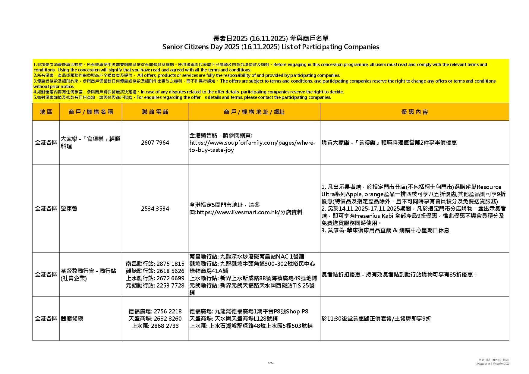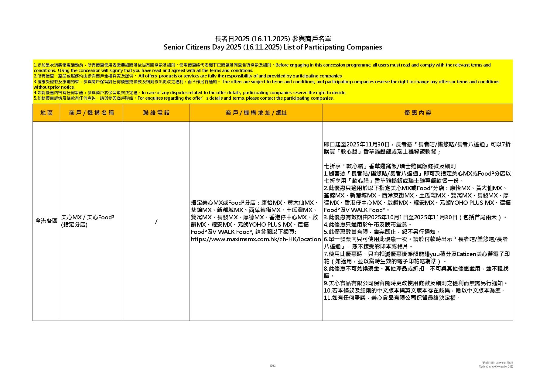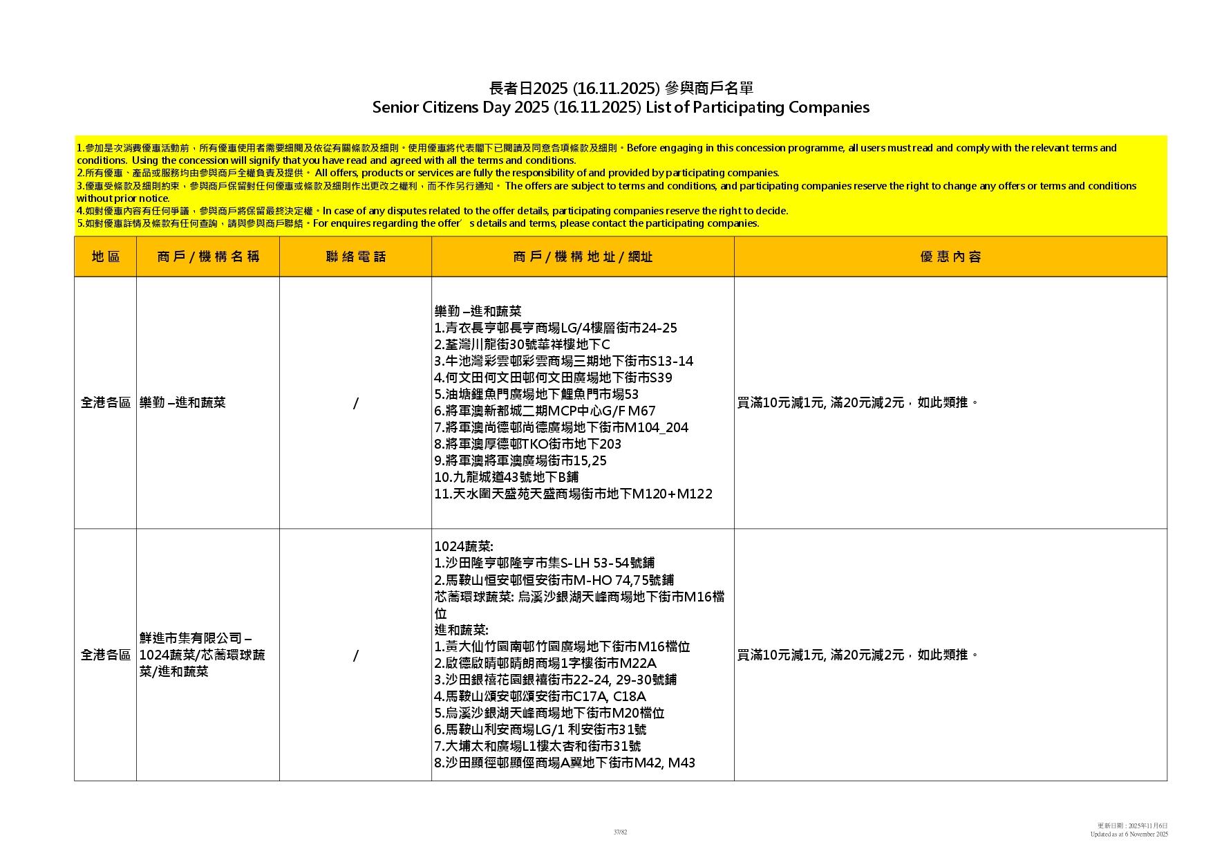 11月16日至11月30日期,每日下午14:00起,長者出示有效樂悠咭/長者咭,並使用電子支付,即享全單消費滿$50減$5;全單消費滿$100減$10(滿$100後全單最多減$10)。