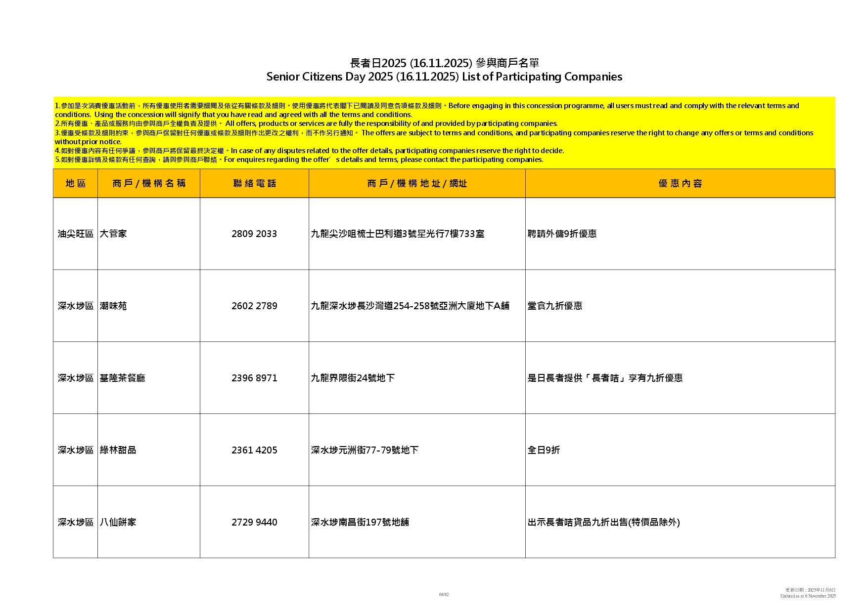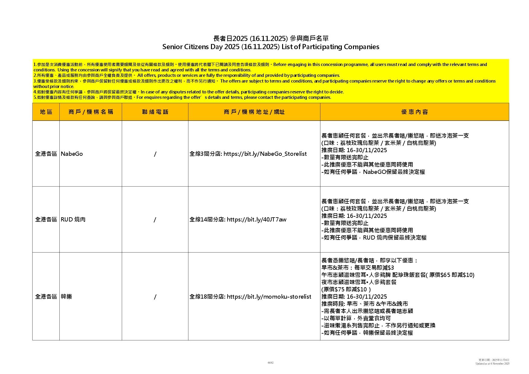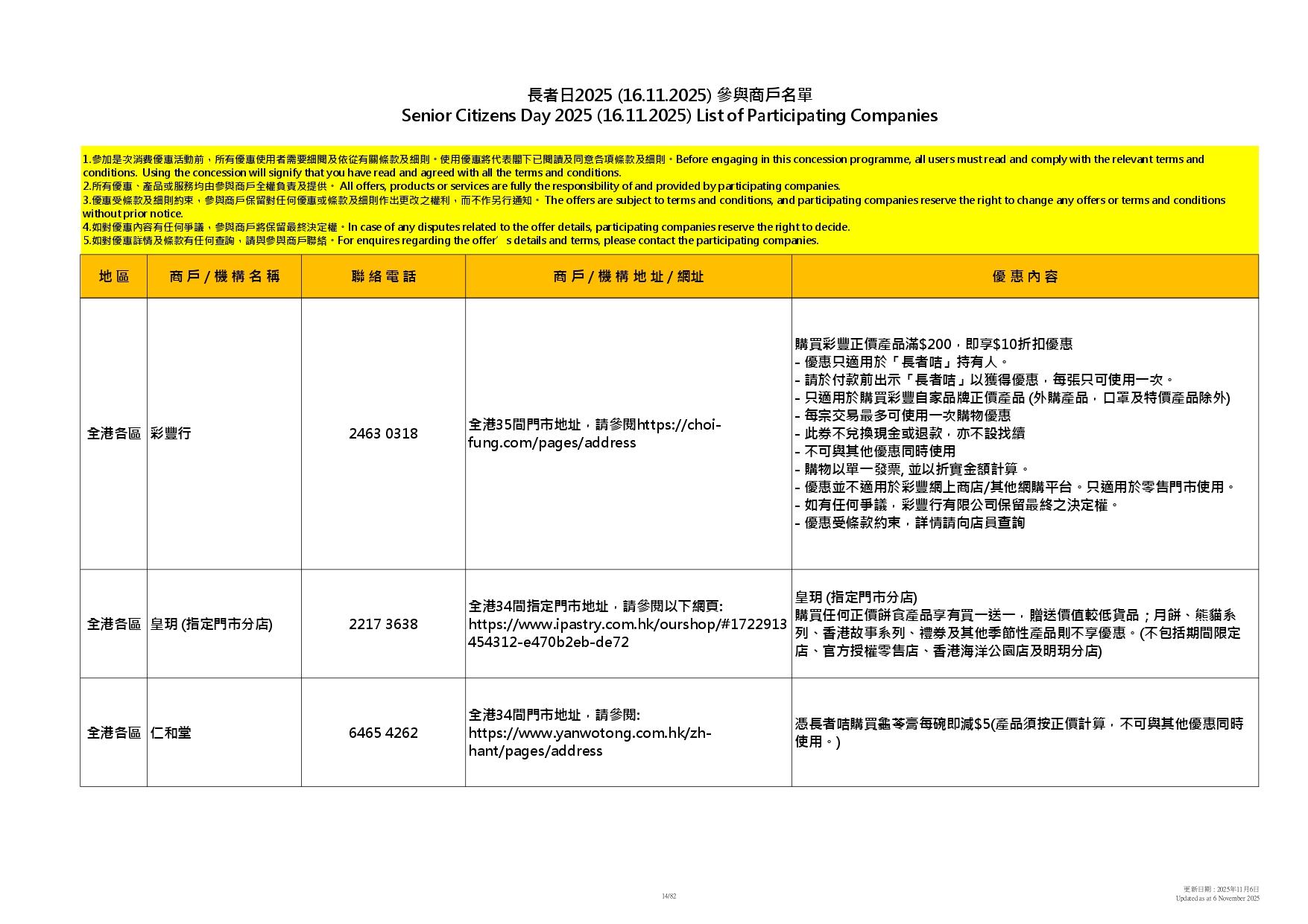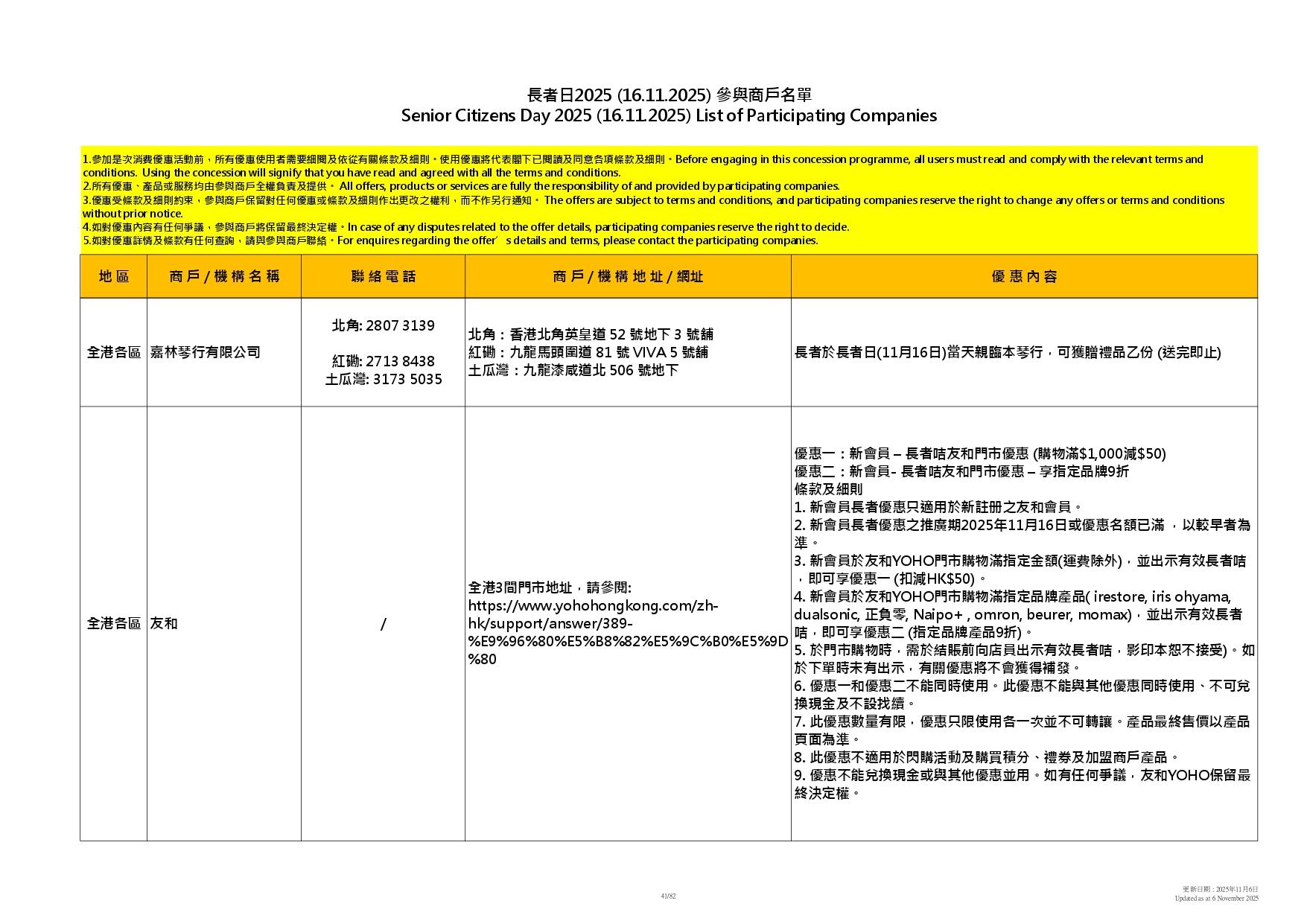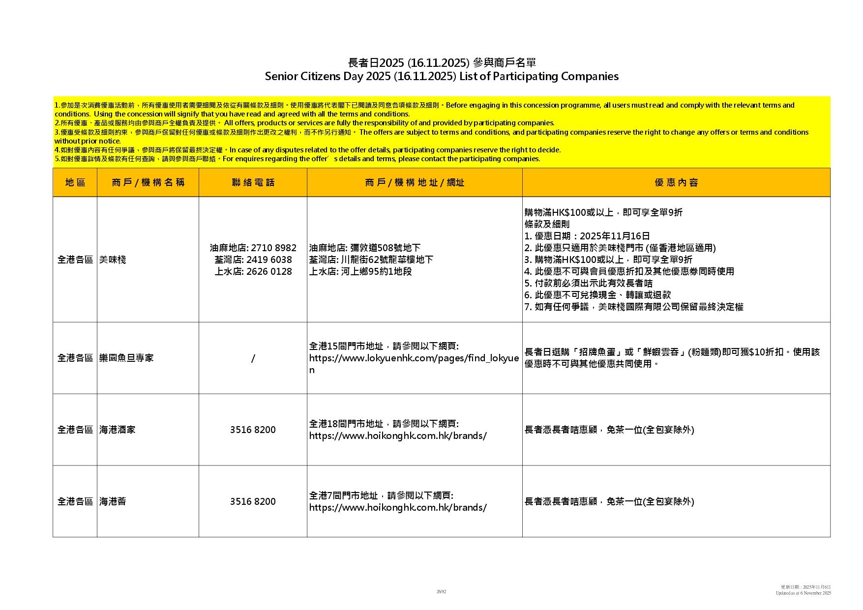 11月16日至11月30日期,每日下午14:00起,長者出示有效樂悠咭/長者咭,並使用電子支付,即享全單消費滿$50減$5;全單消費滿$100減$10(滿$100後全單最多減$10)。