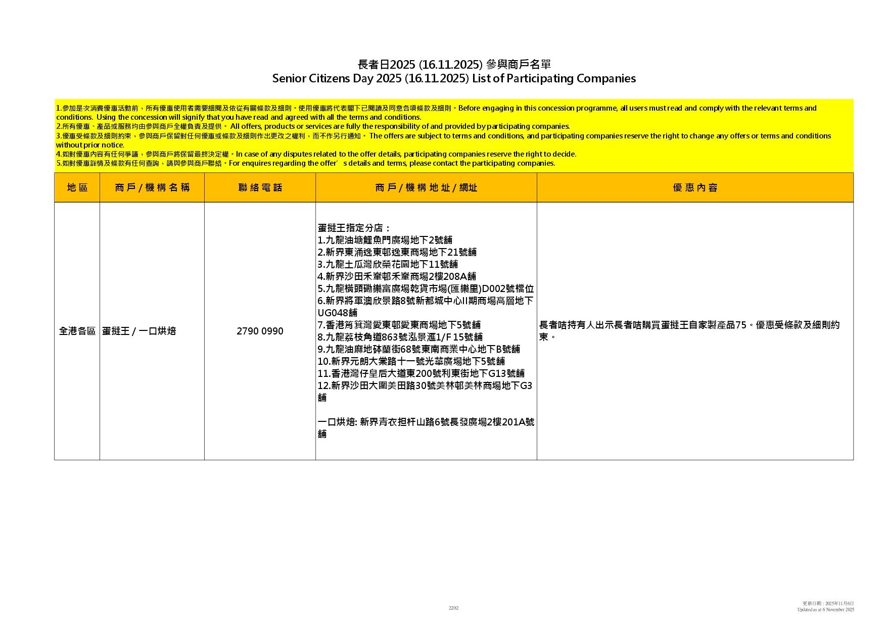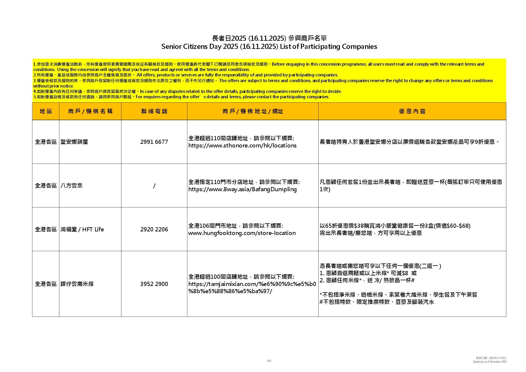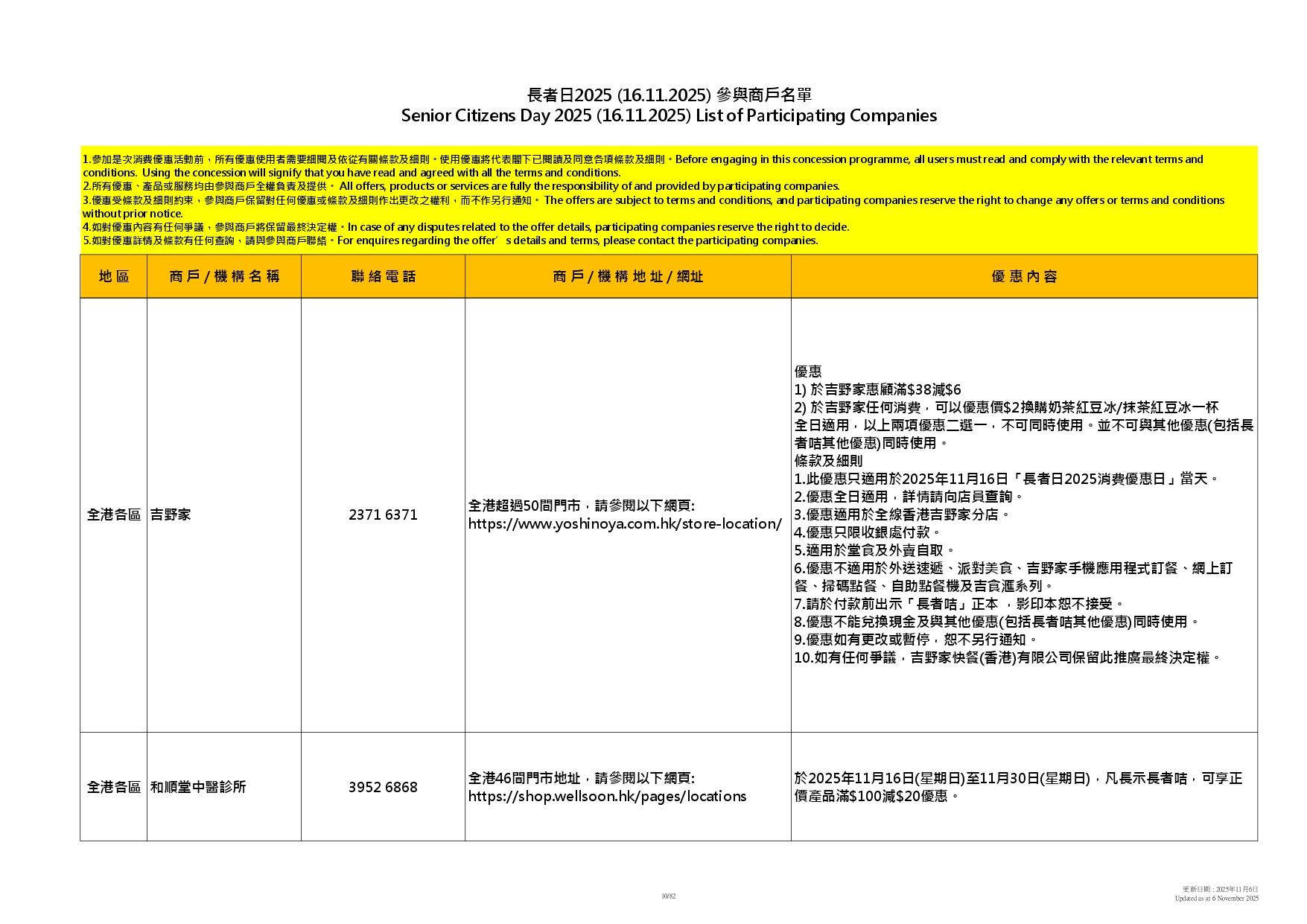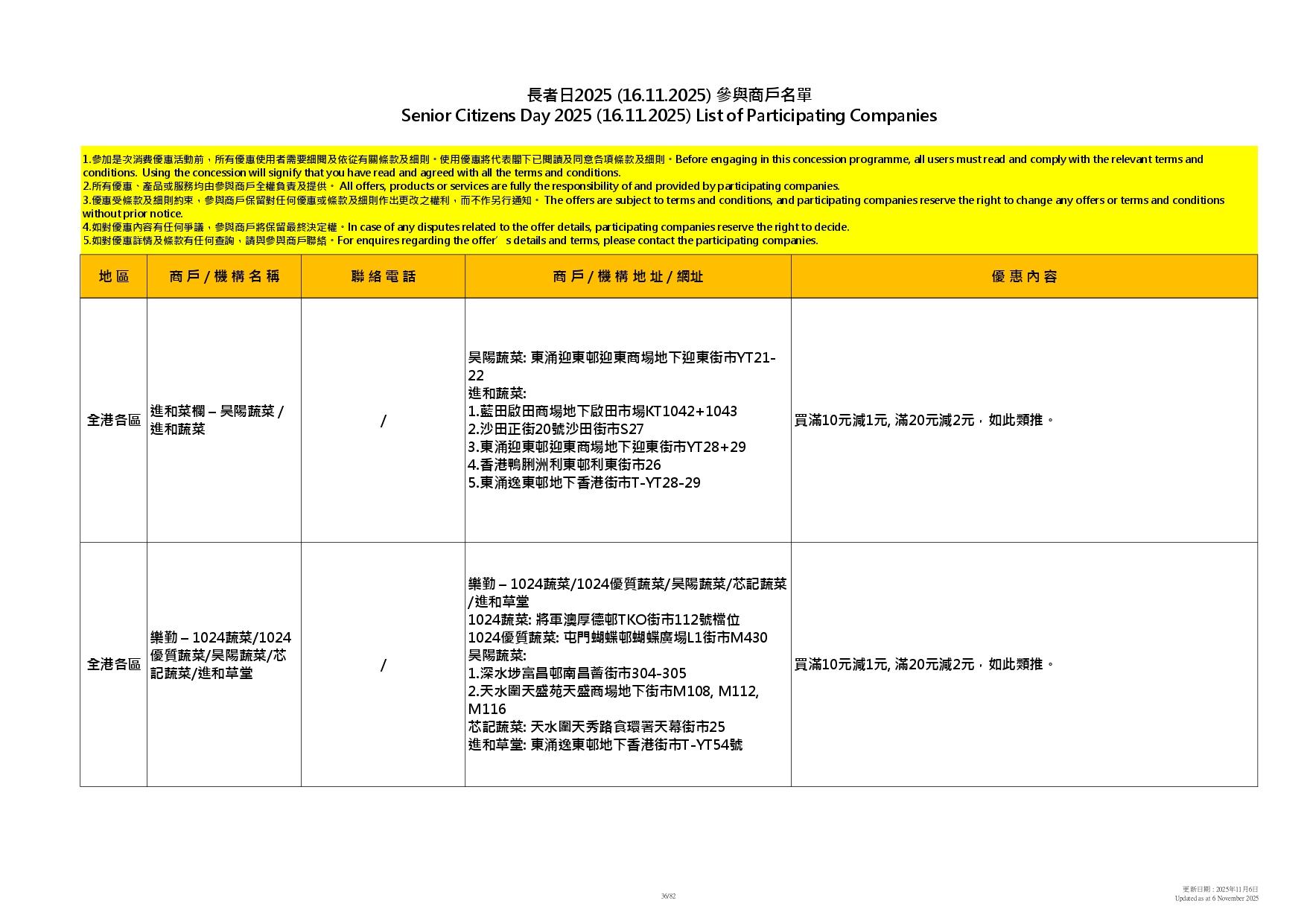 11月16日至11月30日期,每日下午14:00起,長者出示有效樂悠咭/長者咭,並使用電子支付,即享全單消費滿$50減$5;全單消費滿$100減$10(滿$100後全單最多減$10)。