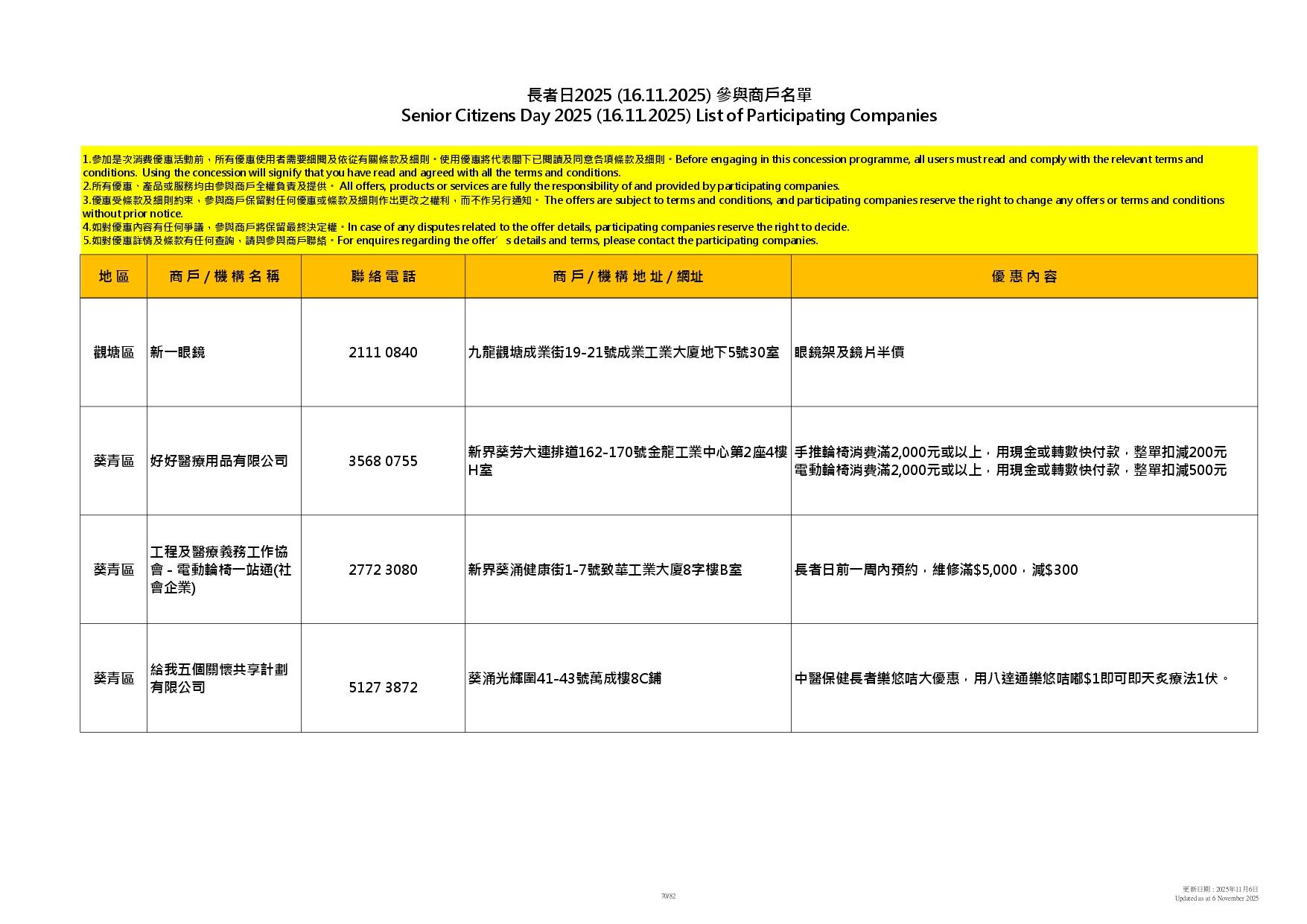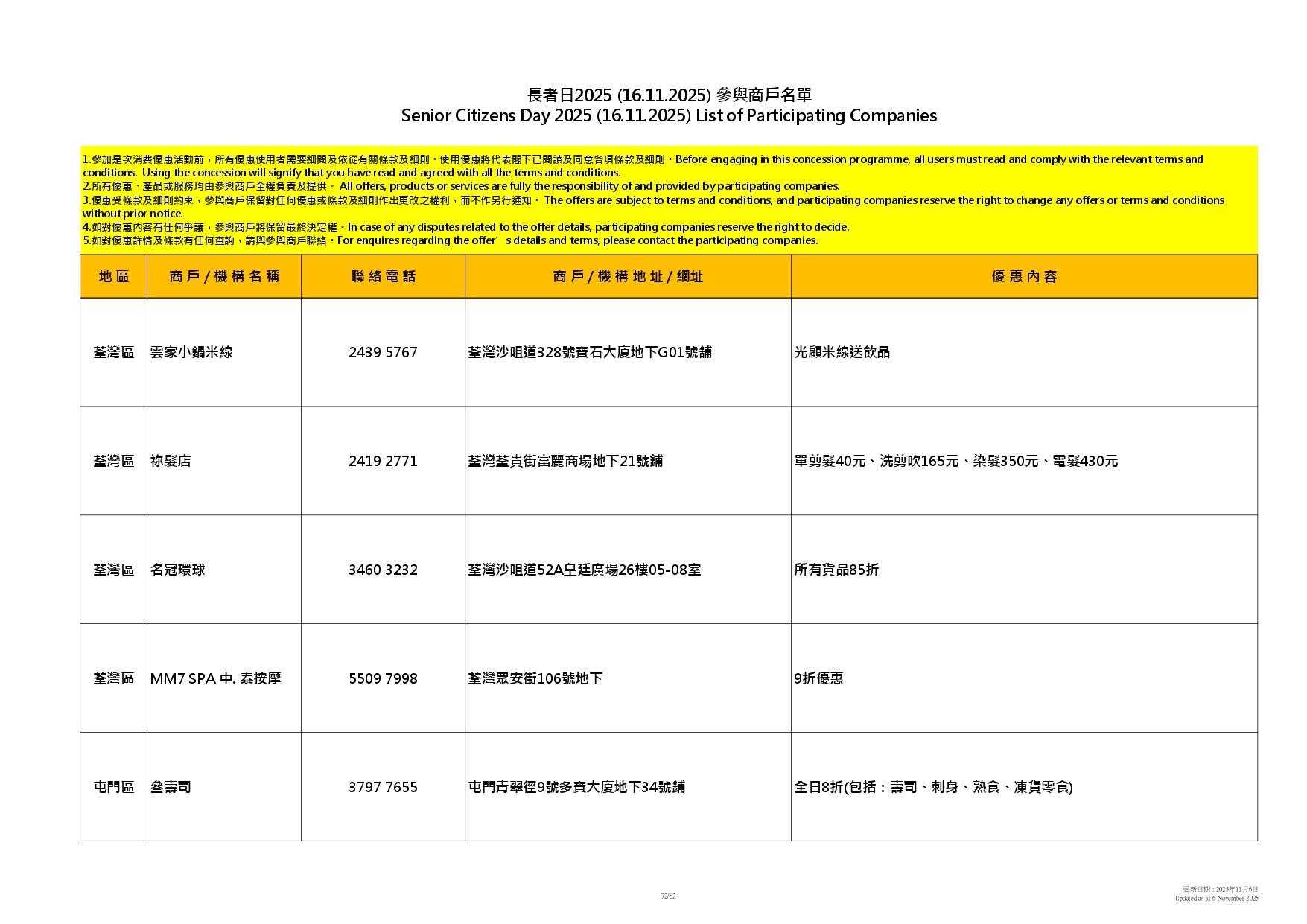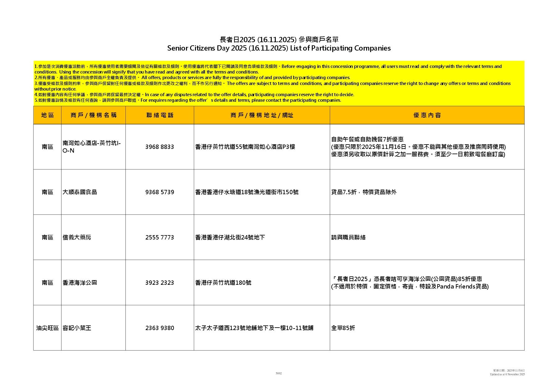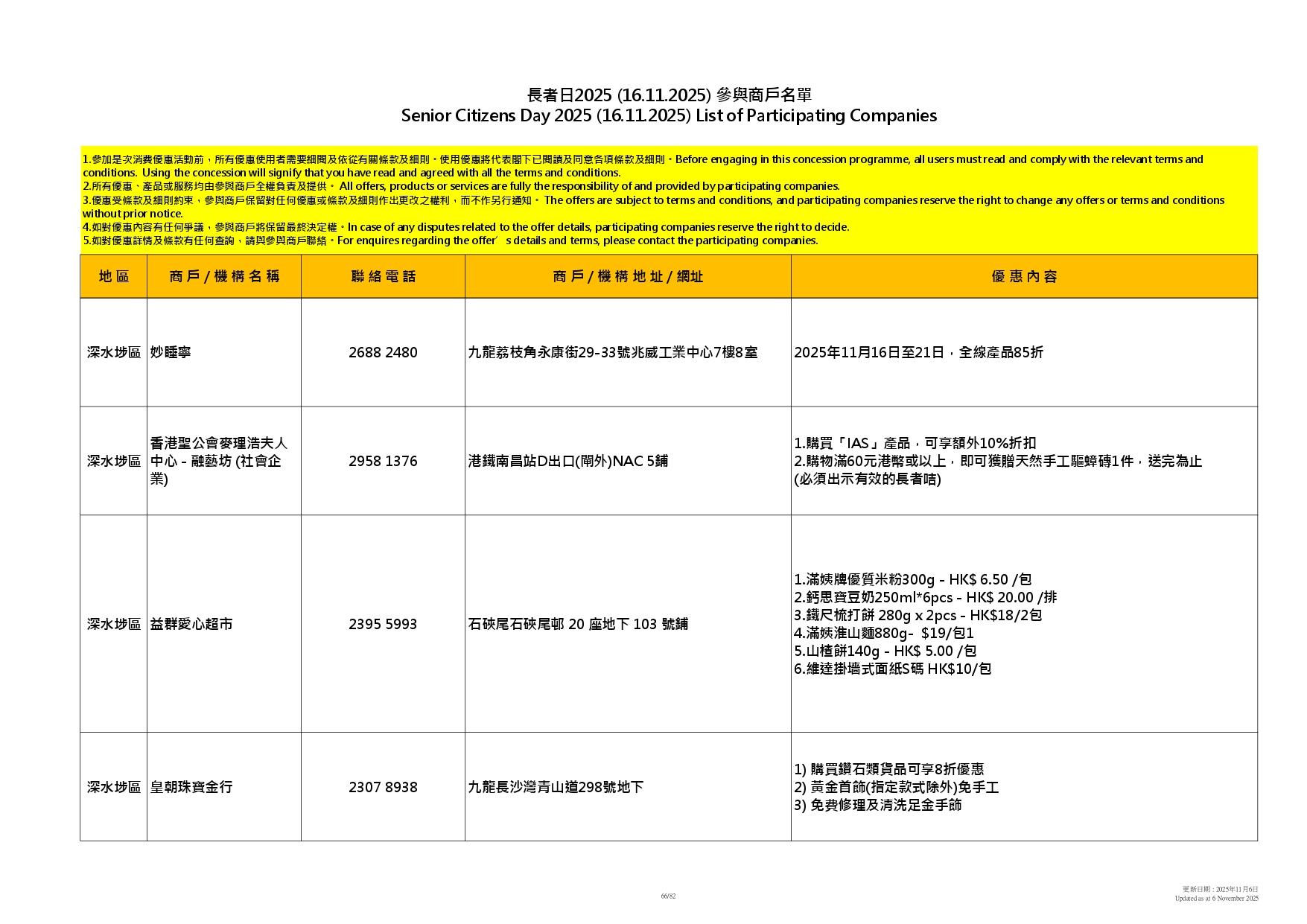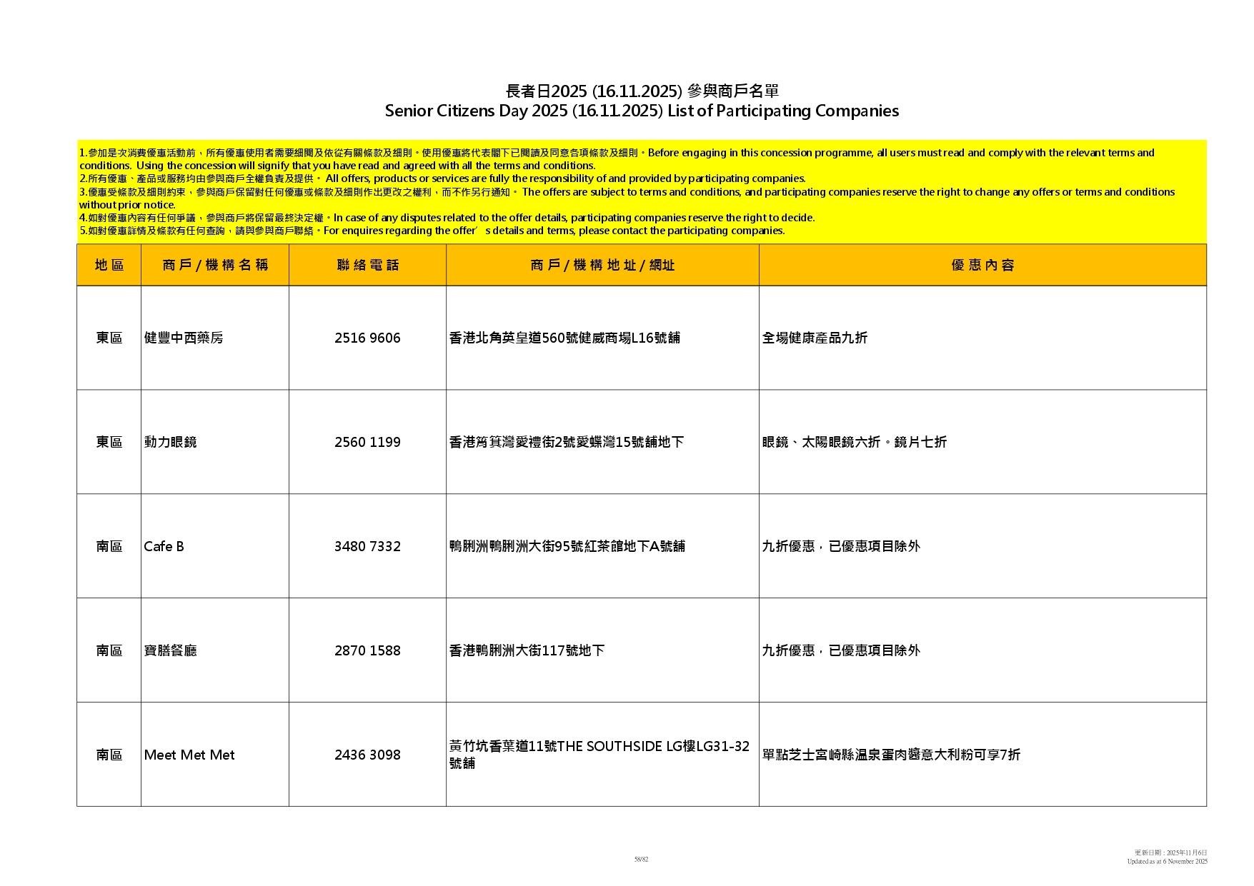 11月16日至11月30日期,每日下午14:00起,長者出示有效樂悠咭/長者咭,並使用電子支付,即享全單消費滿$50減$5;全單消費滿$100減$10(滿$100後全單最多減$10)。