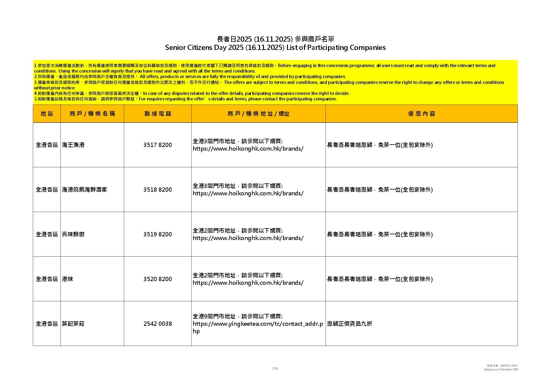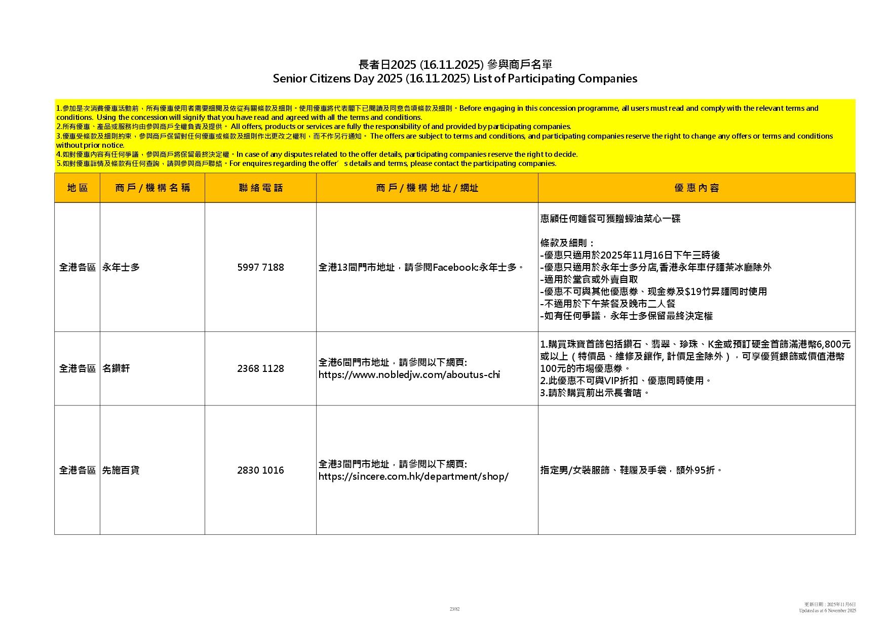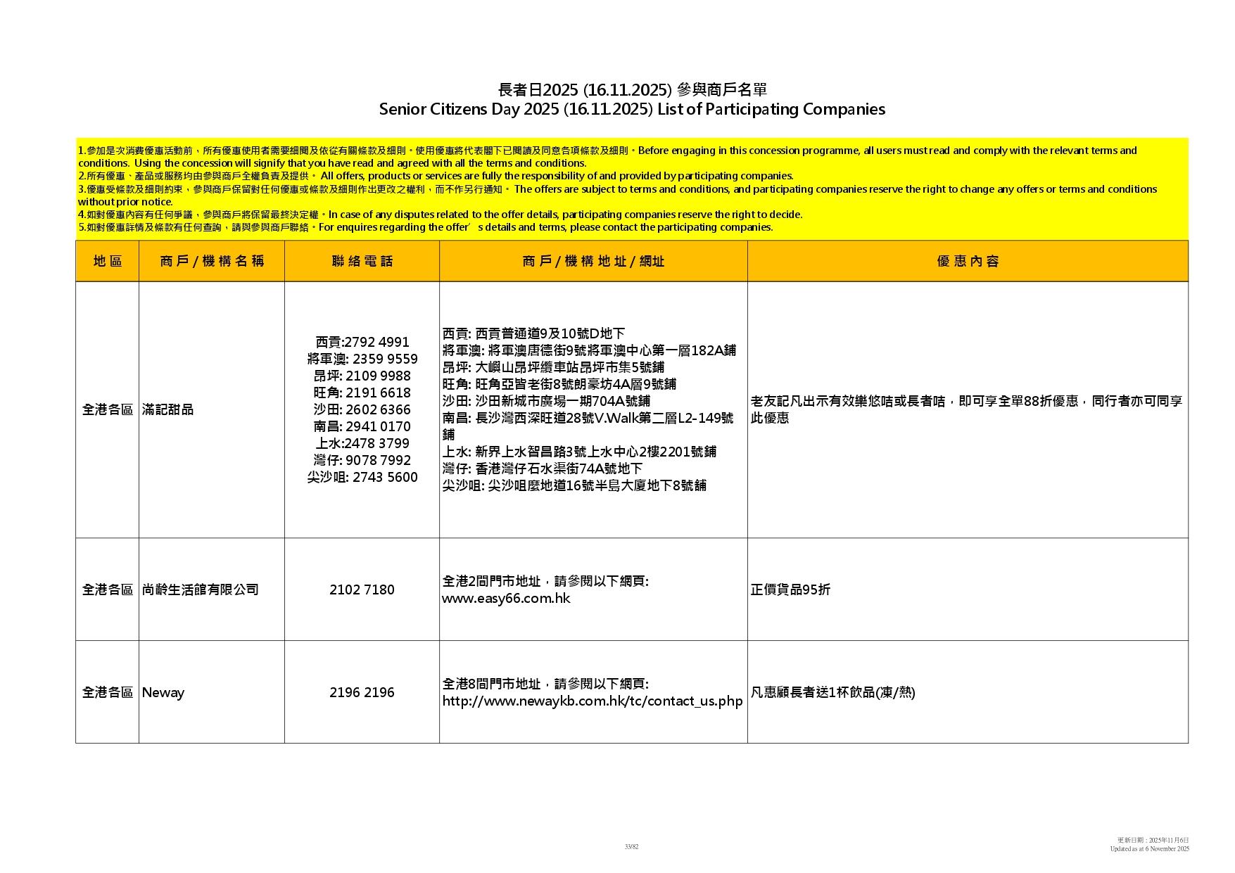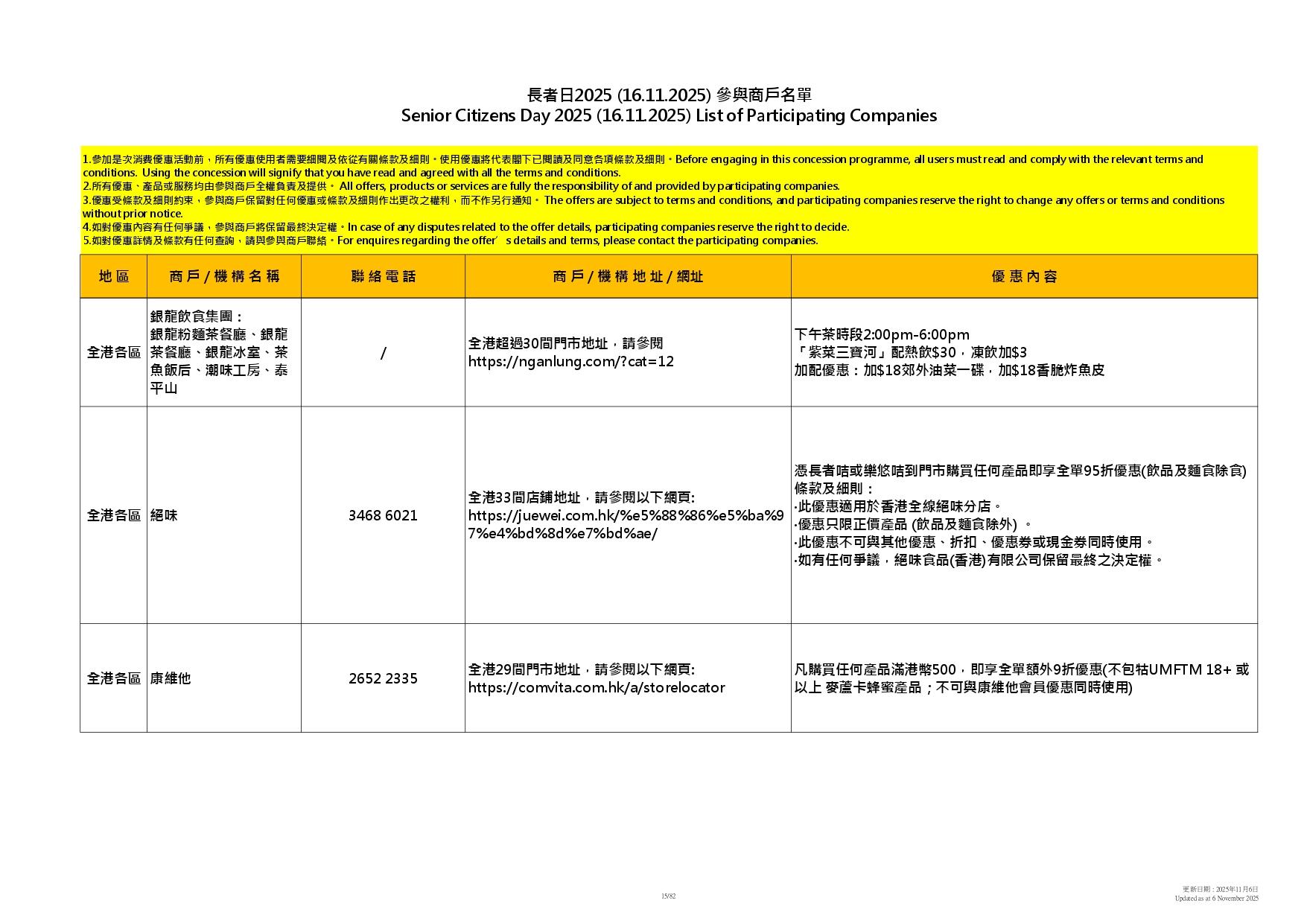 長者日當日更有多間連鎖餐廳及食肆參與活動,另外不少超市及零售店鋪皆推出優惠。