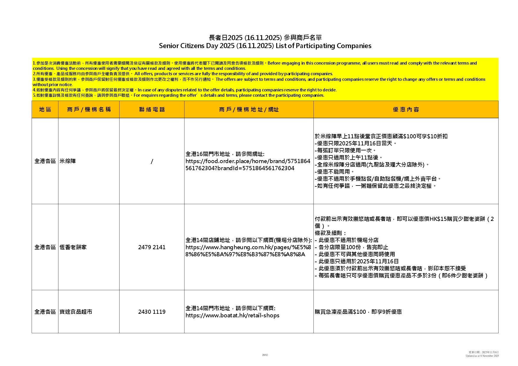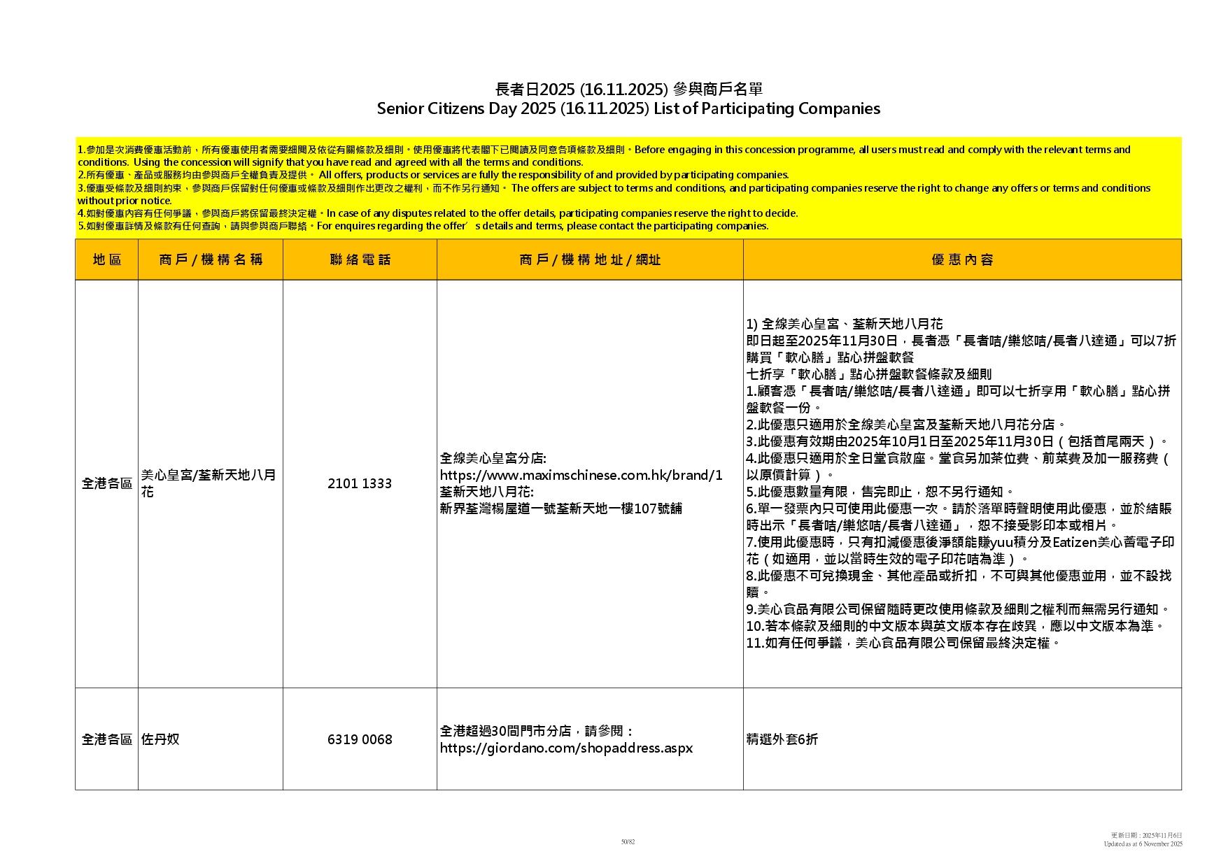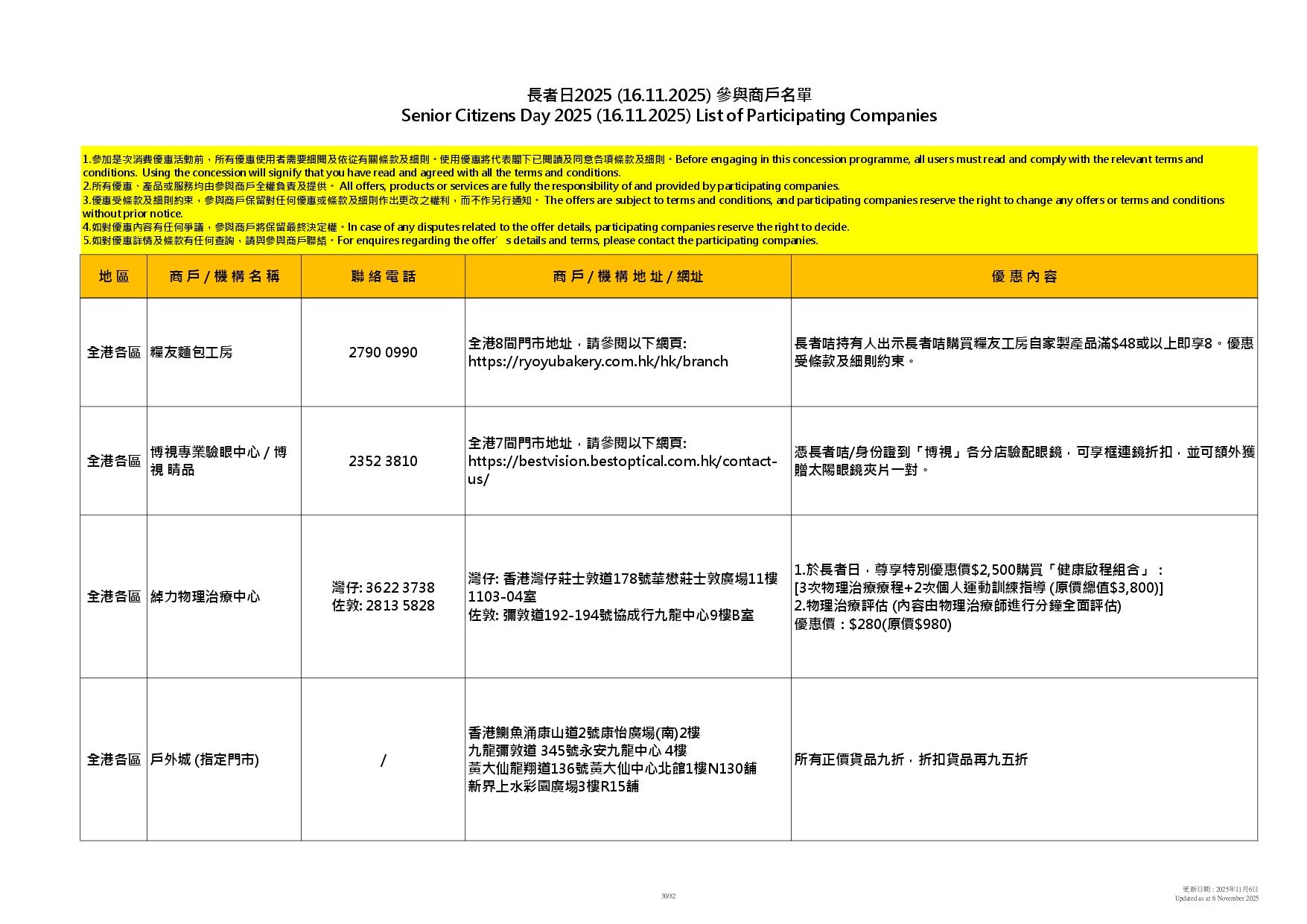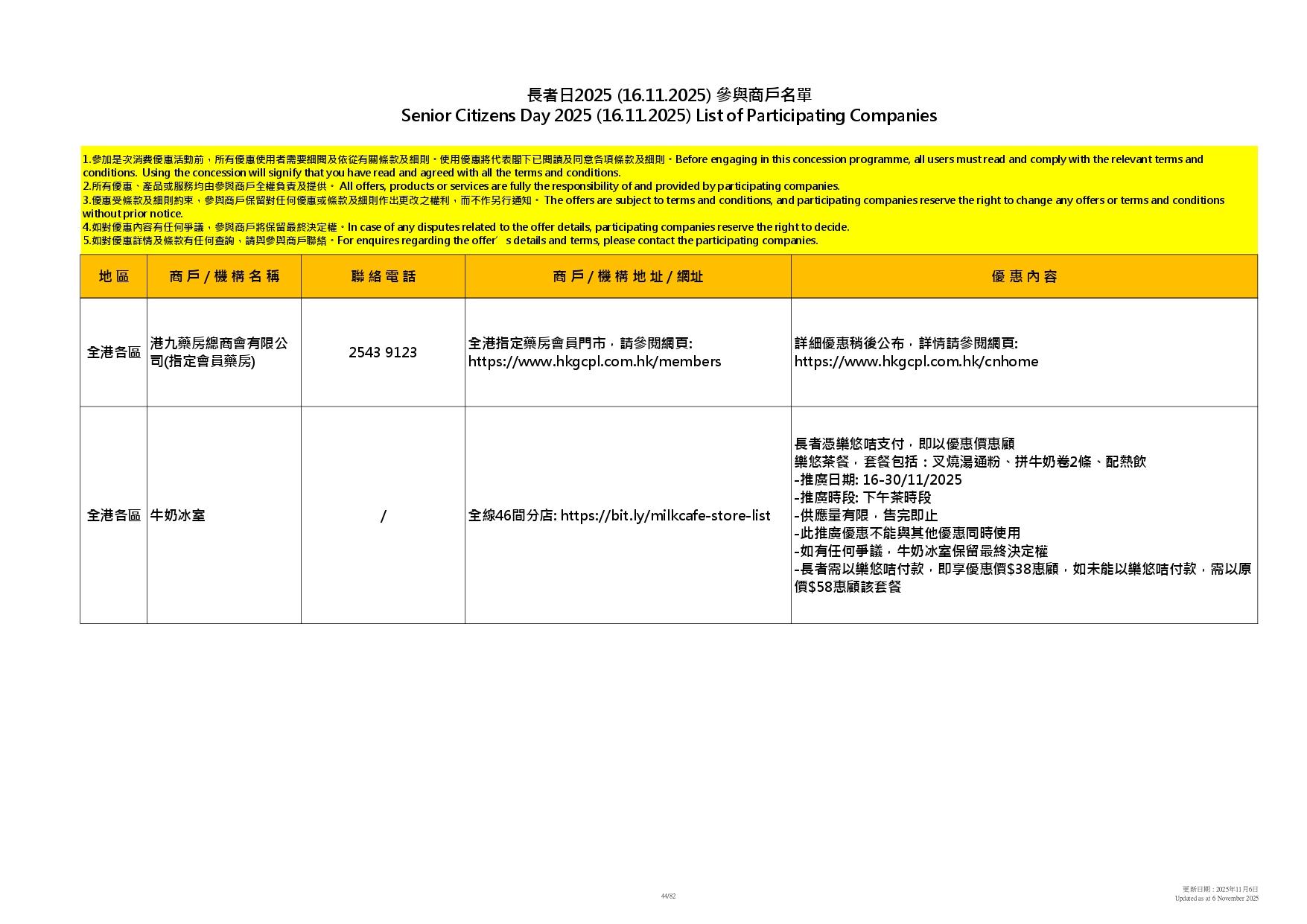 長者日當日更有多間連鎖餐廳及食肆參與活動,另外不少超市及零售店鋪皆推出優惠。