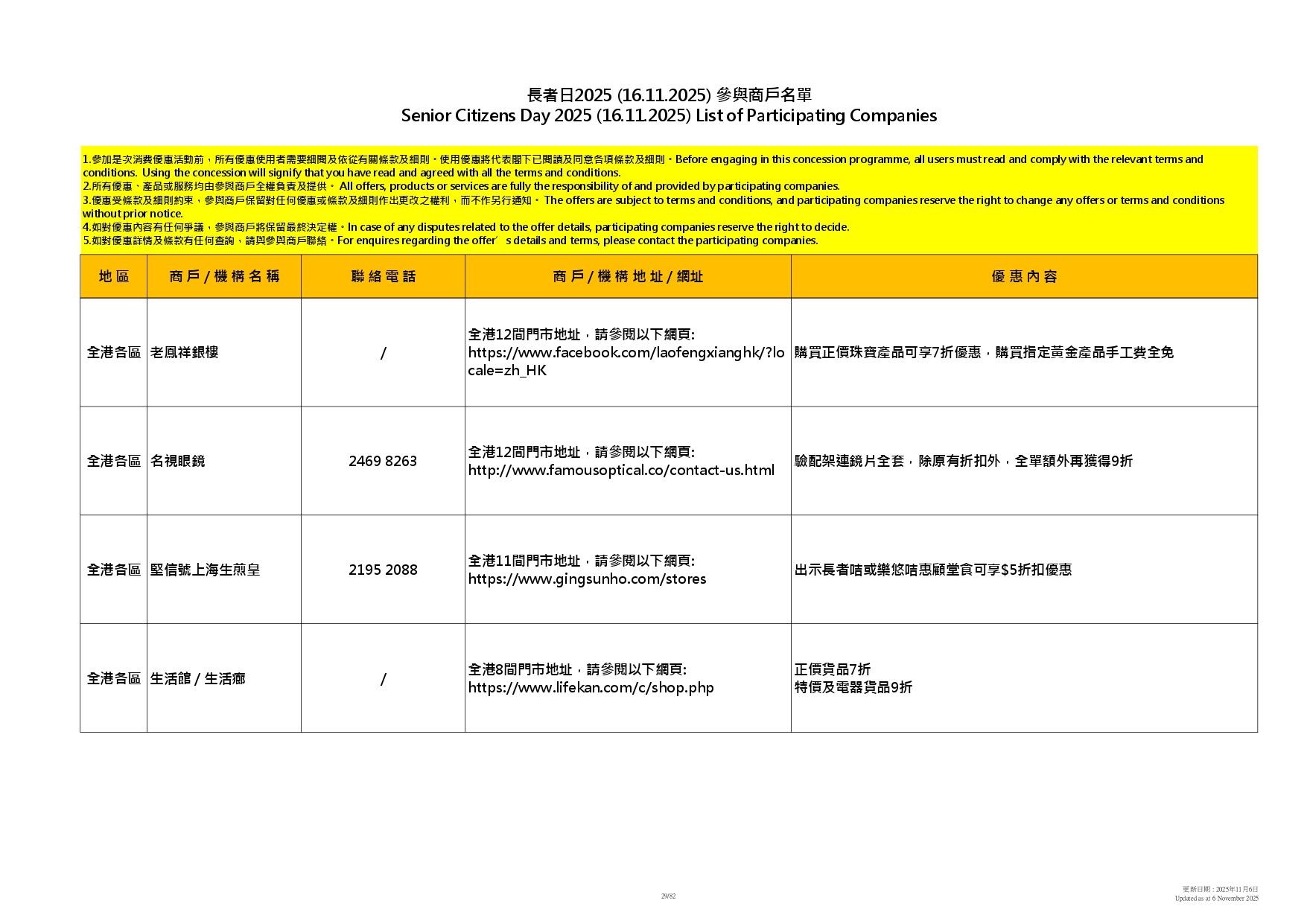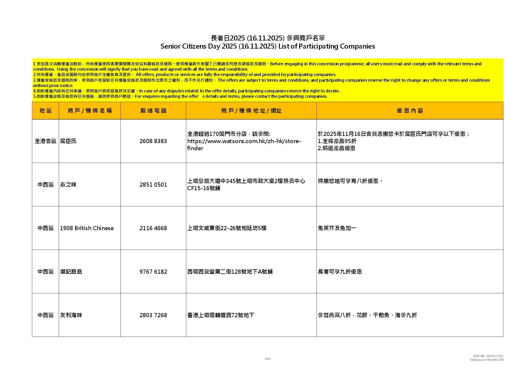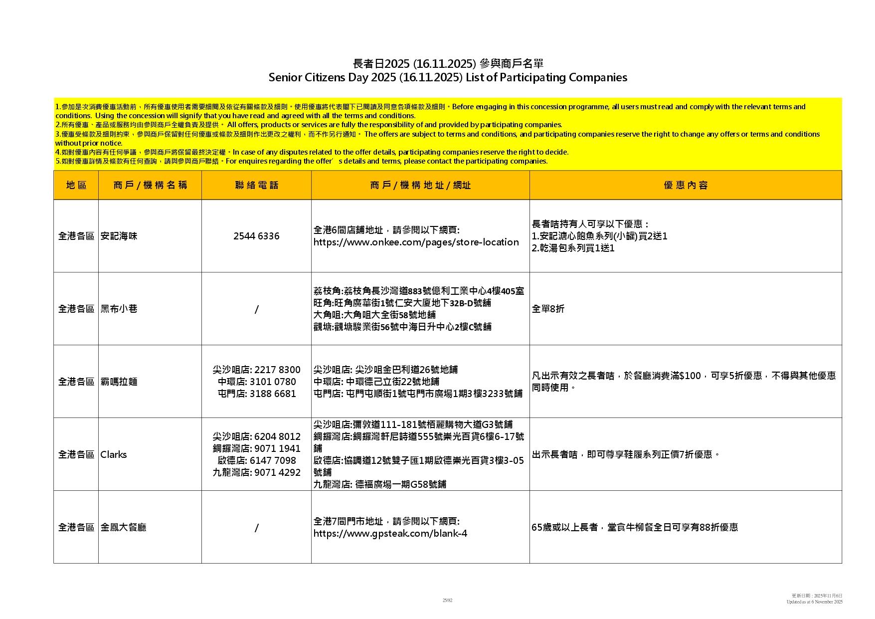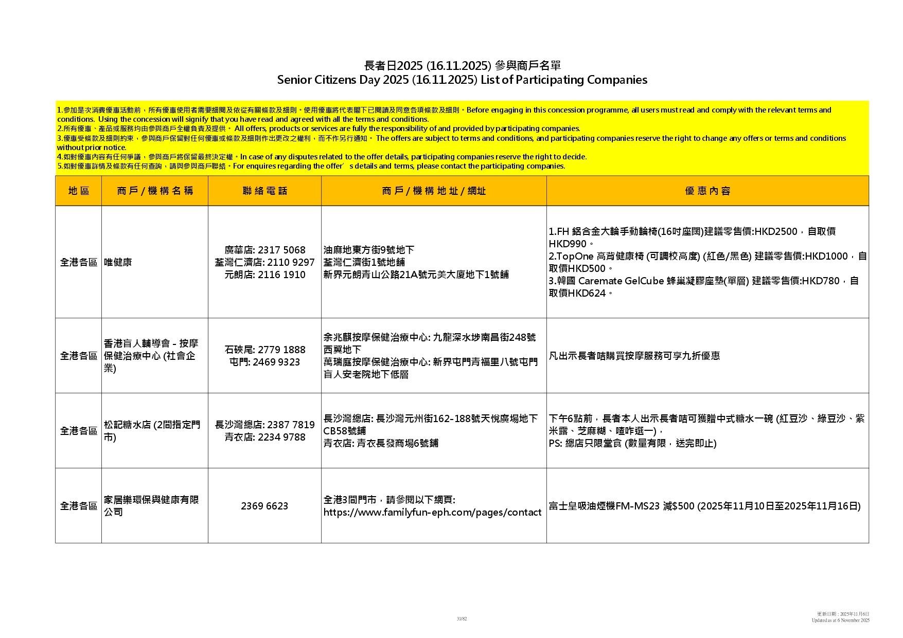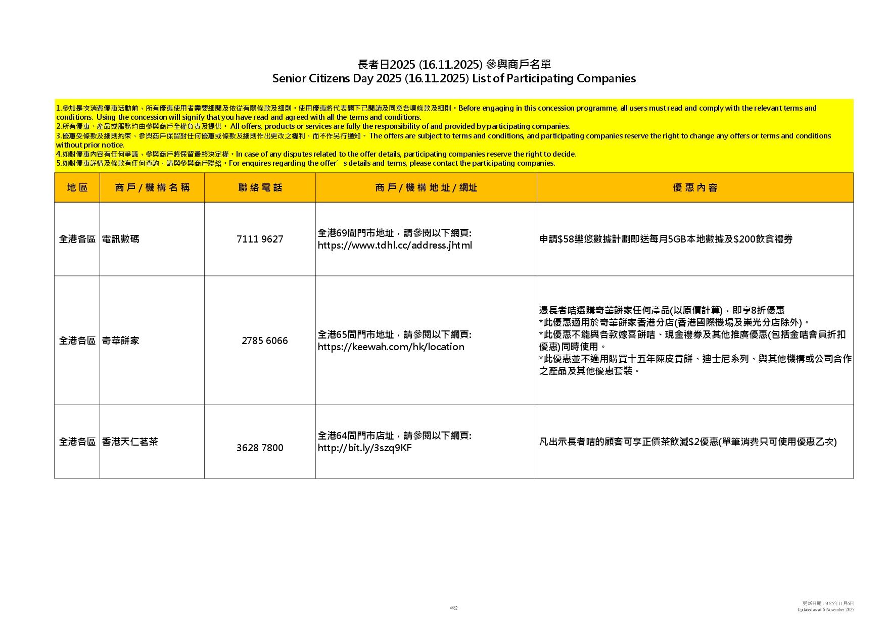 長者日當日更有多間連鎖餐廳及食肆參與活動,另外不少超市及零售店鋪皆推出優惠。