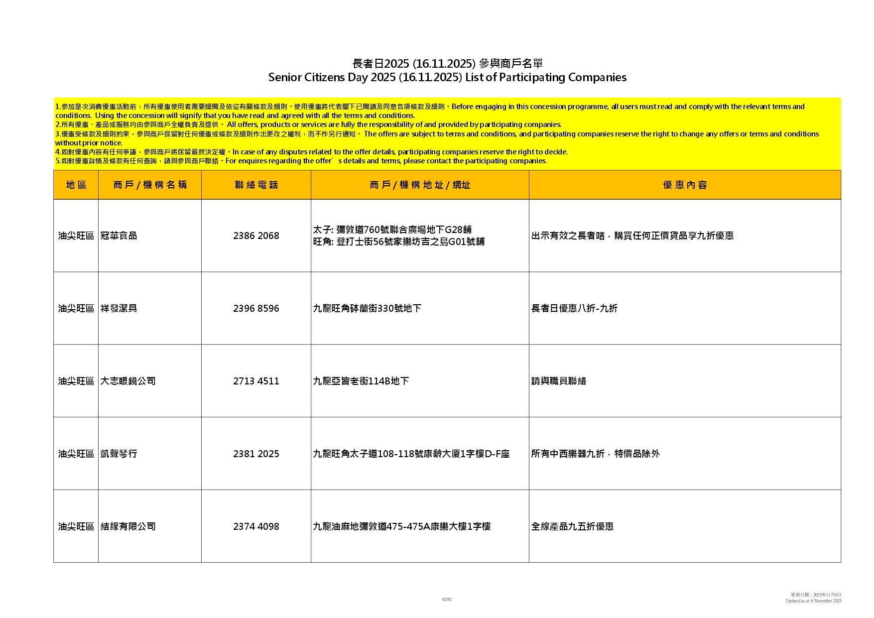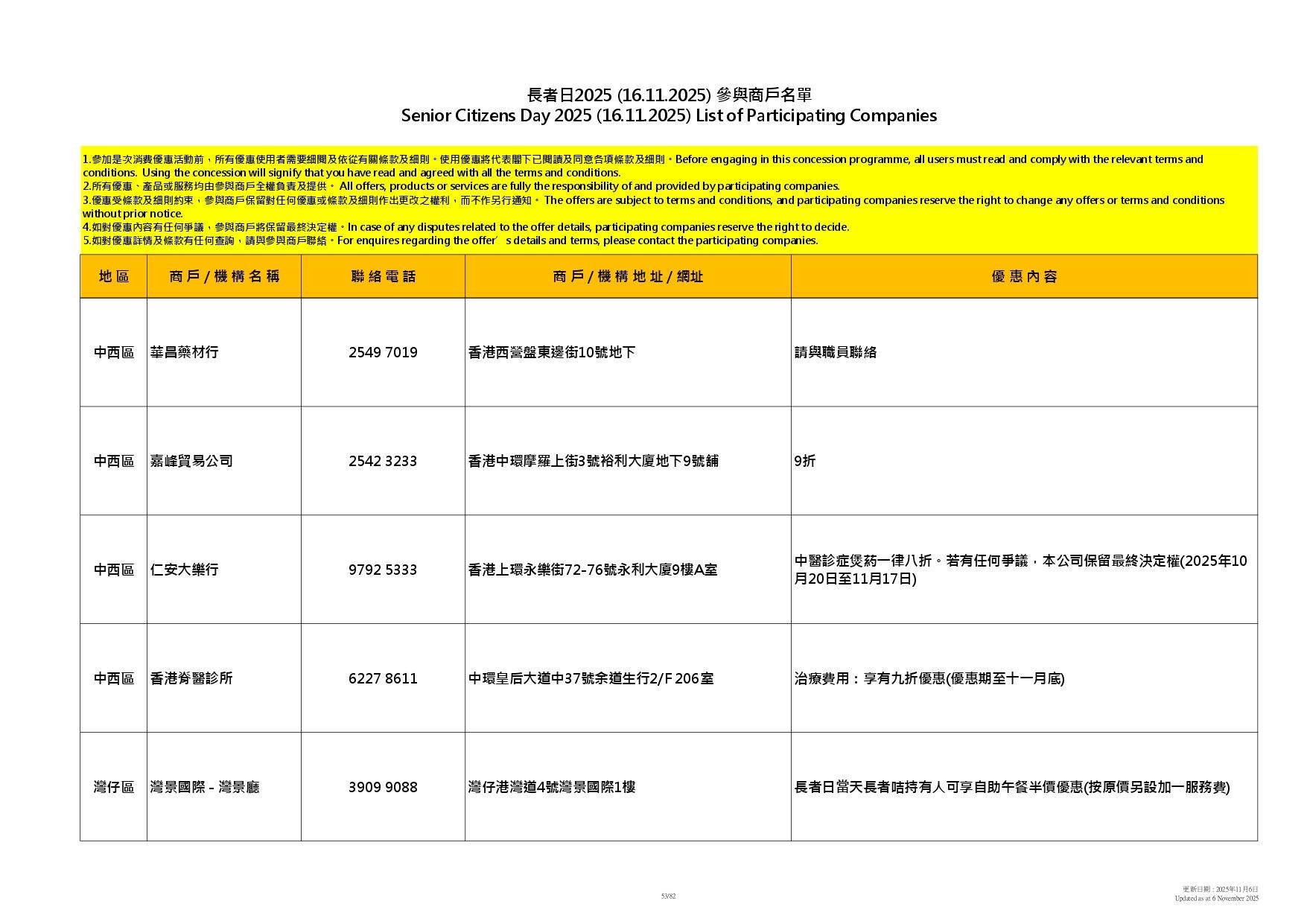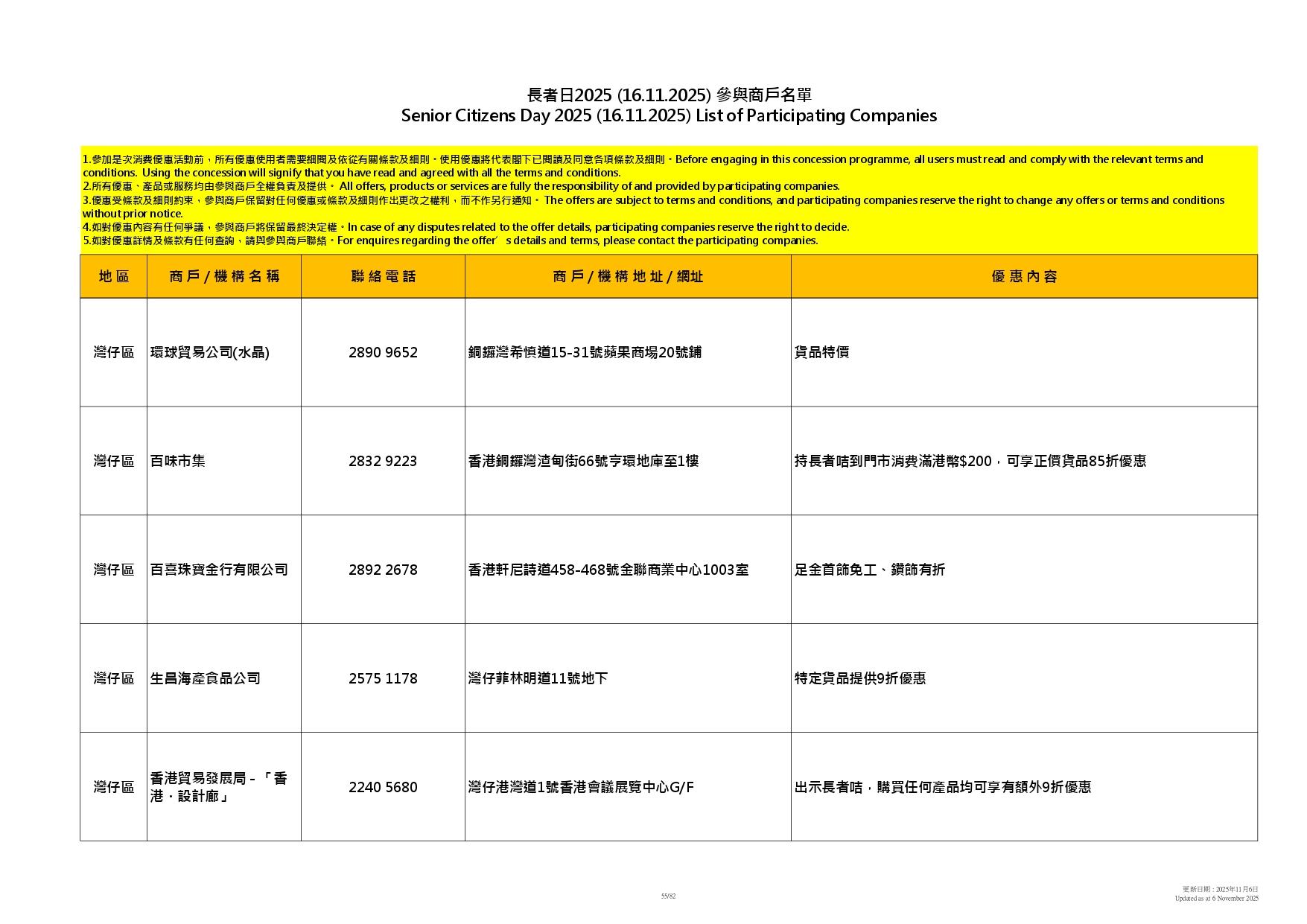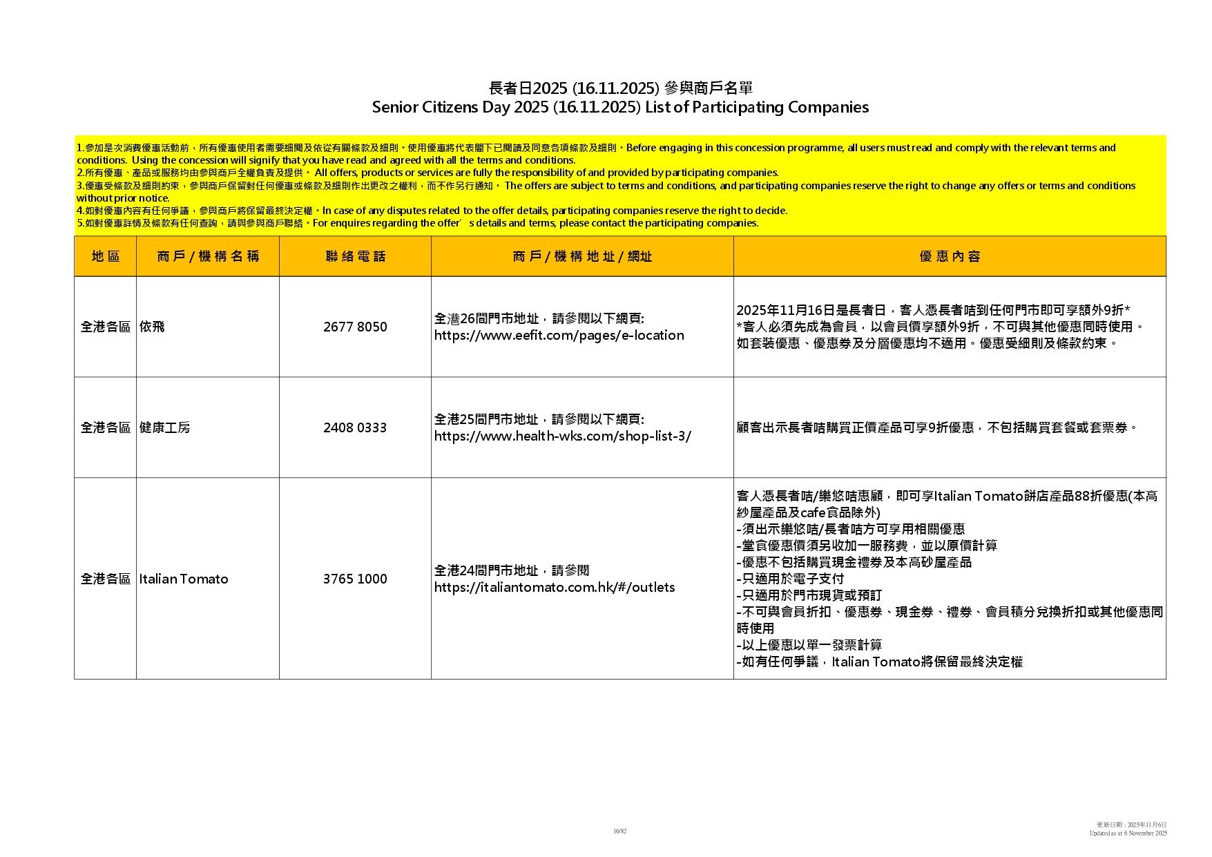 長者日當日更有多間連鎖餐廳及食肆參與活動,另外不少超市及零售店鋪皆推出優惠。