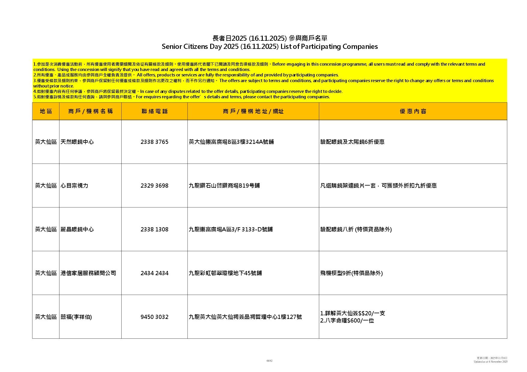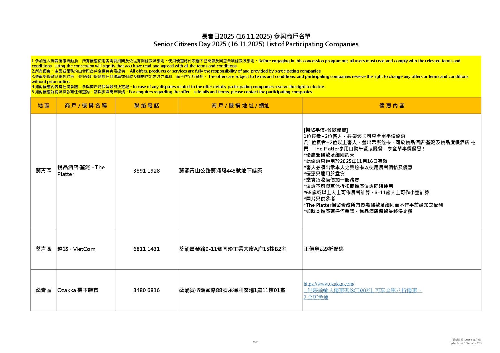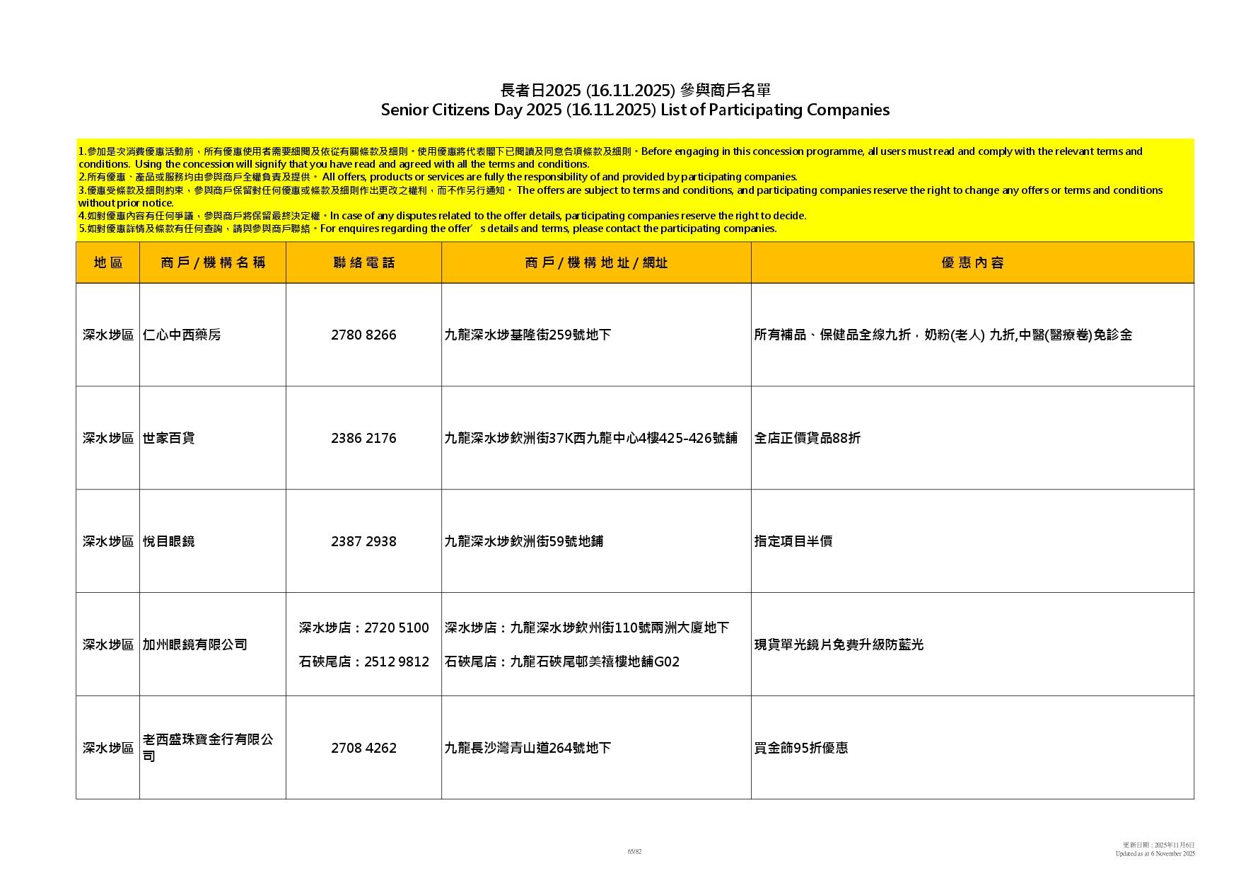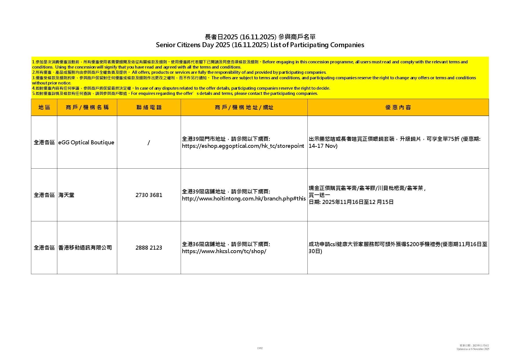 長者日當日更有多間連鎖餐廳及食肆參與活動,另外不少超市及零售店鋪皆推出優惠。