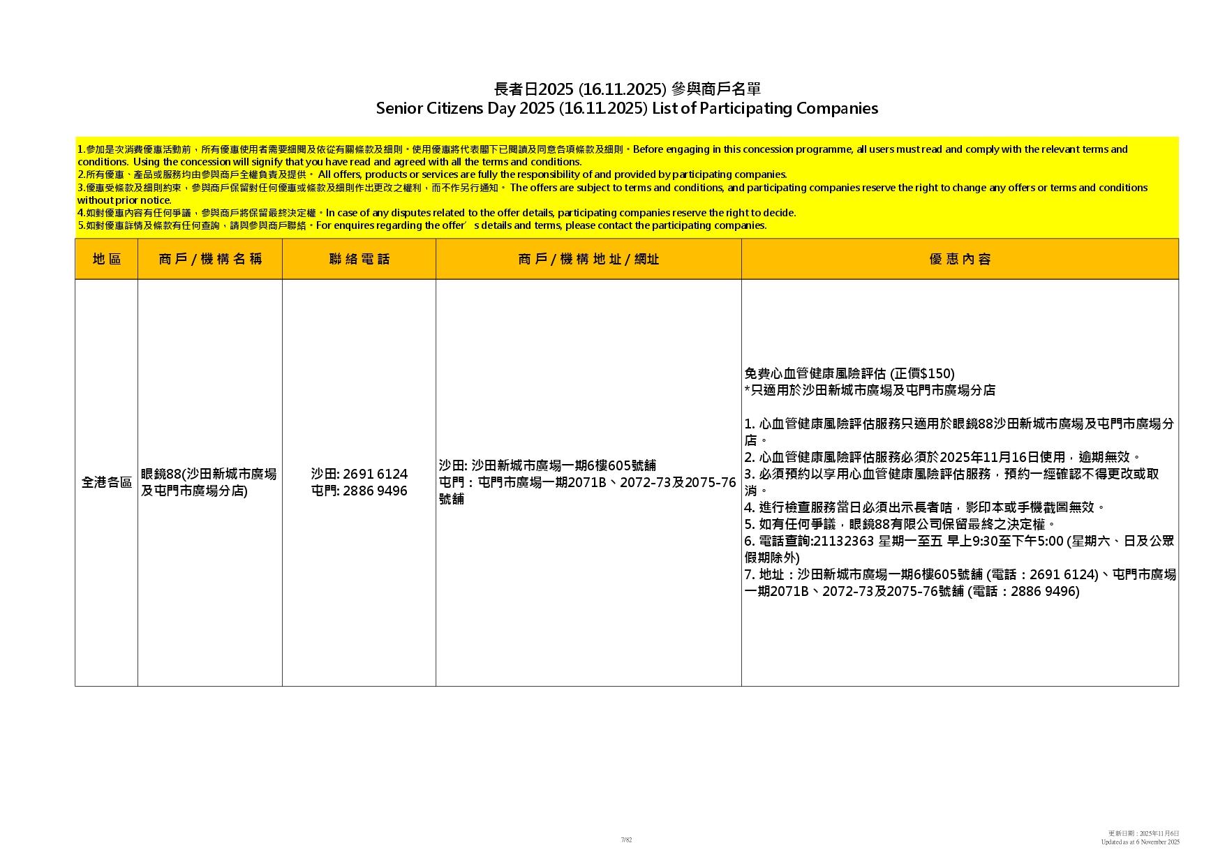 - 出示長者咭,預約指定沙田及屯門分店享免費心血管健康風險評估。