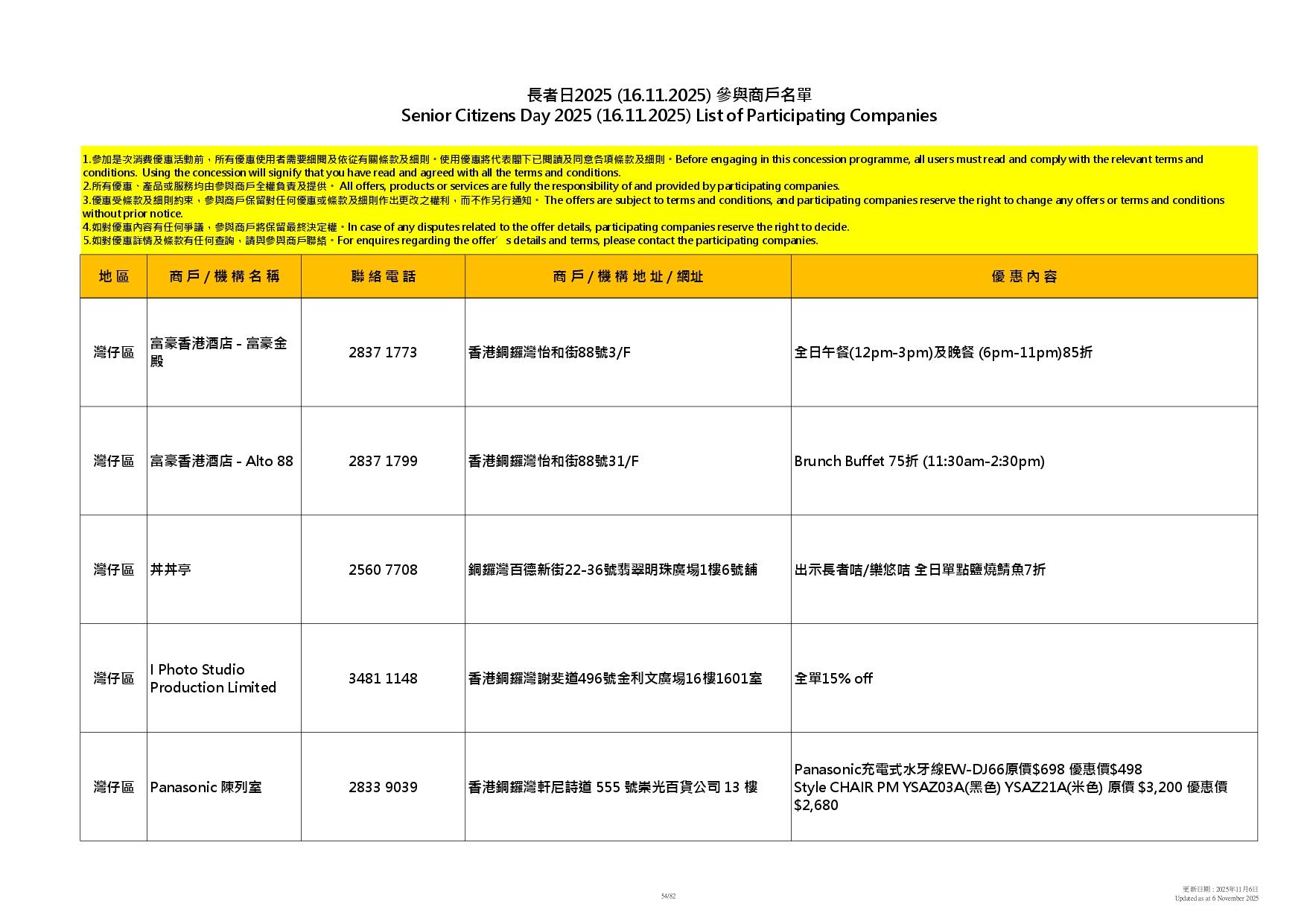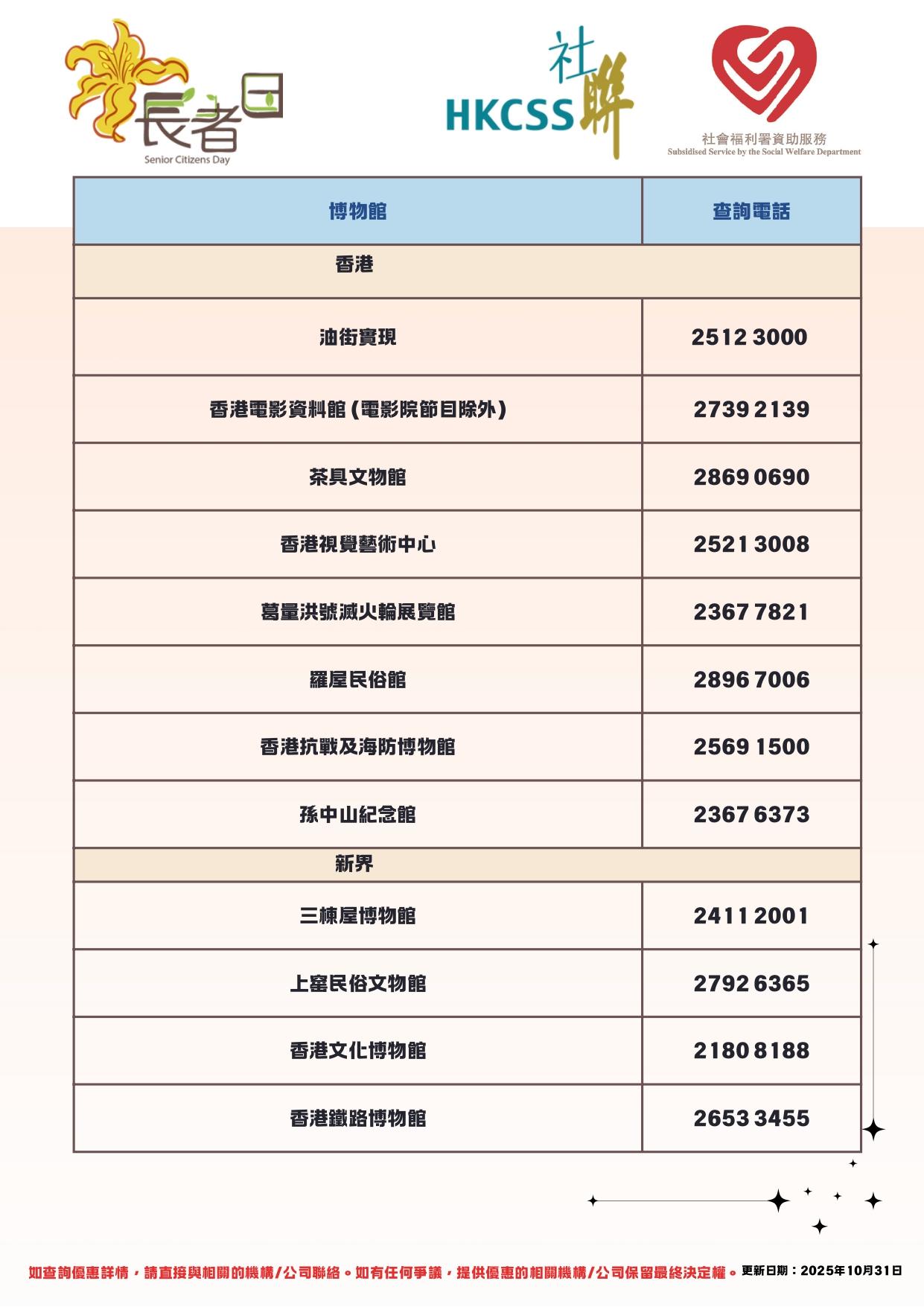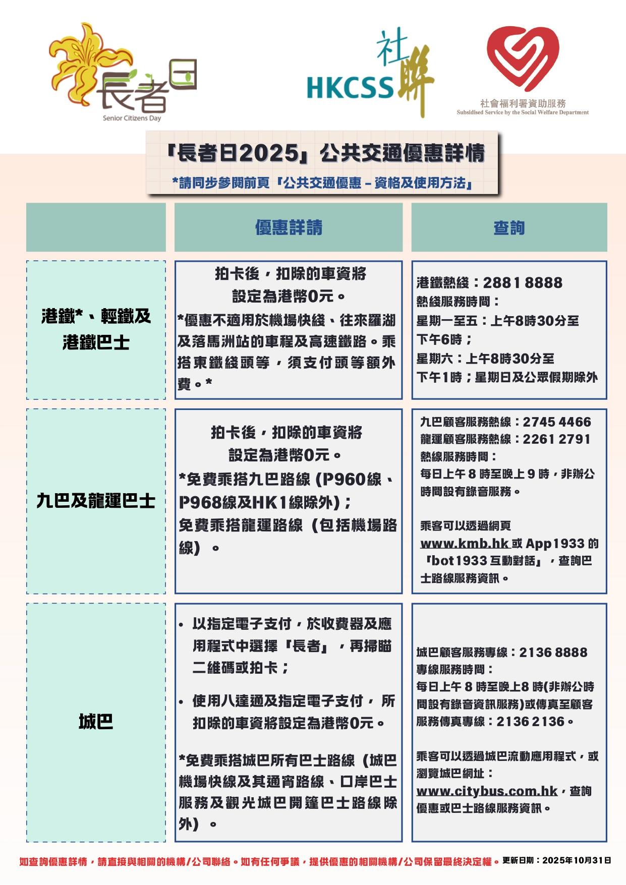 長者日2025於11月16日舉行,多項交通工具及景點免費入場,另外逾千個品牌包括食肆、零售及服務業,為各位老友記提供一系列獨家優惠!長者只需出示長者咭等證明,即可獲各種折扣,以下記者整合多個長者日著數優惠,即睇詳情!