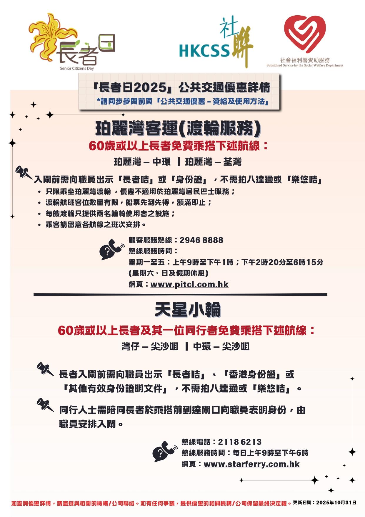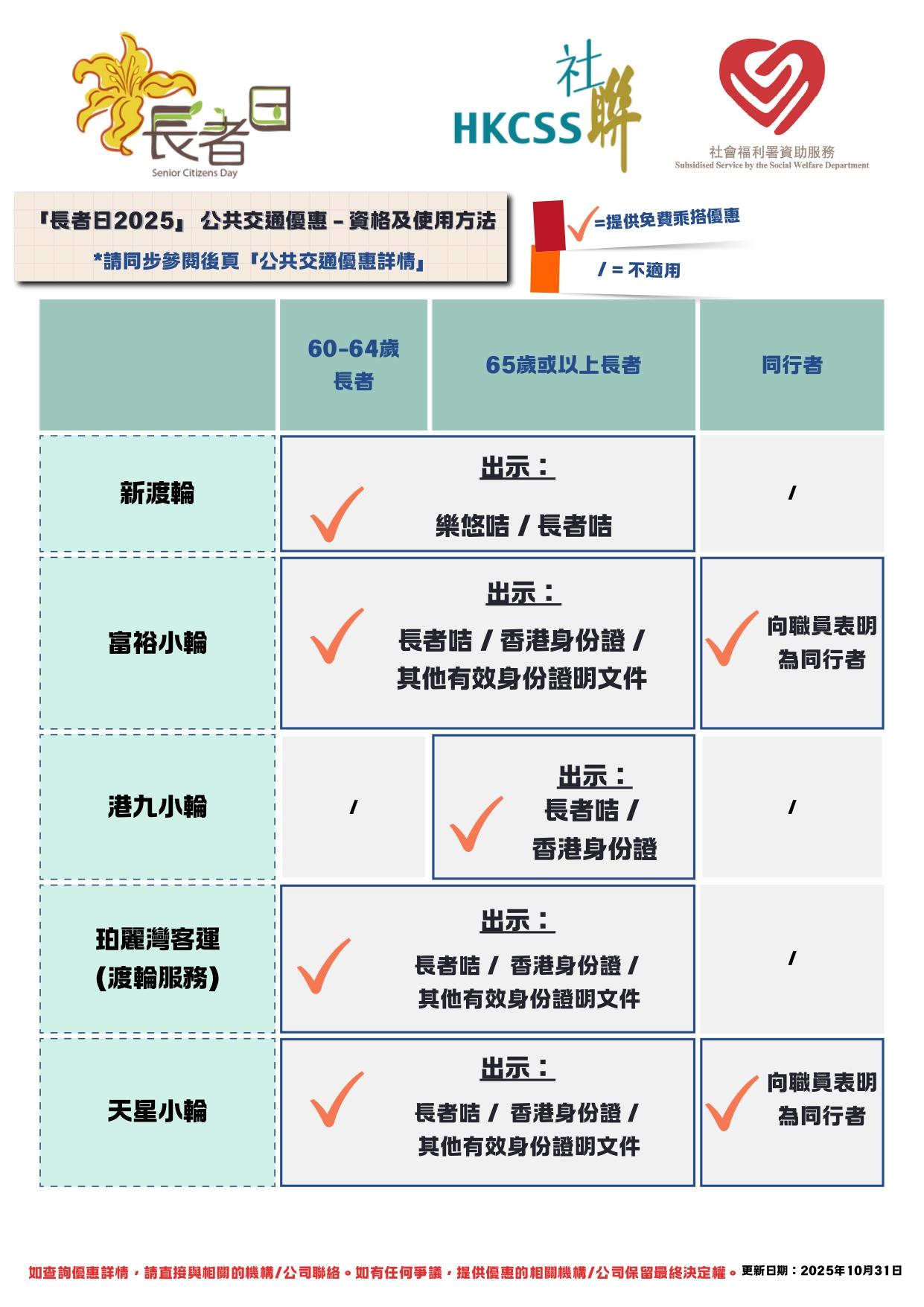 60歲或以上長者,只要乘坐以下交通工具時出示長者咭、身份證或樂悠咭,即可免費乘搭以下交通工具,而富裕小輪、天星小輪更有同行者(限一位)免費優惠: