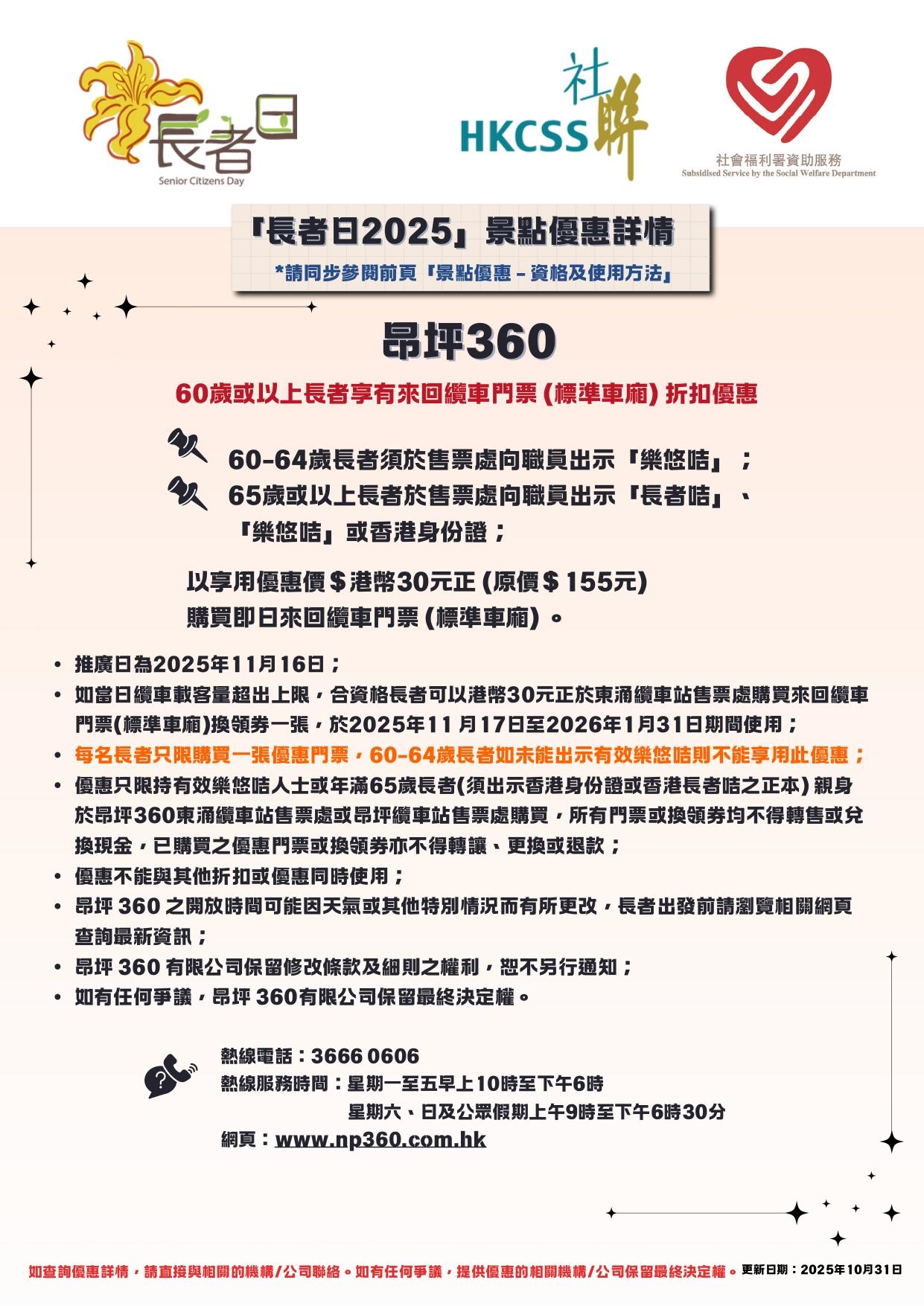 60-64歲長者出示樂悠咭、 65歲或以上長者出示長者咭、樂悠咭或香港身份證,即享優惠價$30 (原價$155) 購買即日來回纜車門票(標準車廂)。