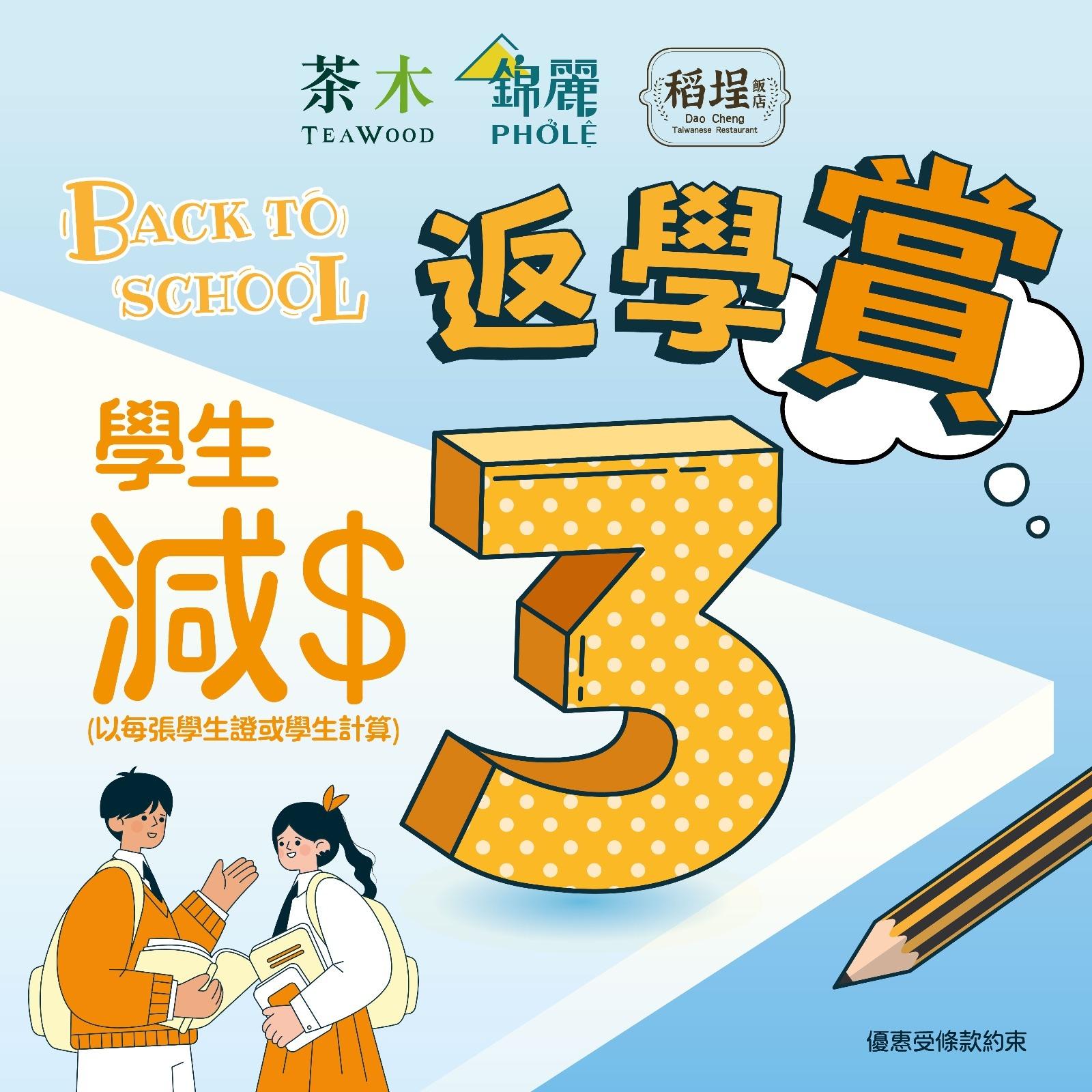 茶木、錦麗、稻埕同時推出「Happy Back to School 返學賞」優惠活動,即日起至9月30日,只要出示有效學生證或穿著校服,於茶木、錦麗及稻埕全線分店惠顧任何主食或套餐,即可享$3折扣優惠!