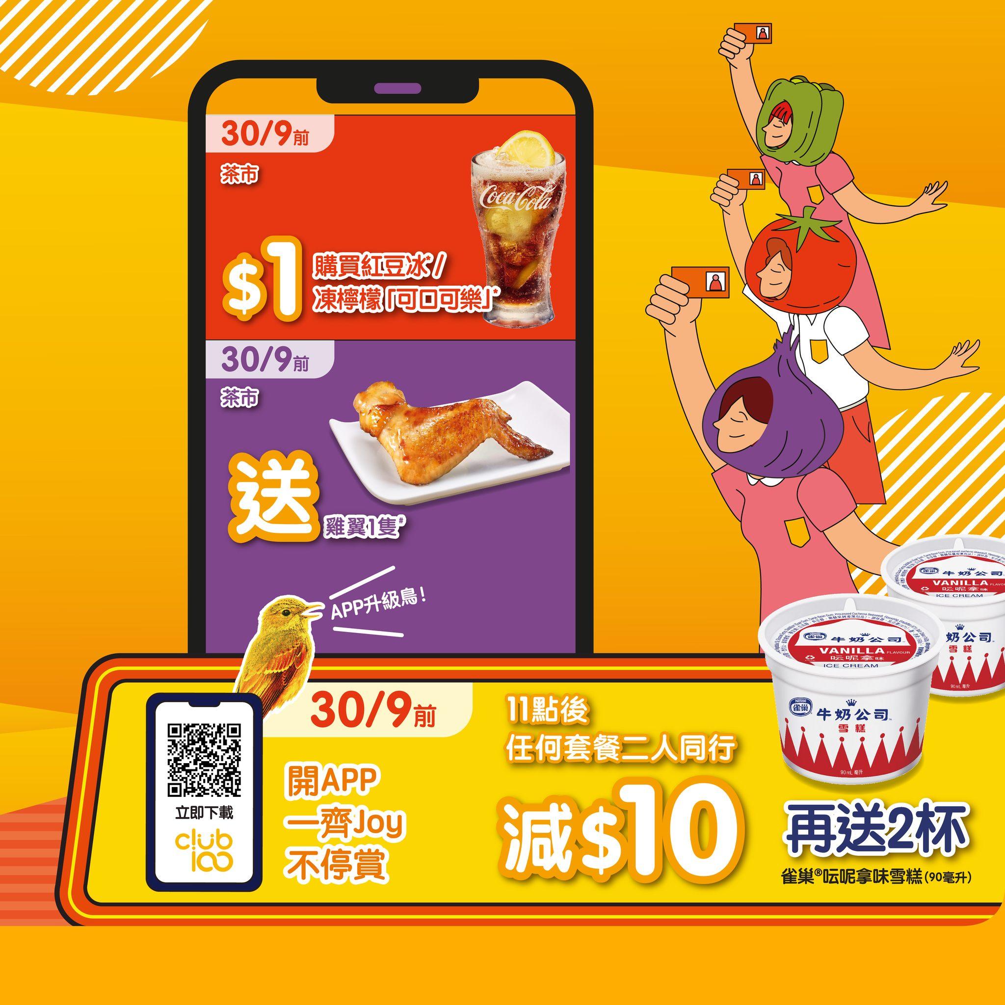 9月2日至30日期間,登記成為學生會員,可於全線分店逢星期一至五(星期六日、公眾假期除外),茶市期間,在收銀處出示Club 100學生會員卡,可享 $1 購買1杯紅豆冰 / 凍檸檬可口可樂 (12oz),以及免費送茶市雞翼一隻優惠。