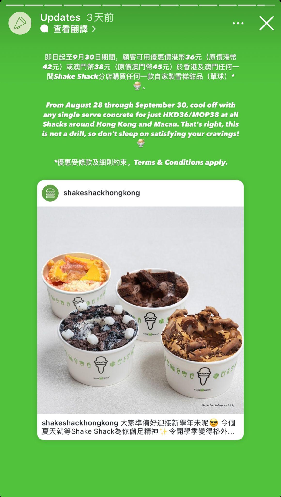 此外,即日起至9月30日期間,所有顧客可以優惠價港幣36元,於港澳任何一間Shake Shack分店購買任何一款自家製雪糕甜品一份(單球)(原價港幣42元)。
