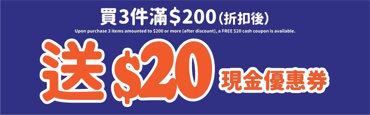 全場購物折扣後滿$200 即贈$20現金優惠券