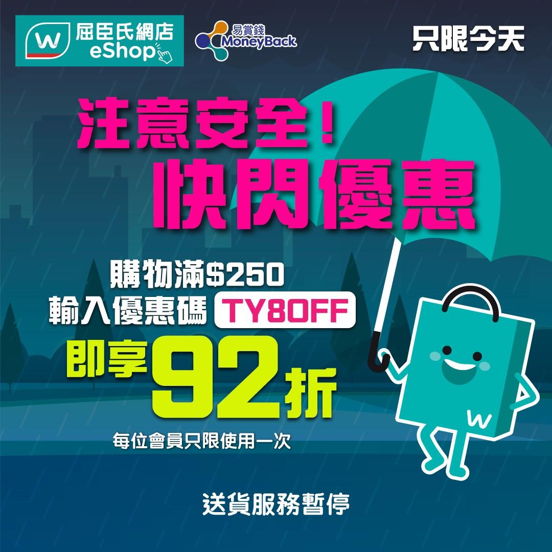 屈臣氏今日分店會維持有限度服務,送貨服務需要暫停,受影響的運單將安排在1至3日內送到,送貨前有專人聯絡確認送貨時間。另外,屈臣氏在打風日子推出網店優惠,今日1/9購物滿$250輸入優惠碼[TY8OFF] 即享92折。