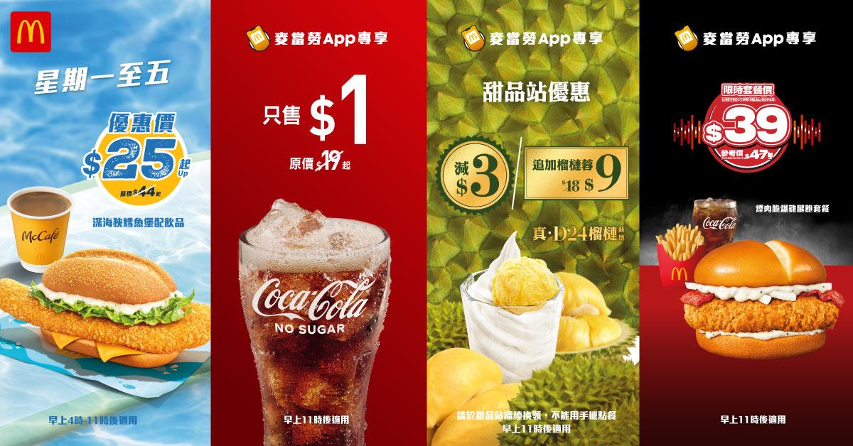下星期一(5月12日)起麥當勞App將推出一系列優惠,人氣夏日優惠「$1 大可樂」強勢回歸,讓大家在炎熱的天氣下消暑解渴!另外早餐必享全新「$25 深海狹鱈魚堡配飲品」超值優惠,無論是使用麥當勞 App 或親臨餐廳選購均可享受此震撼優惠價,而「指定超值早晨套餐減$3」優惠亦同時登場。還有「$23 魚柳飽、炒雙蛋飽或豬柳蛋漢堡配飲品」、「$20 火腿扒芝士飽配飲品」以及「$18 麥芝蛋飽配飲品」等早餐優惠亦會繼續供應。
