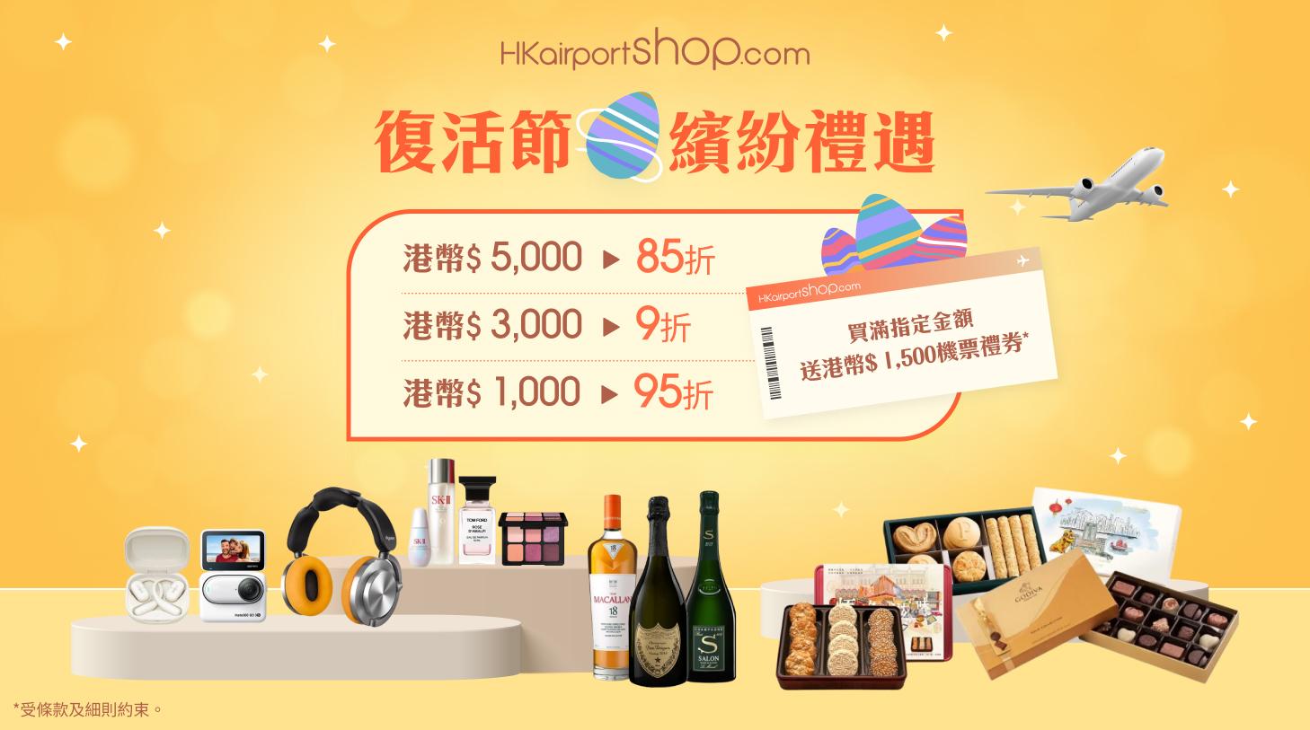 HKairportShop.com網上商店同步推出限時折扣,單一消費滿$1,000享95折、滿$3,000享9折,滿$5,000更可尊享85折優惠。無論是入手國際品牌潮流單品,還是預訂珍稀佳釀,都能以至抵價滿載而歸。今個復活節,不妨把握機會大購物。