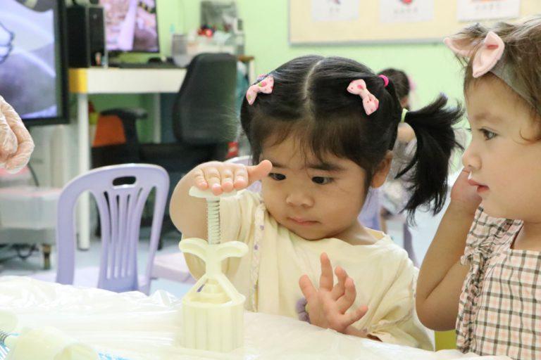 近年流行「自由遊戲」教學法,小朋友可自由探索預先準備的各種材料,訓練他們的小肌肉及開發感官。周校長將自由遊戲引入學校,每星期讓學生感受不同材料帶來的感官刺激。採訪當日,學校為學生預備咖啡粉、冰塊、雞蛋殼及黏土等材料,N班學生穿上圍裙自由探究不同材料。校長表示,自由遊戲除了刺激學生感官外,亦是好機會讓老師了解學生性格,例如學生喜歡將顏料塗上身體上,反映他性格較封閉,所以會讓顏料遮蓋自己。