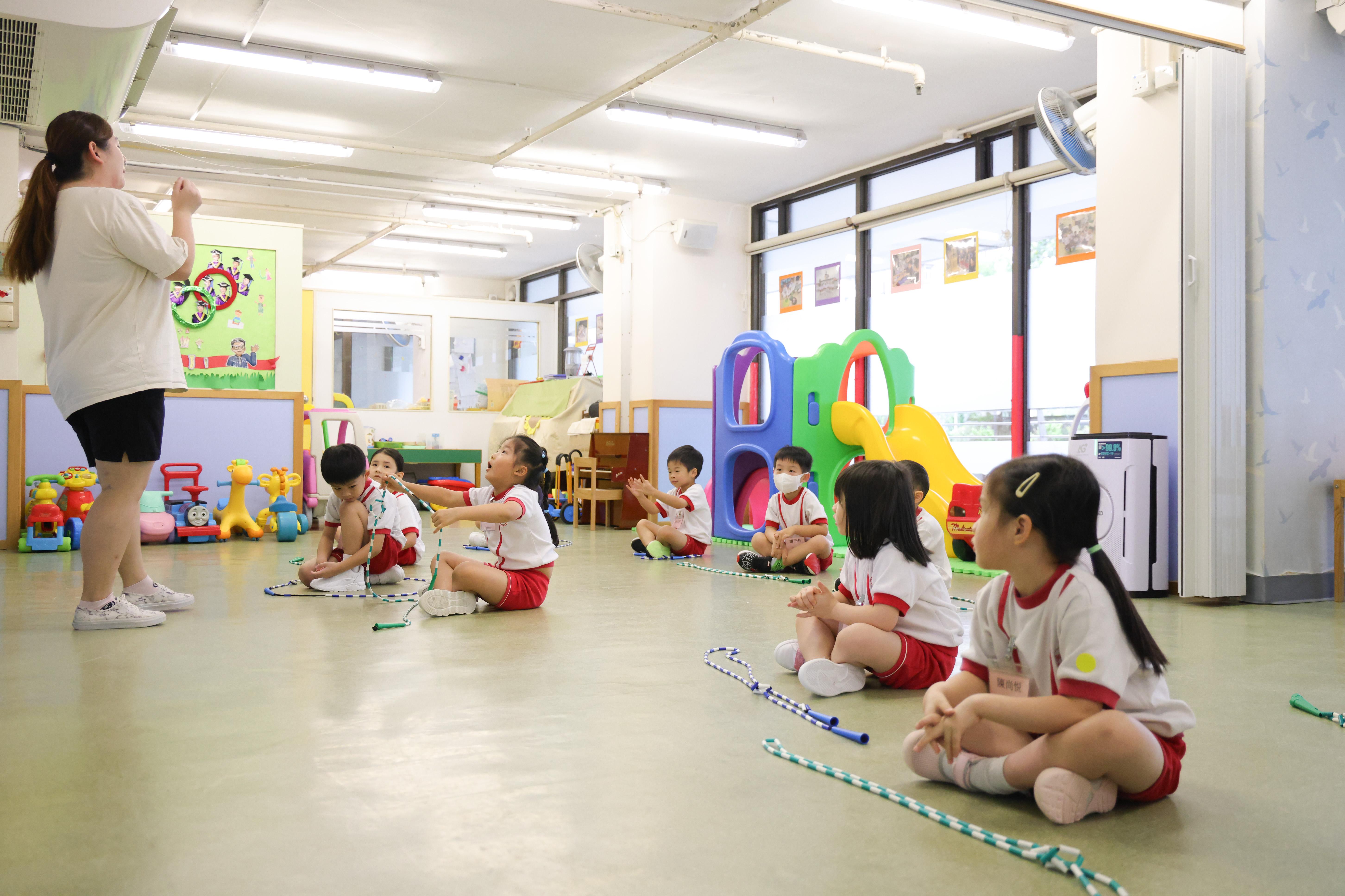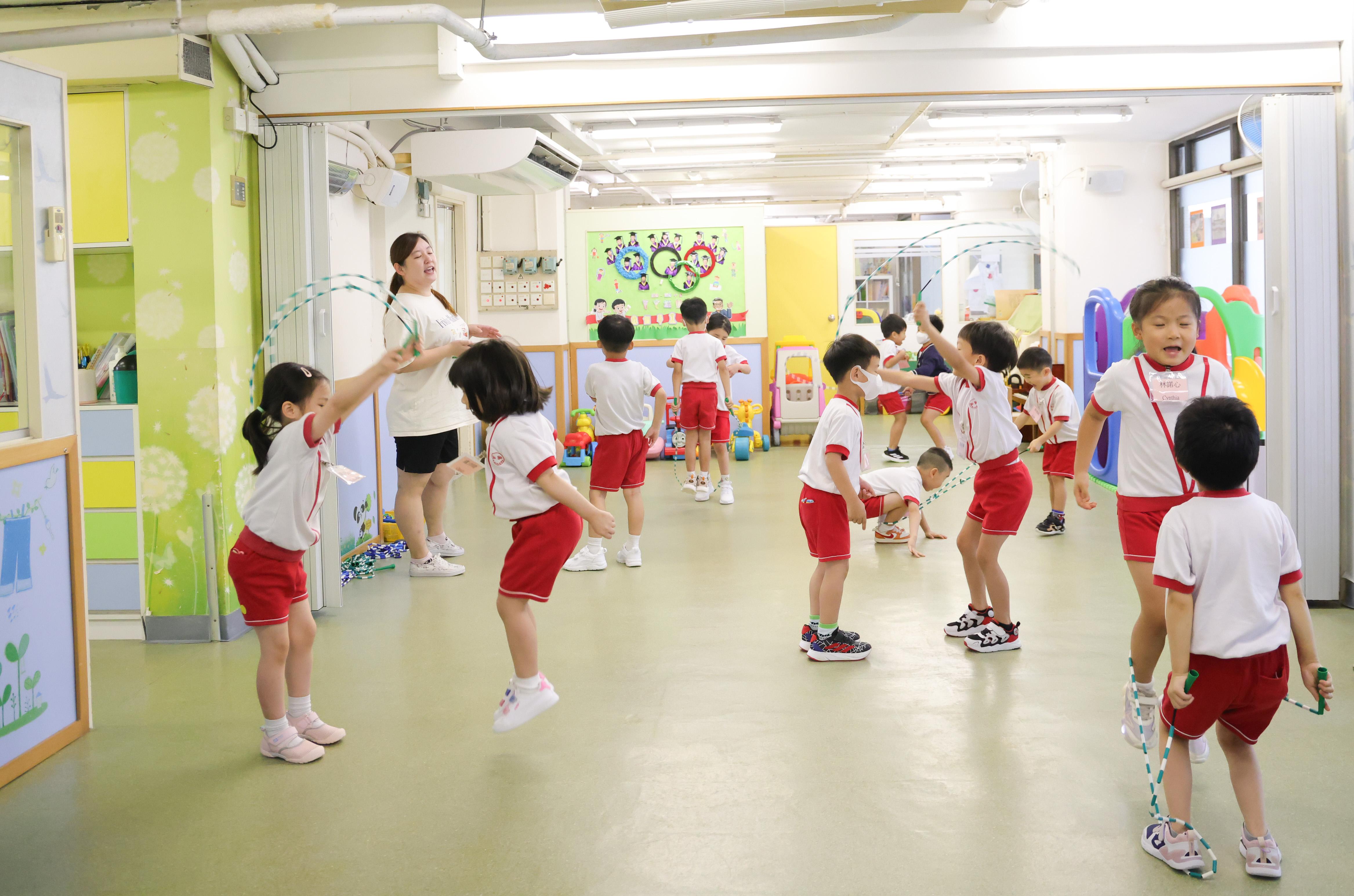 鄭校長對學生體能的關注,全因他曾任離島區學校校長,他發現離島區與市區的學生體能發展上亦有明顯差別,因為離島學生通山跑,但市區學生通常就近上學,出門便坐車,所以體能上有差別。於是幼稚園特別於校外聘用專業教練教學生花式跳繩。許多人誤以為花式跳繩對幼稚園學生太難掌握,但鄭校長認為跳繩可幫助學生增強體能,所以堅決在課程內加入花式跳繩。記者當日在現場所見,學生都跳得有板有眼,甚至嘗試雙人跳繩,打破不少人對幼稚園學生的陳舊觀念。