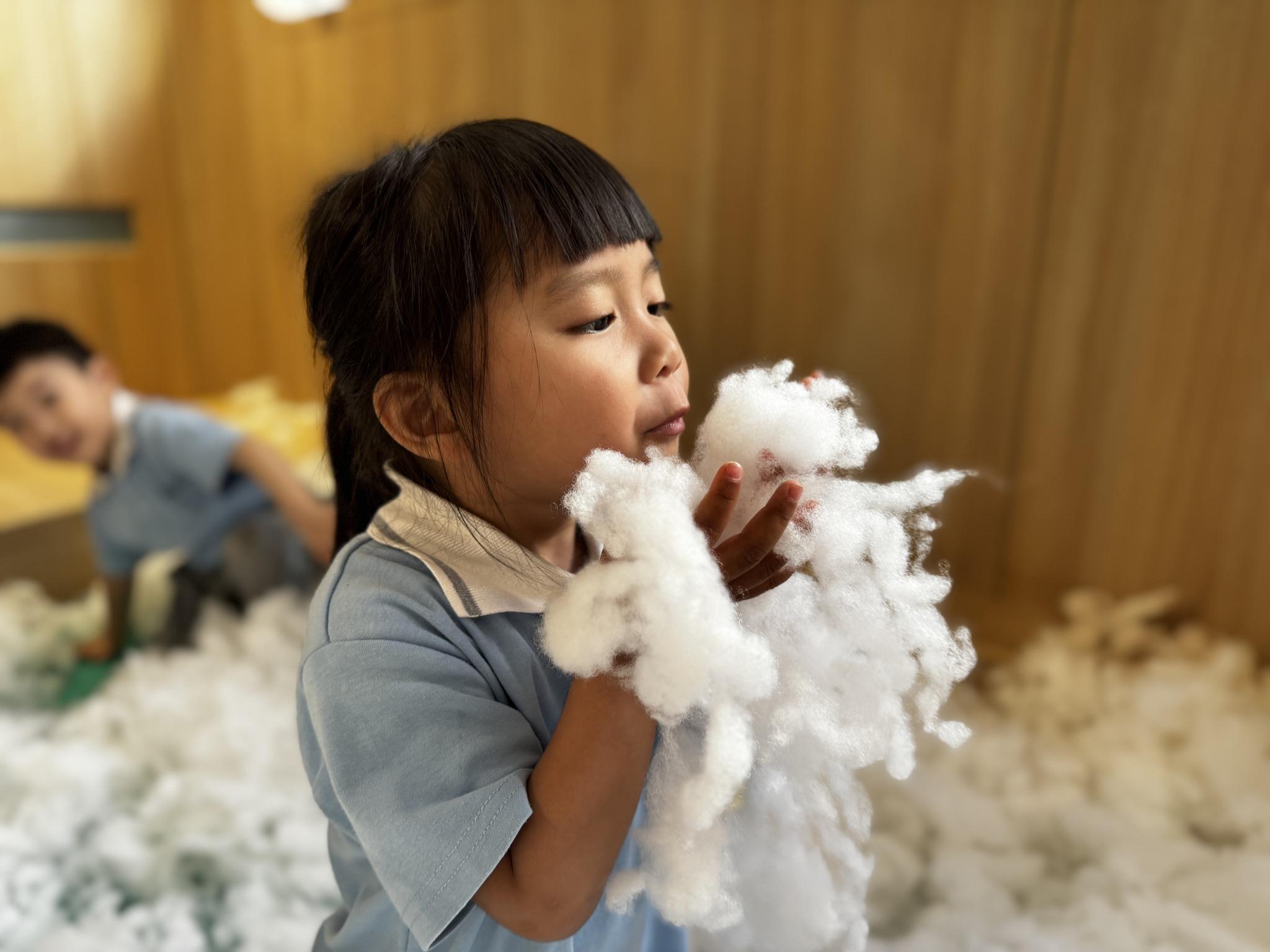 老師按照學生的能力,安排相應的活動讓他們參與。K1學生先用泡泡型沐浴露及棉花感受雲朵的輕盈柔軟,再利用泡沫剃鬚膏親手製作自己的雲朵;K2幼兒就用彩色透明片創作,他們將自己想象中天空會有的事物放在作品中,例如雲上的滑梯、汽車、棉花糖及遊樂場等。 最後K3孩子選取他們喜歡的天空相片,創作一個屬於自己的獨特故事。