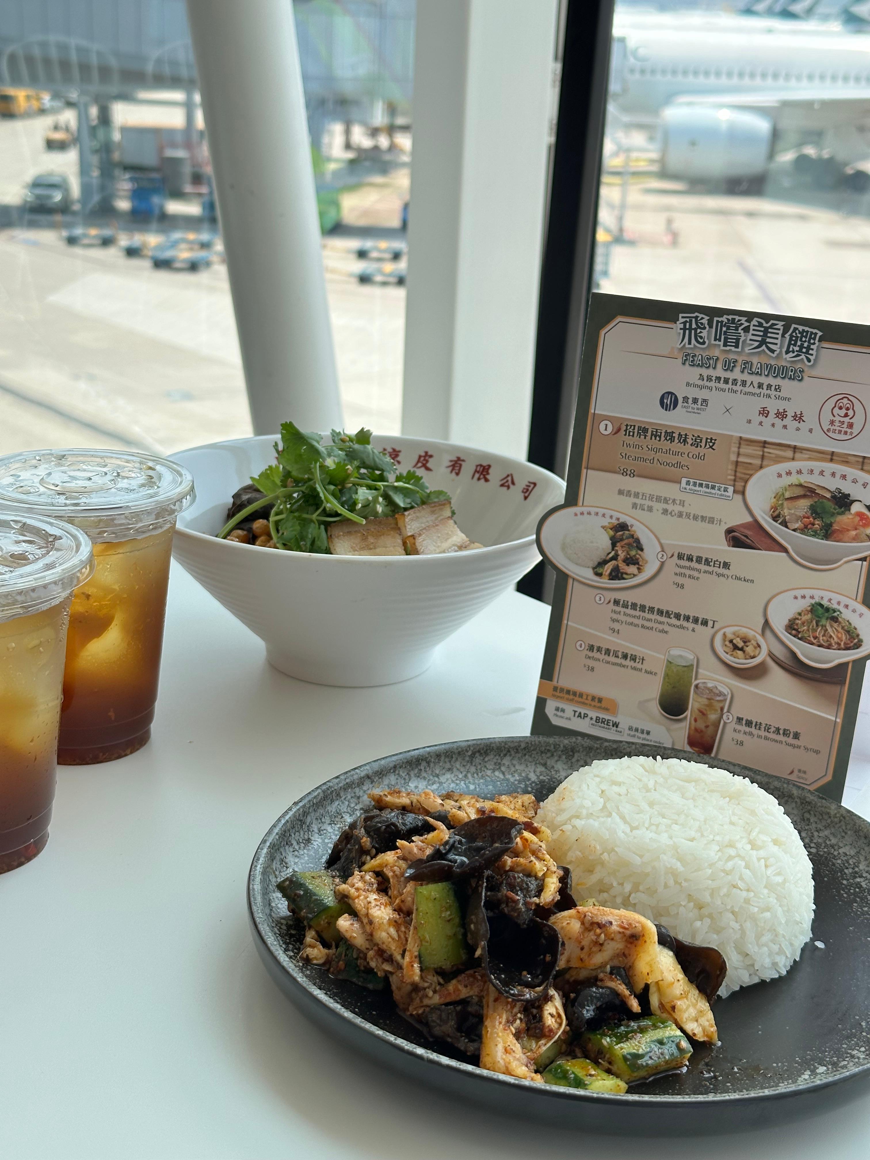 今次「兩姊妹涼皮有限公司」為「飛嚐美饌」期間限定企劃打響頭炮,將其人氣美食帶到機場。店舖所有醬汁均由店主親自研發和調配,「招牌兩姊妹涼皮」煙靭嫩滑,配上集麻、香、辣於一身的秘製醬汁,令客人食過返尋味!機場限定店必食「極品擔擔撈麵配嗆辣蓮藕丁」($94),醬汁香濃惹味,麵條彈牙掛汁,配以大熱配菜嗆辣蓮藕丁,辣得過癮。「椒麻雞配白飯」($98)亦是皇牌產品,無骨雞肉淋上獨家配方椒麻醬汁,肉質滑嫩,吃起來啖啖肉,加入口感爽脆的青瓜、爽彈低卡的木耳,層次豐富。另外還有清爽解膩的「清爽青瓜薄荷汁」 ($38) 和香甜爽滑的「黑糖桂花冰粉蜜」 ($38),同樣值得一試!