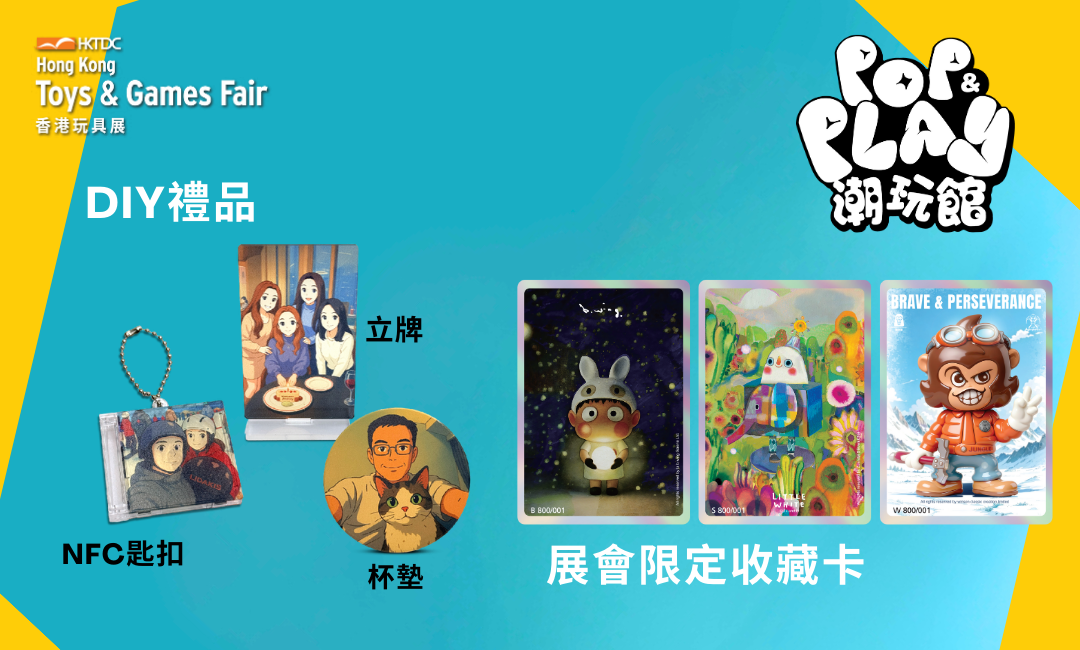 大會邀得知名設計師為「潮玩館」設計三款限量收藏卡,全球僅發行 800 套。參觀者只要於現場玩扭蛋遊戲便可抽到其中一款收藏卡,禮品數量有限,極具紀念意義。不可錯過「AI魔法變身」拍照體驗,運用先進AI技術,訪客拍照後可即時變身成多種奇幻或潮玩角色,生成獨特的社交媒體分享素材。另設「專屬紀念品DIY」工作坊,訪客可親手創作個人化的潮玩紀念品,留下獨一無二的回憶。