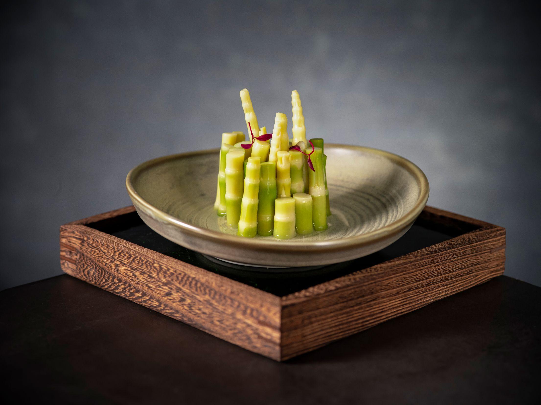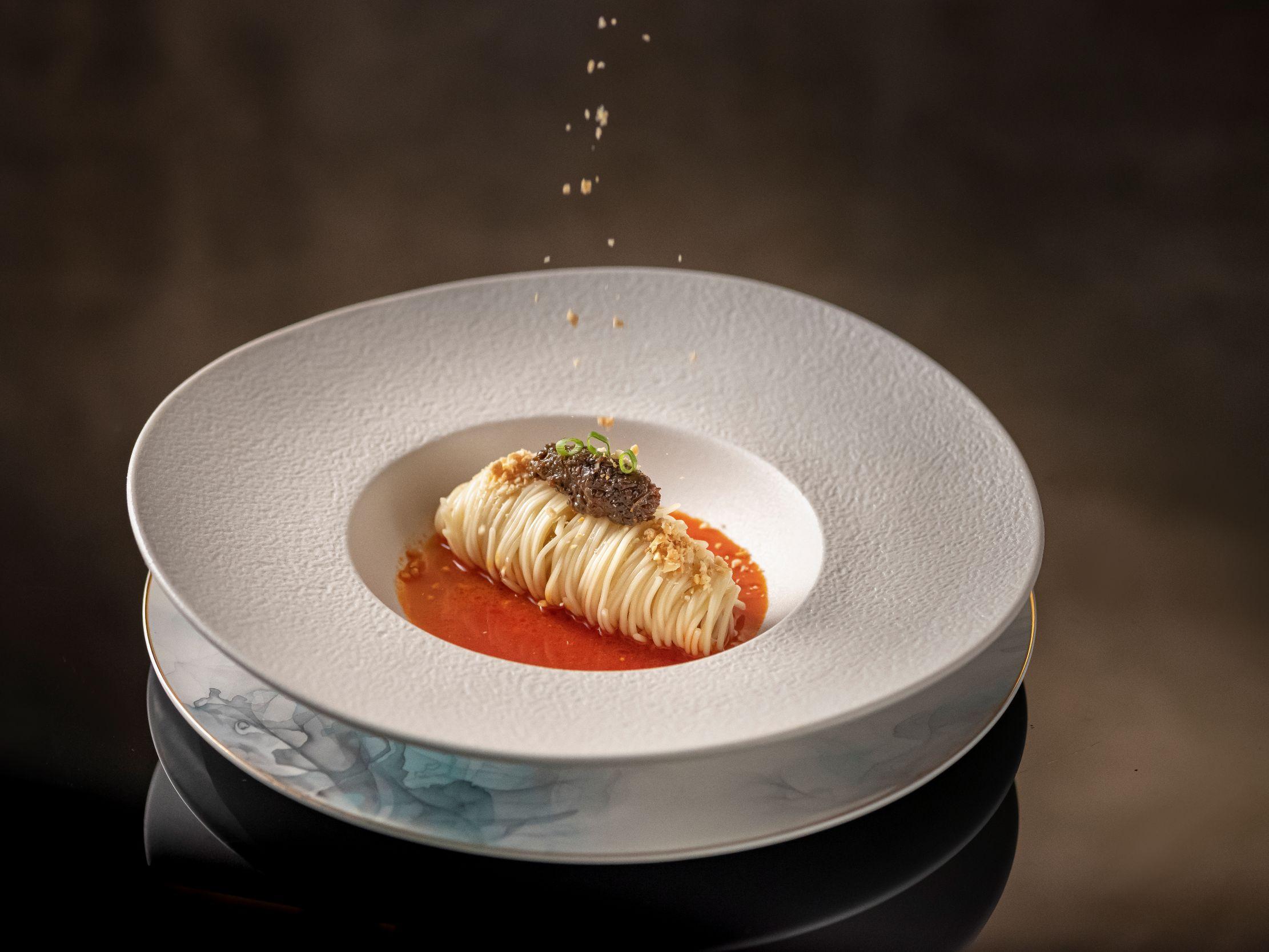 今次四手聯乘提供單點菜式及四手聯乘菜單,大家不妨直接享用完整菜單,深入體驗兩位師傅的功架與巧思。前菜先有冷盤紫蘇玉女瓜及桂花蜜脆鱔,清新爽口,在夏季讓人倍感開胃。隨後有鮮嫩的客家風味手撕雞,以及溫潤細膩的酸蘿蔔湯過橋蚌仔,層次豐富令人回味。菜單味道層層遞增,黃金蟹盒及麻辣小龍包展現粵菜精緻風格與川味元素的和諧交融,濃郁而鮮味,海南黄椒醬蒸星斑球為經典海鮮增添熱帶鮮亮風味,滿載驚喜。壓軸獻上的烈焰竹炭和牛肋肉煙燻香氣撲鼻,現代演繹大膽創新;天府擔擔麵更是承襲川味精髓,香氣四溢。最後菜單以茉莉花生酪和酥皮雪燕杏仁蛋撻作結,兩款甜品同樣甜而不膩,餘韻悠長。