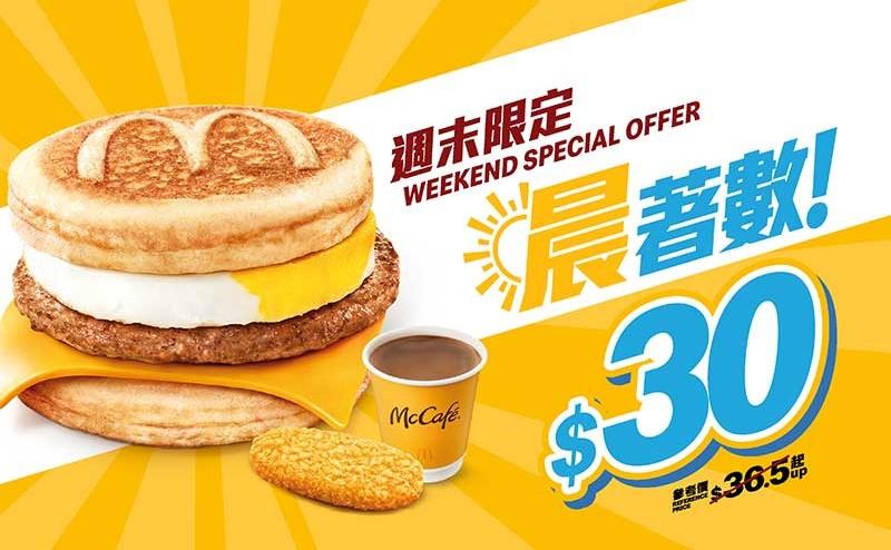 而在9月6至7日亦有$30周末限定「晨」著數。熱香餅精選套餐帶來三塊熱香餅、惹味豬柳和薯餅的完美組合;日本McGriddles楓糖班戟豬柳蛋漢堡亦是人氣必食,招牌楓糖班戟配上豬柳、芝士和雞蛋,濕潤鬆軟的口感讓人回味無窮!所有限時早餐套餐優惠均配有金黃脆薯餅及採用100%「雨林聯盟認證」house blend咖啡豆的金獎咖啡McCafé熱即磨黑咖啡,為早晨注入滿滿活力!