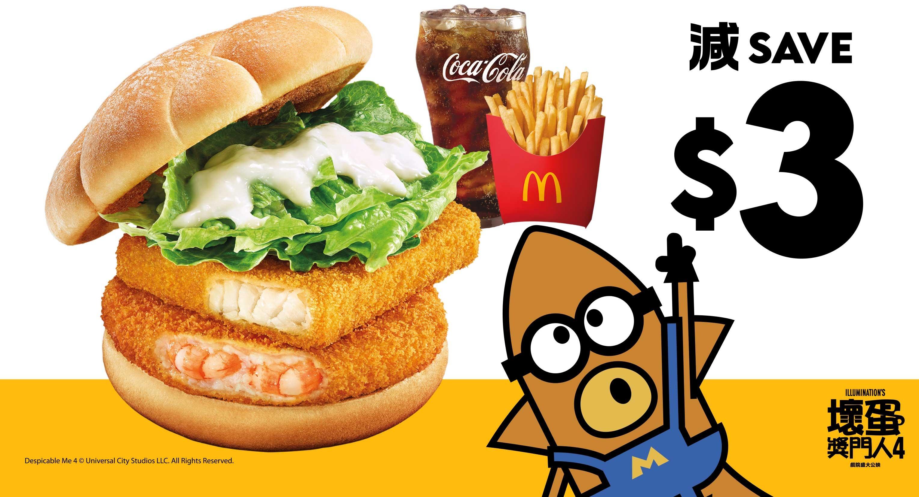 超人氣「蝦堡系列」再次強勢登陸麥當勞,由明天(6月12日)起,麥當勞聯乘萬眾期待的《壞蛋獎門人4》電影角色迷你兵團 (Minions) ,帶來經典蝦堡、菠蘿蝦堡和 Double滋味的魚柳蝦堡,而深受歡迎的Shake Shake薯條調味粉亦會回歸,聯同大熱夏日甜點——香蕉朱古力批、芒果OREO麥旋風和McCafé Double芒果冰雪等美食,齊齊迎接美味歡樂暑假。
