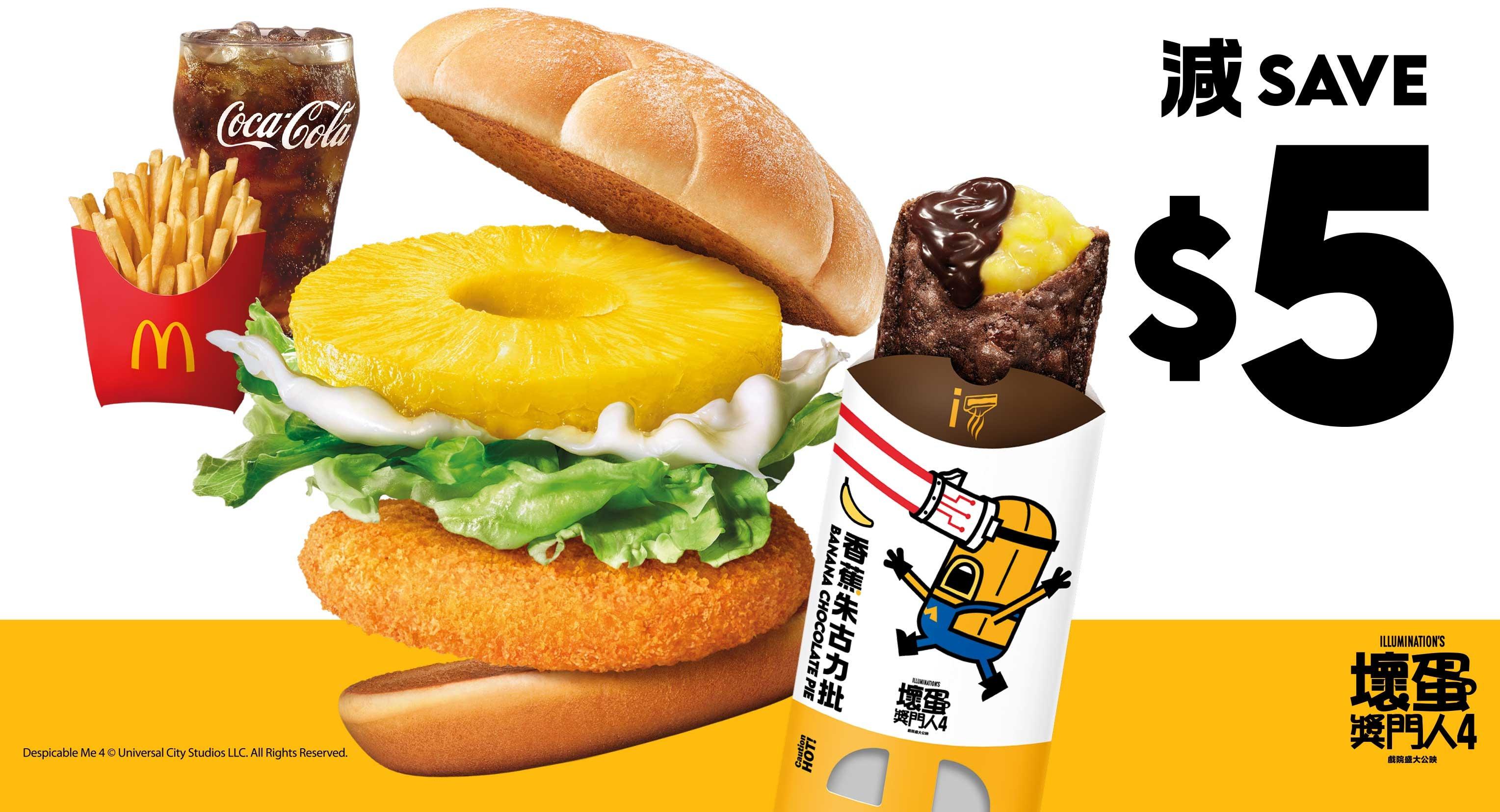 6月12日起,除了滋味蝦堡超值套餐以$39笑蝦蝦價登場,麥當勞App亦會推出一系列電子優惠券,包括「菠蘿蝦堡或魚柳蝦堡超值套餐減$3」以及「菠蘿蝦堡或魚柳蝦堡四道菜套餐配香蕉朱古力批減$5」。美味一餐想以甜品作結,可以選擇「$11香蕉朱古力批」或「$17芒果麥旋風」,或享用McCafé限定優惠「Double芒果冰雪減$3 」,與迷你兵團度過Sweet Summer。