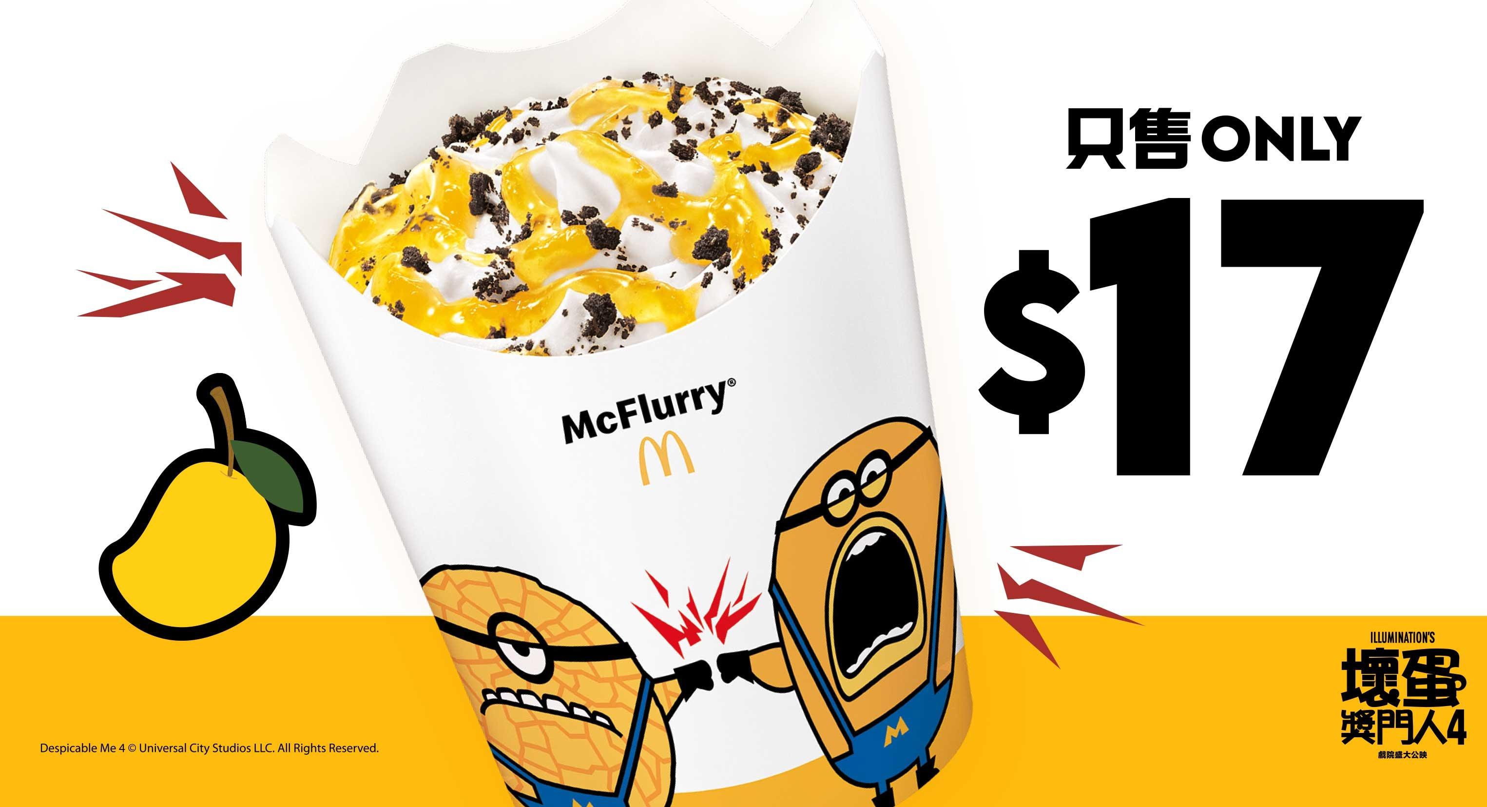 迷你兵團更帶來多款期間限定美食:蝦堡最夾的配搭Shake Shake薯條亦驚喜回歸,櫻花蝦味調味粉帶有香濃櫻花蝦香味;熱帶菠蘿特飲加入原塊清甜多汁菠蘿,喝一口即帶來恍如置身海邊吹起陣陣涼風的感覺。夏日滋味少不了甜品:香蕉朱古力批同步強勢回歸,酥脆的朱古力批包裹著熱辣辣的香蕉果蓉和朱古力醬;芒果麥旋風則以雲呢拿新地為基礎,加上香濃芒果醬及OREO曲奇碎混合而成,絕對是夏日的最佳選擇。