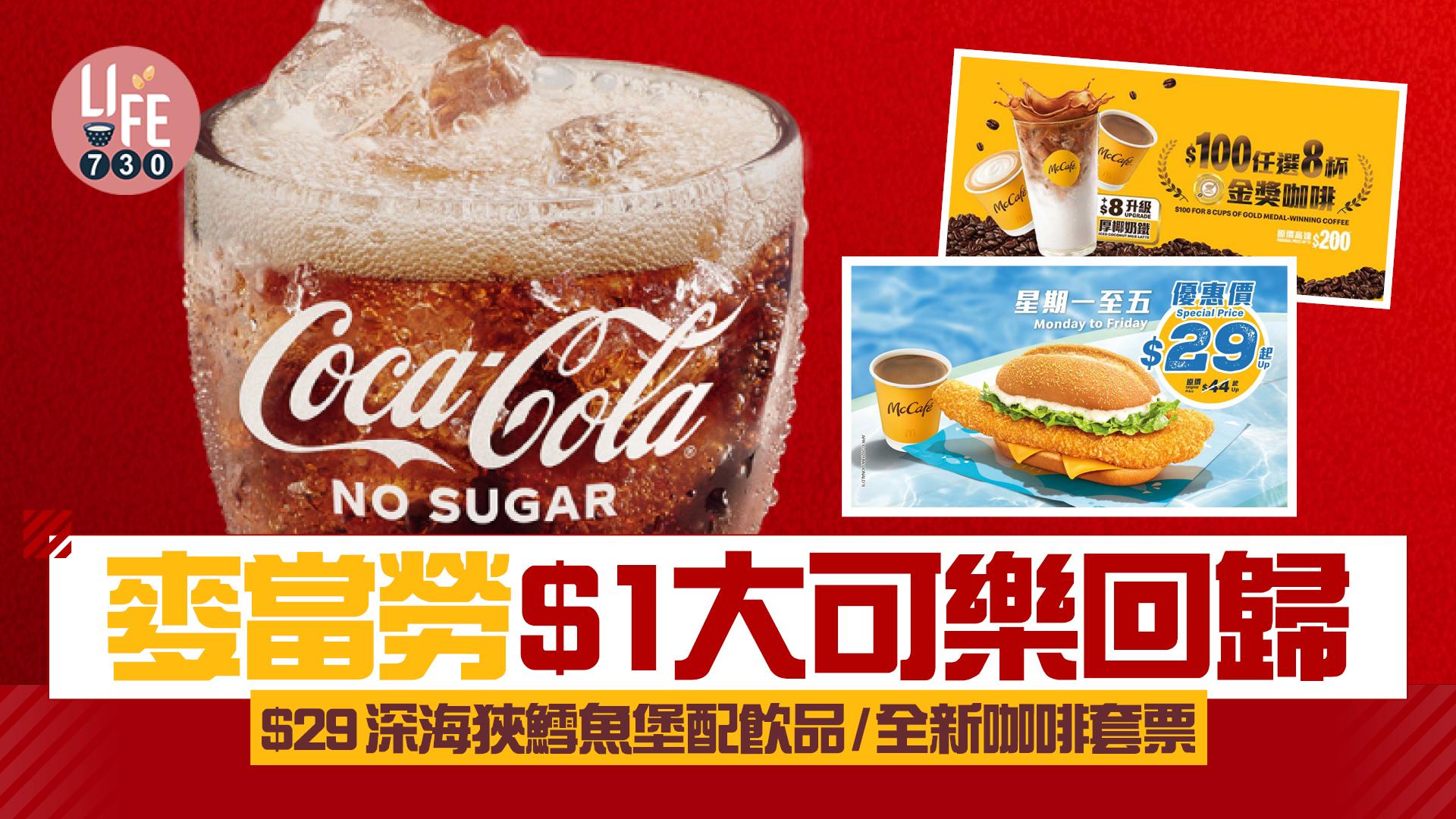麥當勞$1大可樂回歸 為DSE考生打氣!$29深海狹鱈魚堡配飲品/全新$100/8杯咖啡套票