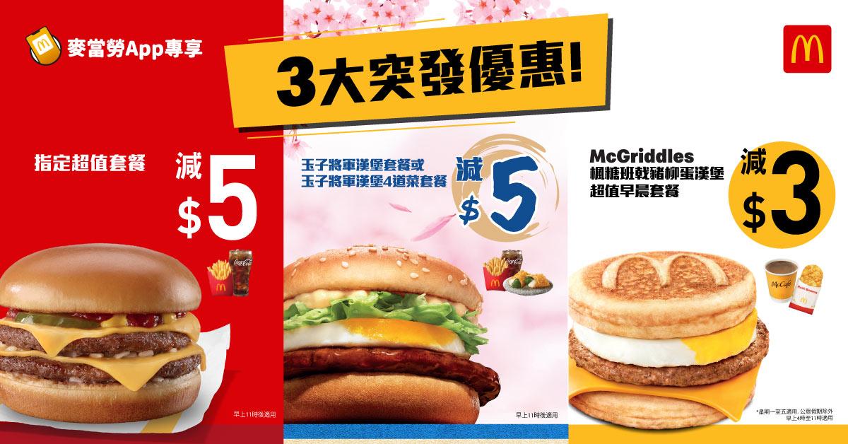 麥當勞App為大家帶來最新3大驚喜優惠,包括選購指定超值套餐減$5、玉子將軍漢堡套餐減$5,以及 McGriddles 早晨套餐減$3 優惠,讓大家早午晚都可以歎盡麥當勞美食!