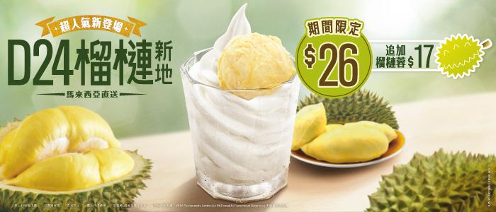 全新D24榴槤新地嚴選由馬來西亞直送的D24榴槤,以幼滑香甜的雲呢拿新地搭配啖啖真.D24榴槤果肉的榴槤蓉,讓滿滿濃郁香氣在口腔內縈繞;新地與榴槤蓉兩者搭配拼湊出順滑香甜的Creamy口感,絕對是令人一試愛上的滋味。期間限定的D24榴槤新地,將以優惠價$26於全線麥當勞甜品站發售,而追加D24榴槤蓉只需$17,最多可以追加1次。夏日限定滋味數量有限,售完即止,大家屆時可到麥當勞Facebook專頁查看附近餐廳的存貨量,把握機會品嚐這份甜蜜驚喜。