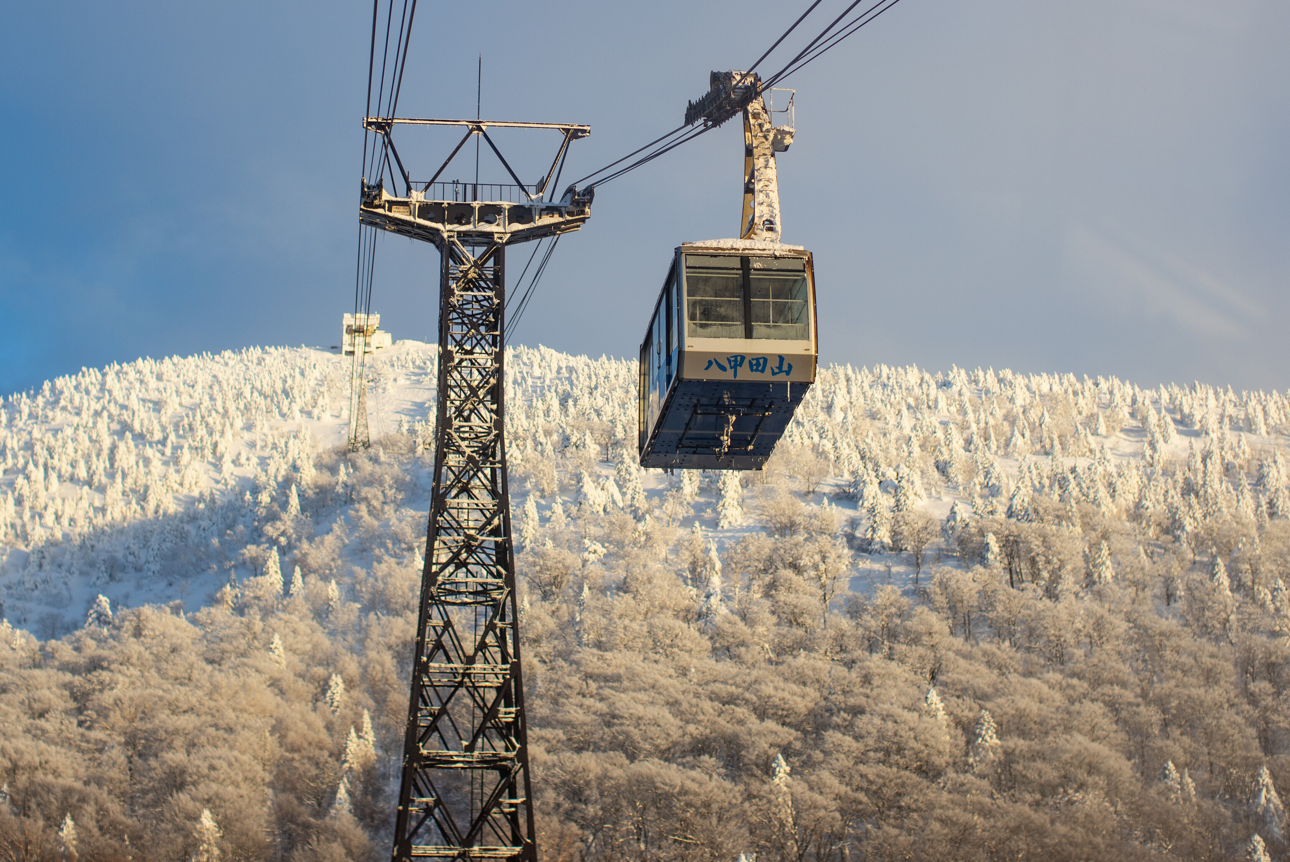 八甲田山位列日本百大名山,由多座火山組成,主峰大嶽海拔1585米。冬季1月至2月下旬期間,可在這裡欣賞世界稀有的自然奇景「樹冰」。層層積雪與冰霜堆疊在八甲田的青森冷杉上,形成氣勢非凡的「雪怪」部落。 搭乘八甲田山纜車僅需10分鐘,於車程中足以飽覽一望無際的山脈與樹冰景色,有如進入夢幻雪國仙境。