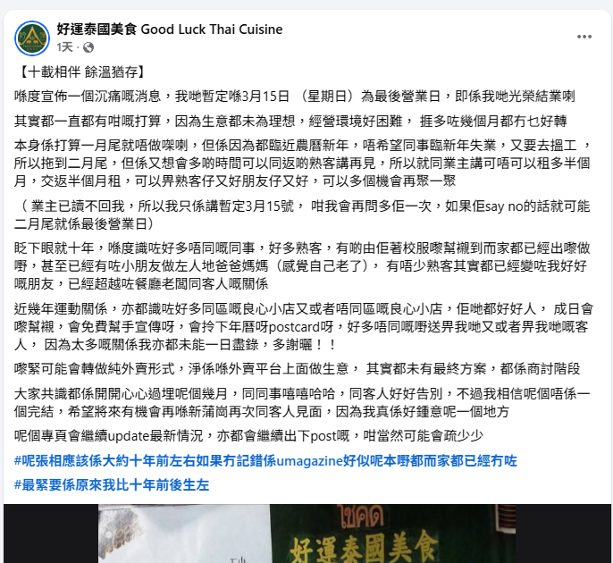 在新蒲崗屹立了十個年頭、走親民價路線的泰菜小店「好運泰國美食」,日前在官方Facebook帖文表示因經營環境困難,生意未如理想,沉痛宣布結業,即將營業至315日。