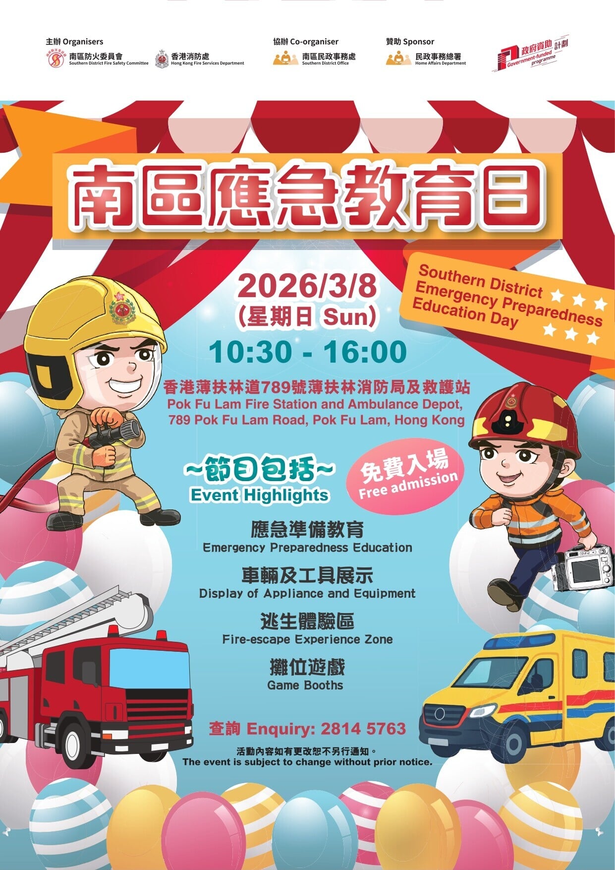 家長和小朋友可參與多項活動,包括應急準備教育、車輛及工具展示、逃生體驗區及攤位遊戲等,節目相當豐富。