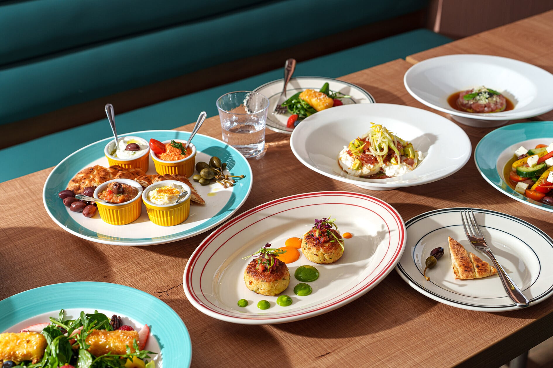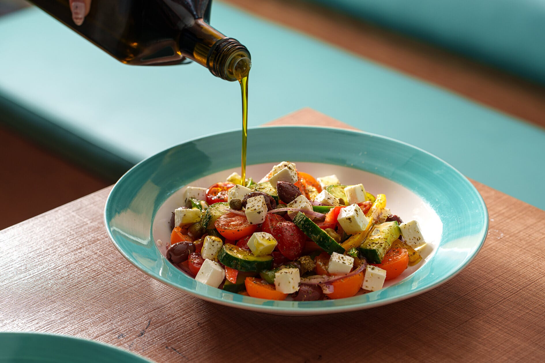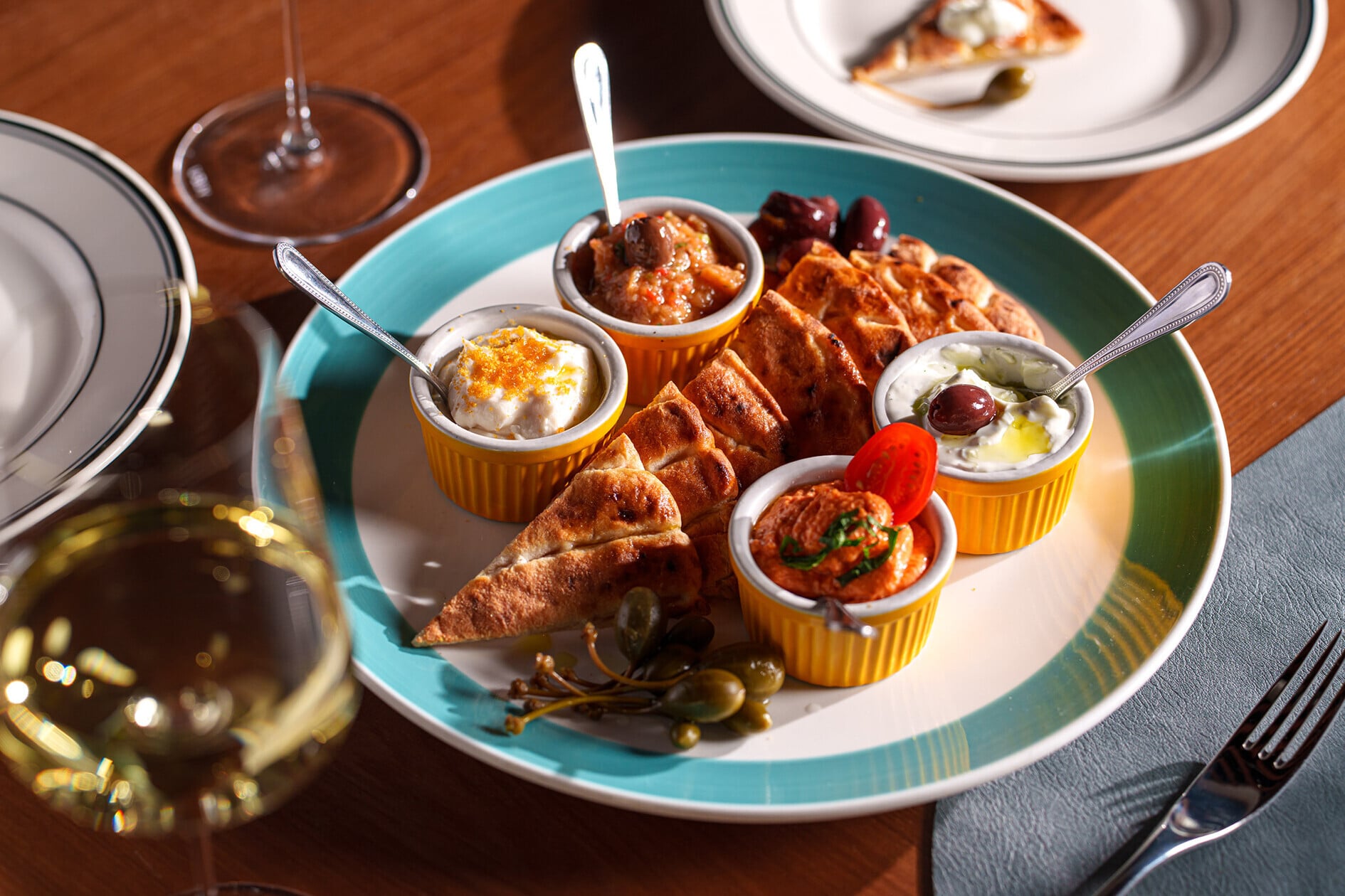 海鮮是希臘料理不可缺少的元素,常以蒜、橄欖油與香草輕輕調味。蒜香烤大蝦、炭烤魷魚、招牌蟹餅佐以海膽醬與羅勒醬,注入愛琴海的陽光與海洋氣息。Chef Panos有超過15年熟成經驗,精準掌握溫度與時間,將時令魚進行乾式熟成,抽走魚肉多餘水分和腥味,令魚味更濃重。想味蕾全面體驗希臘風情,就要嘗一嘗自家製四款經典希臘醬料,包括橄欖醬、酸奶黃瓜醬、鱈魚子檸檬醬、帶煙熏香氣的烤茄子醬,配上溫熱皮塔麵包,開胃非常。