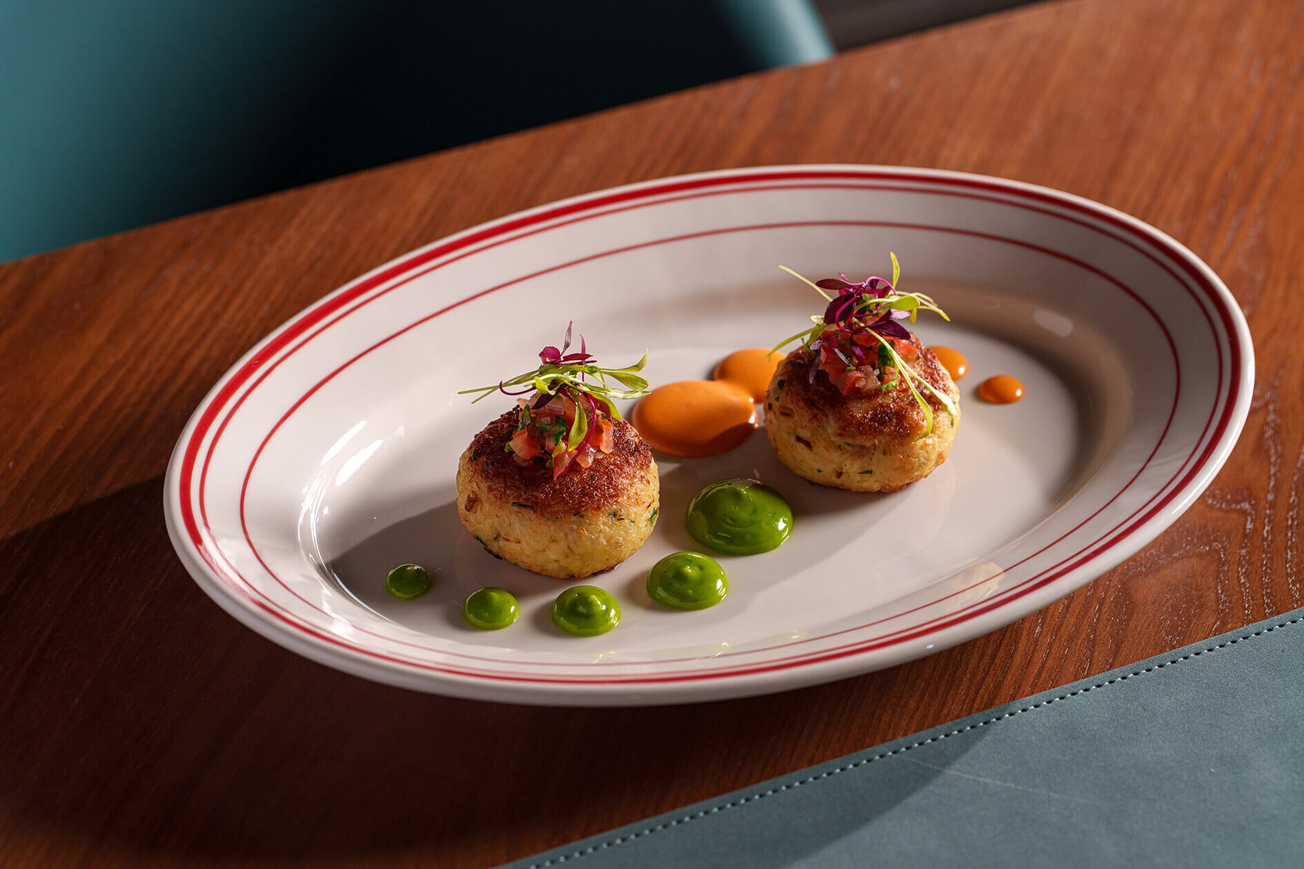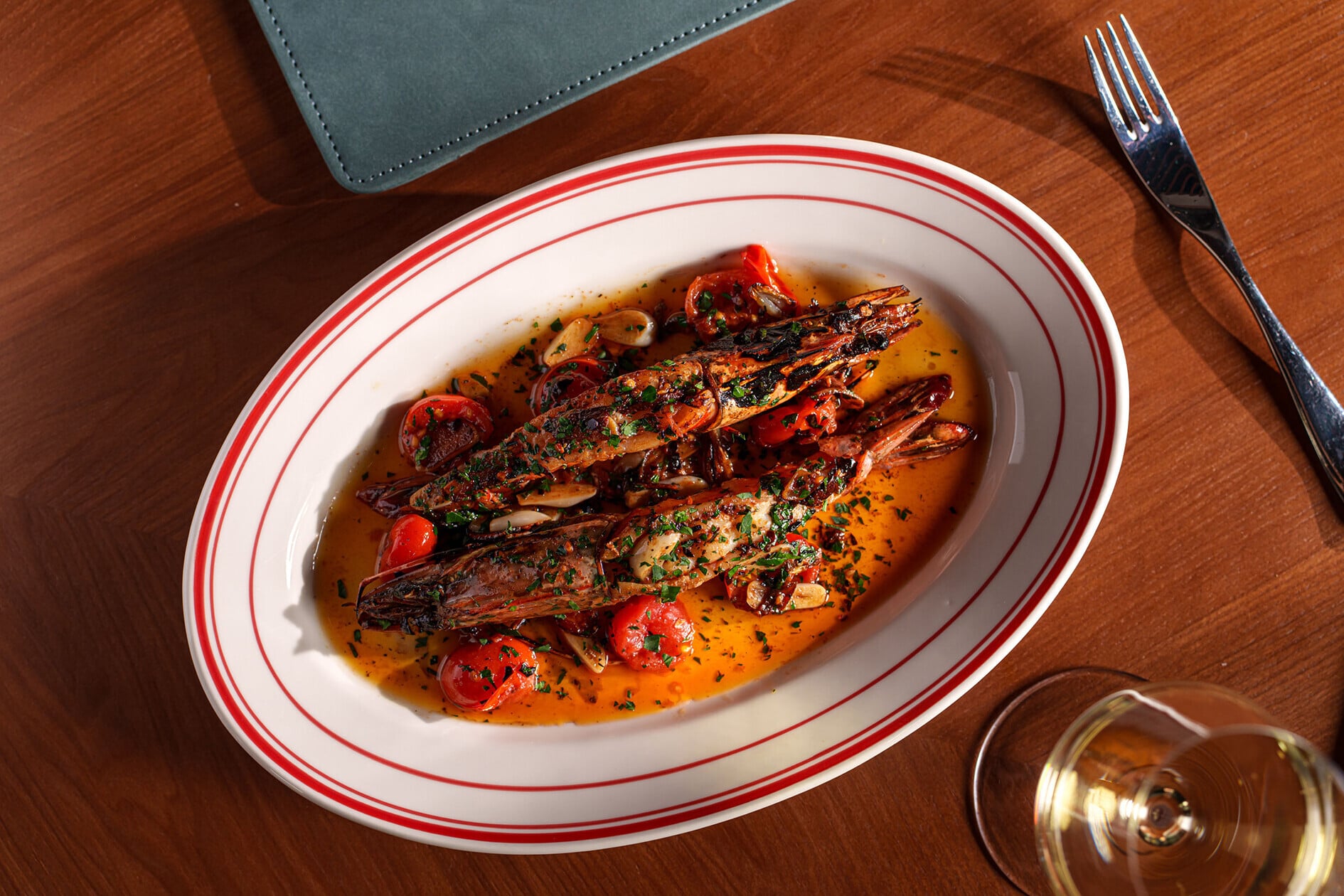 Panos Signature Crab Cakes, Sea Urchin and Basil Sauce 招牌蟹餅海膽羅勒 Greek Salad, Horiatiki 經典希臘沙律 King Prawns with Garlic, Chili and Olive Oil 蒜香烤大蝦配橄欖油 Grilled Calamari, served with Eggplant, Cherry Tomatoes and Balsamic Cream 烤魷魚佐茄子泥與香醋奶油