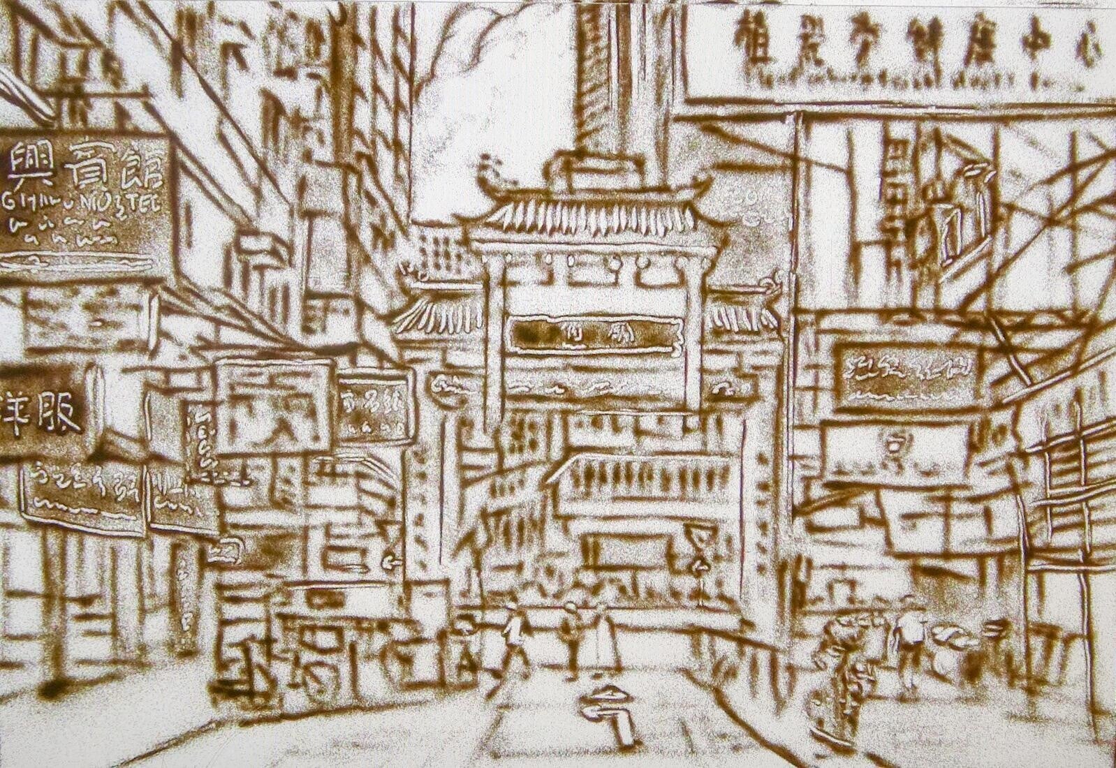 這次《城市。尋光》裡出現的城市風景,包括怪獸大廈(海山樓)、廟街、石板街、彩虹邨等。鍾雪並非以寫實方式描繪地標,而是捕捉身處其中的感受與情緒,如人與人之間的真實互動、不同社區獨有的生活節奏,以及城市中不經意流露的溫度,這些被被忽略的細微瞬間,鍾雪透過沙與光,重新呈現於觀眾面前。