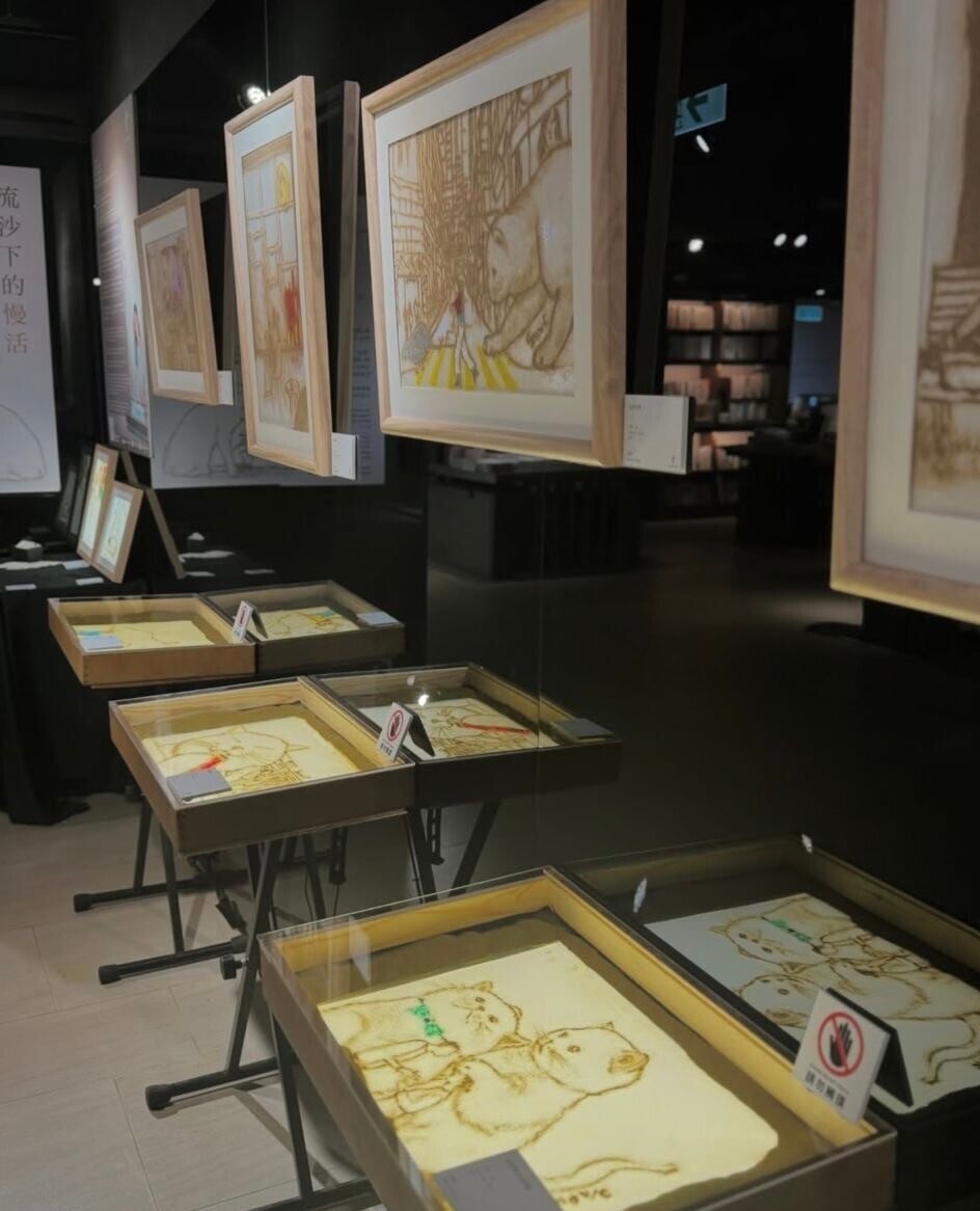 主展區內,除15幅沙畫作品外,亦展出多件與創作相關的實物,包括藝術家在不同地區創作時接觸到的人與物,如彩虹邨小朋友的氣球、大美督街坊分享的食物;這些日常而真實的物件,與沙畫一同構成作品的敘事層次,提醒觀眾生命中看似瑣碎的片段,同樣值得被記錄。「沙影。尋光」展區,則是一個在環境漆黑的沙之光影空間,配合由音樂創作人葉肇中的原創音樂,引導觀眾進入沒有指引的感知狀態。藝術家刻意保留詮釋空間,邀請觀眾自行聯想與感受,讓觀賞變成一場探索。