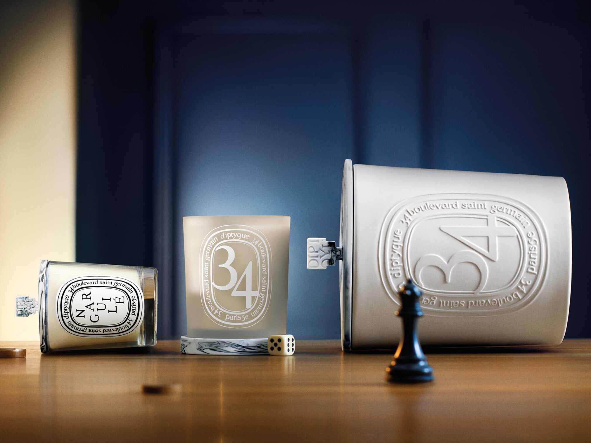 秉承Diptyque一貫圖像美學,是次瓶身設計邀請合作插畫家Gianpaolo Pagni創作裝飾圖案,靈感源自創辦人早期的家居布藝作品。瓶身圖案與Orphéon及其藍色柱子的慶祝精神相呼應,後者如今仍佇立於Saint-Germain-des-Près(聖日耳曼德佩區)的精品店。瓶身裝飾畫及香膏外盒背面,繪製了三個風格獨特的人物輪廓,正是向三位創辦人的低調致敬。