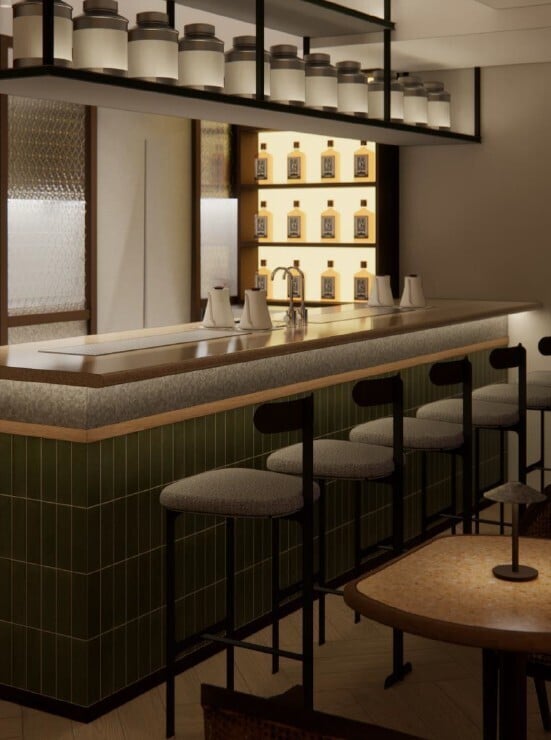 一樓餐廳以琥珀色與木系素材為主調,氣氛溫潤舒適;吊燈造型如蓋碗,象徵茶葉沖泡成茶湯的轉化過程。二樓則為多用途活動空間,以胡桃木與柔和燈光營造沉穩禪意,用作茶席、評茶教學及日後不同形式的跨界活動。