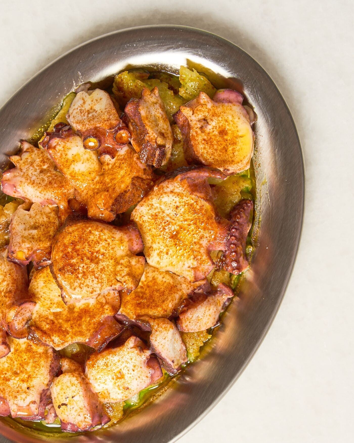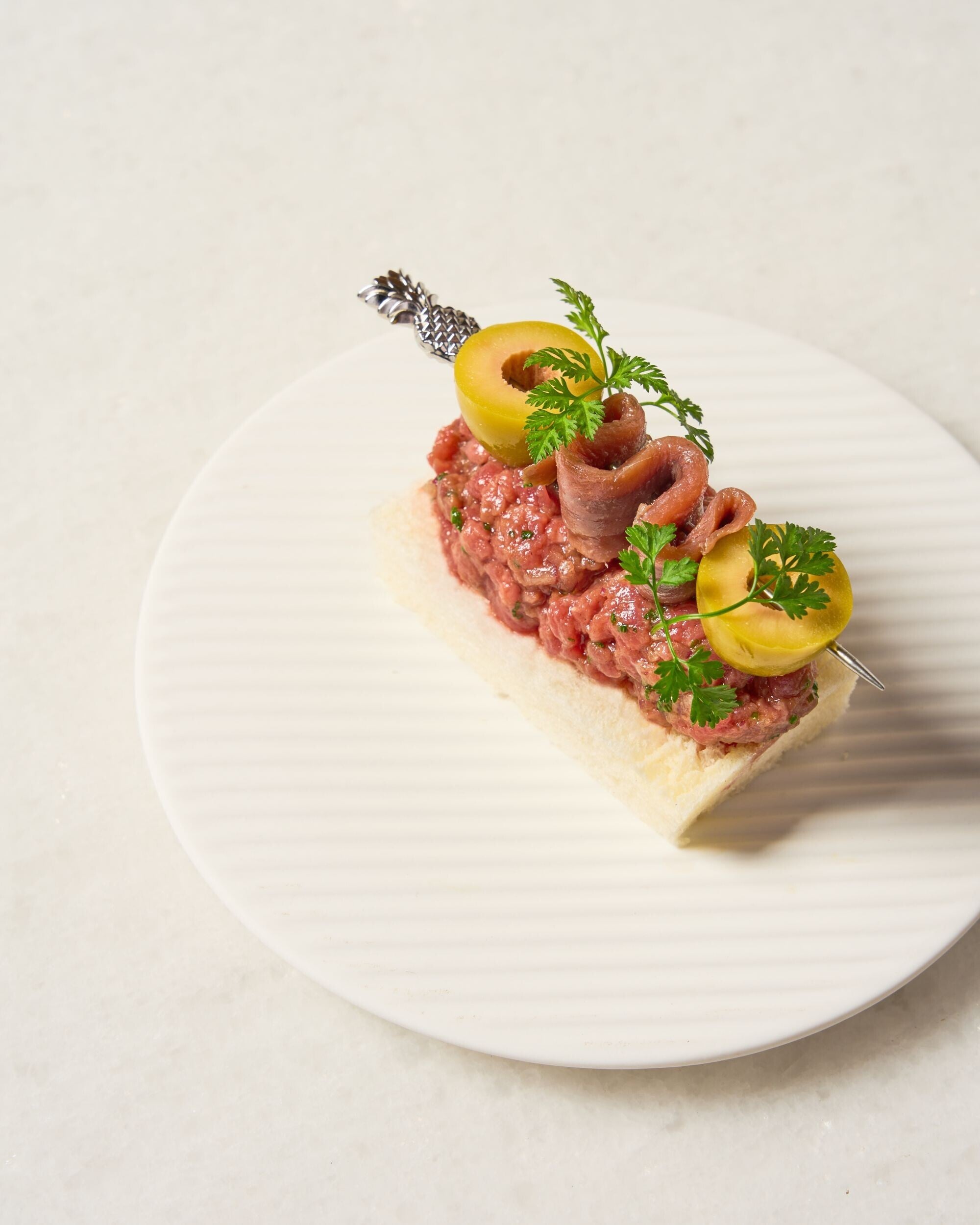 以西班牙食材製作的tapas,推介西班牙牛肉乾伴法包,用了西班牙直送的上乘風乾牛肉作餡料,鹹香的牛肉與輕盈鬆化的法包相互配合。西班牙紅蝦薄片配松子仁及特級初榨橄欖油擺盤精緻,清甜鮮爽,入口滿載海洋氣息。西班牙火腿精選精選來自La Prudencia、以橡果飼養的伊比利亞前腿火腿,油花細緻,香氣長久;Tetilla芝士口感柔滑,如奶油般細膩。