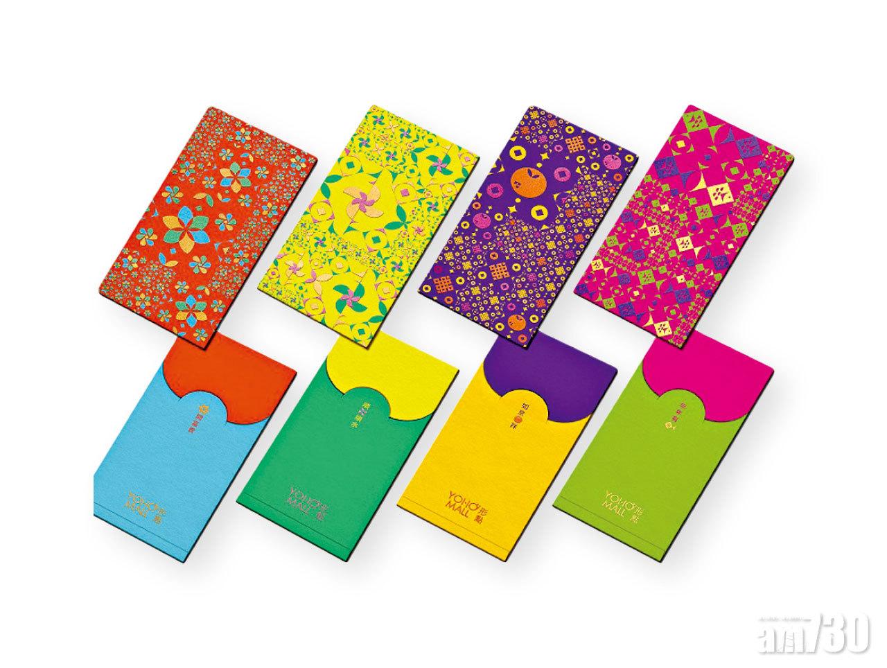 YOHO MALL以萬花筒創作一套4款利是封,拼湊幾何圖案、創新對比色調,寓意煥然一新。以電子貨幣消費滿$2,500即免費換領一套。