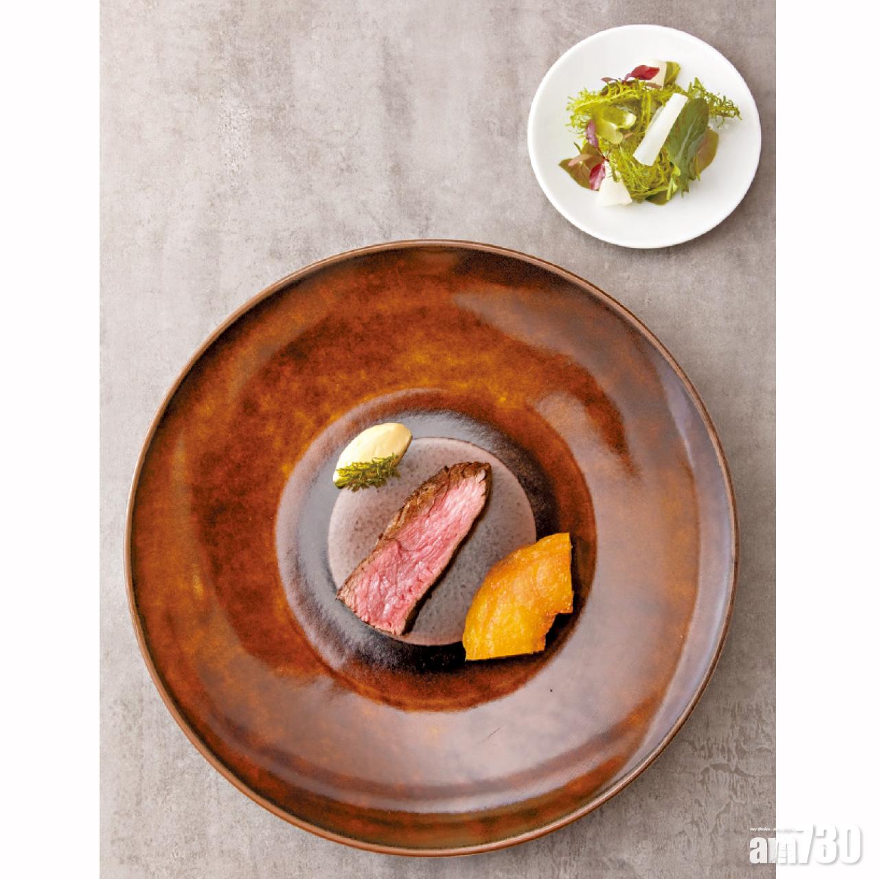 主菜是特級牛扒配法式千層焗薯及雜菜沙律,肉質細緻的Polmard牛肉,肉味香濃而不燥,油脂分布平均,令人一試難忘。