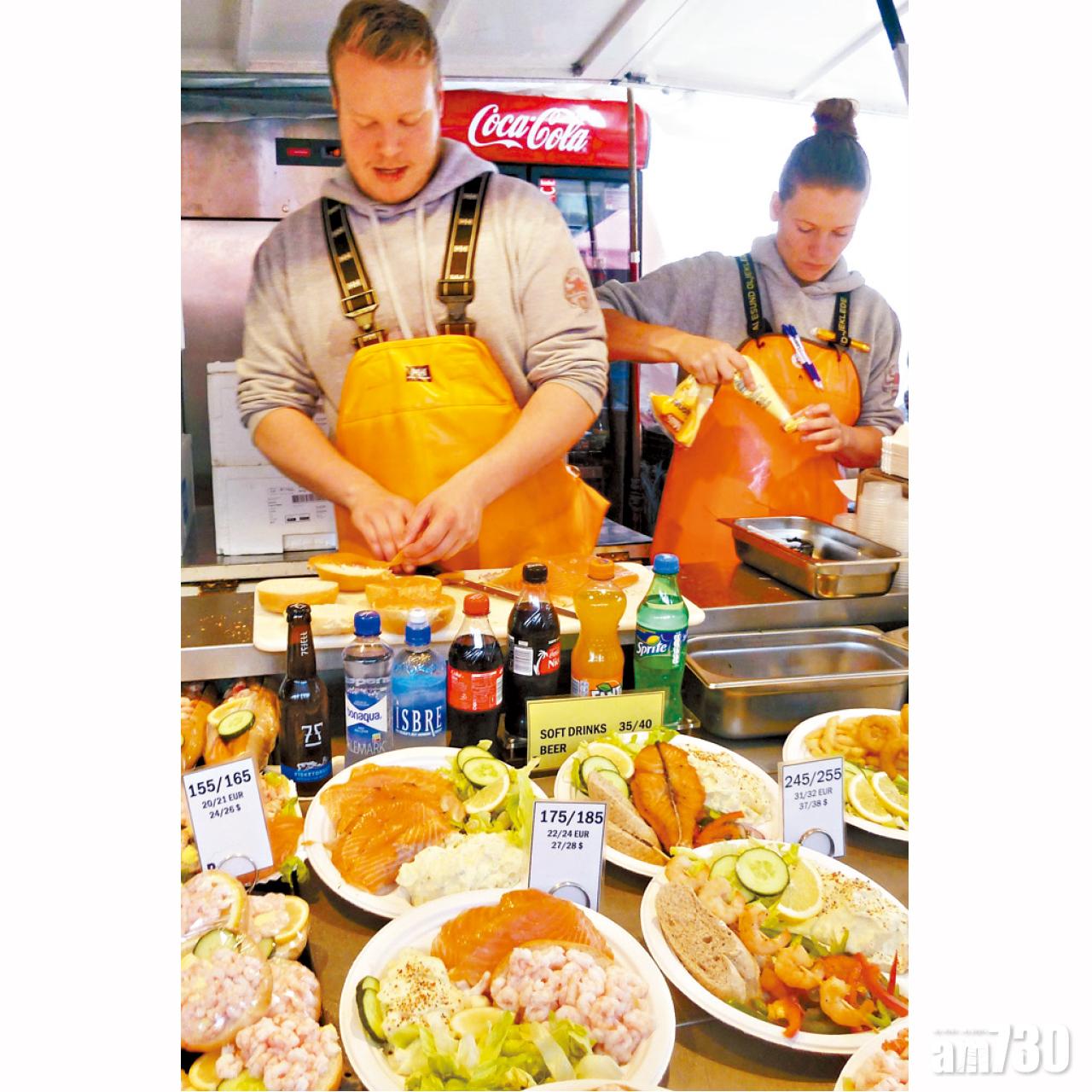 海鮮餐廳範圍營造出「大笪地」風情,周邊則是售賣地道食品的攤販,亮晶晶的新鮮魚子與香腸,都是特色美食;在現場尋尋覓覓之際,喜出望外,竟然給我遇上一位能操廣東話的員工Marco,他曾經在香港工作兩年,由他介紹魚子的品種與分級標準,資料當然最真。主要來自鮭魚的魚子,野生的與養殖的味道略有分別,顆粒大小也見不同,像橙色的珍珠,閃亮透光;此外又有黑色魚子,鹹味較重,是取自體型較小的鯡魚和池魚的,輪流品嘗,便知道有何不同。至於另一類主流食品,是香腸,同時觸發購買意欲,材料選用北歐生產的馴鹿、麋鹿及鯨魚肉,經過風乾後製成,不妨先試口味,才決定購買與否。