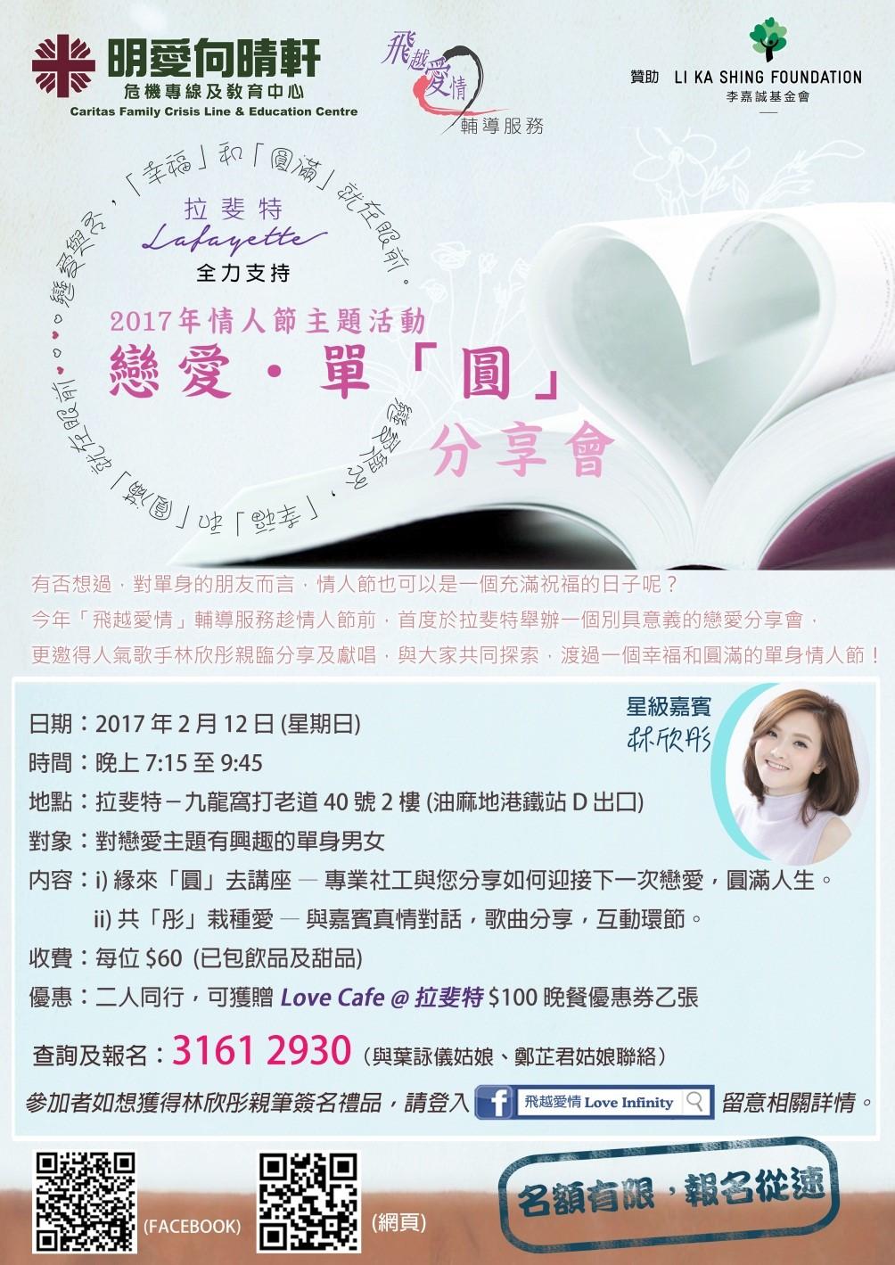 情人節明愛向晴軒「飛越愛情輔導服務」將於2月12(星期日),在於拉斐特舉辦情人節主題活動—戀愛‧單「圓」分享會。透過社工講座與參加者分享如何迎接下一次戀愛,圓滿人生。同時,人氣歌手林欣彤更會親臨現場作分享及獻唱,與大家共同渡過一個幸福和圓滿的單身情人節。